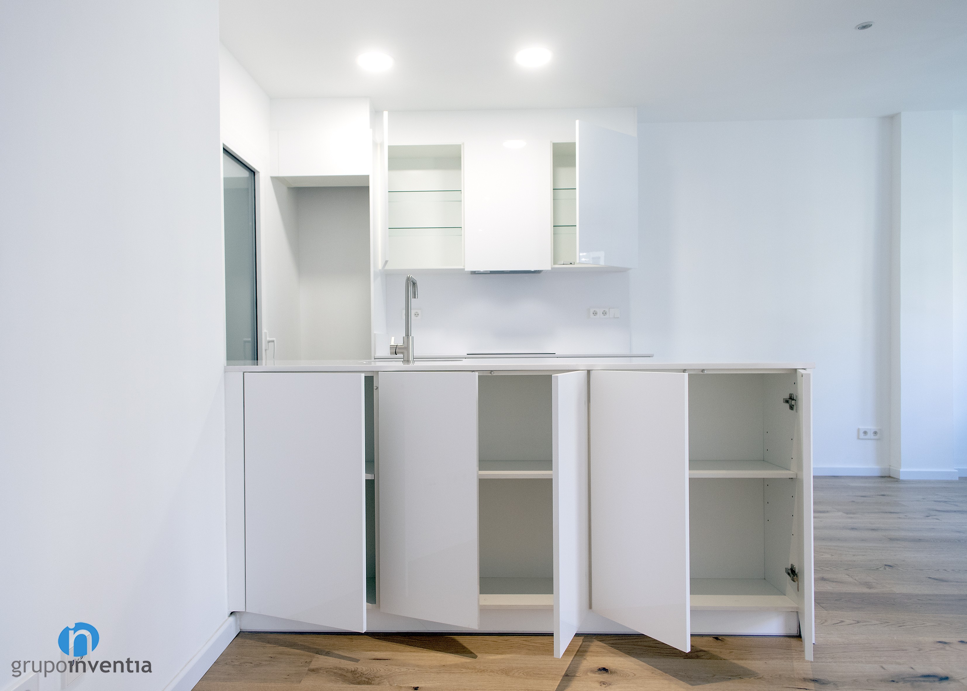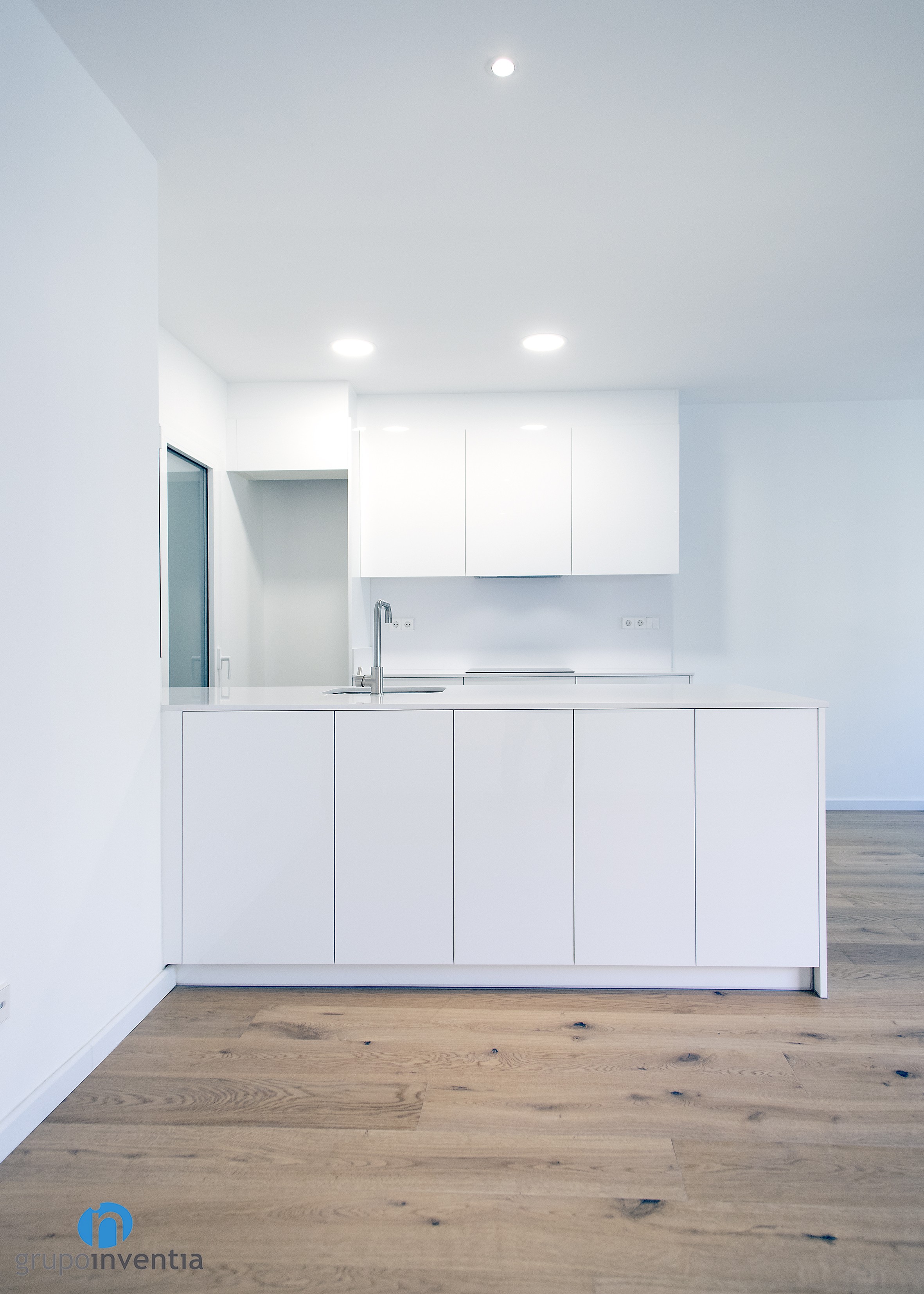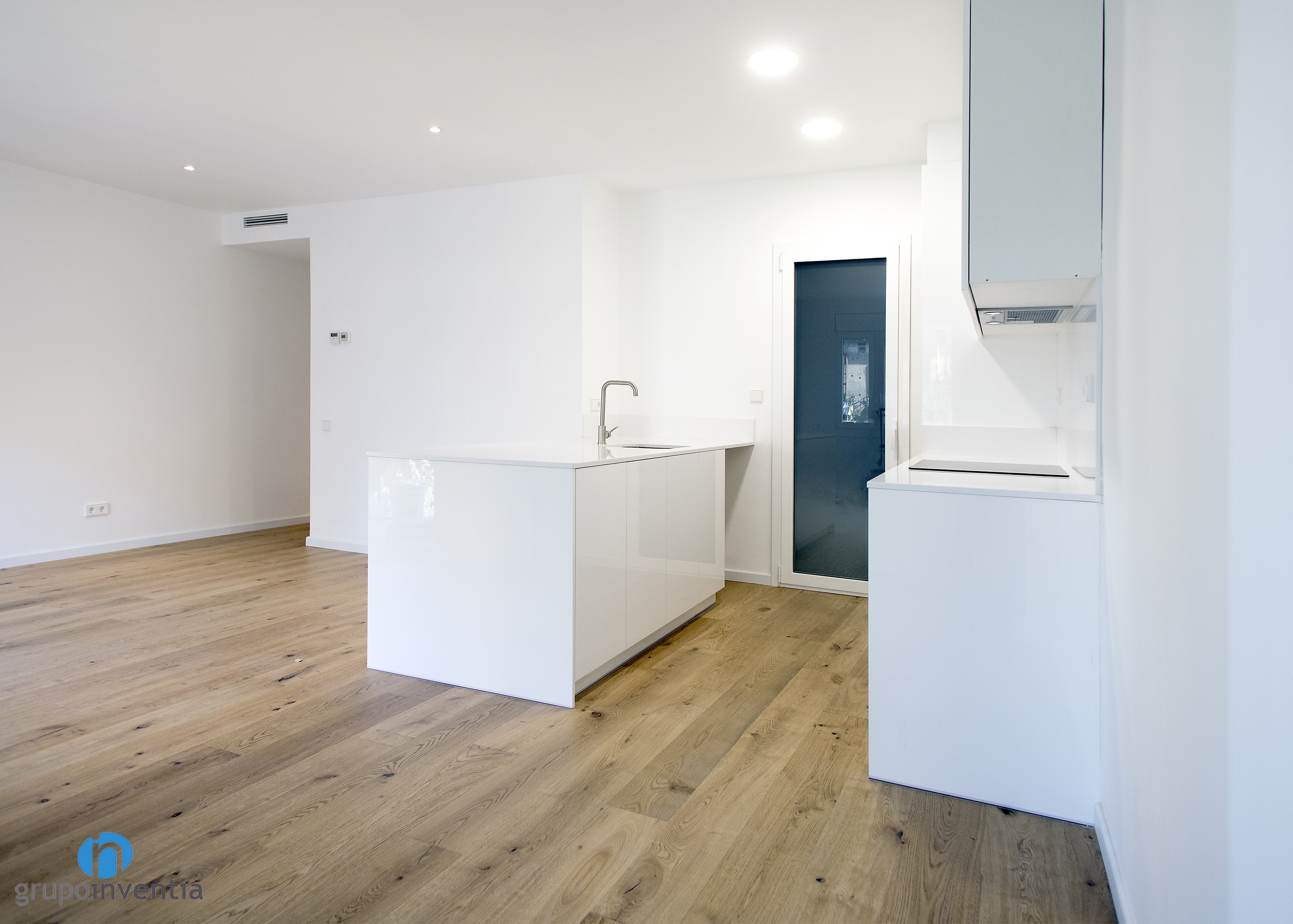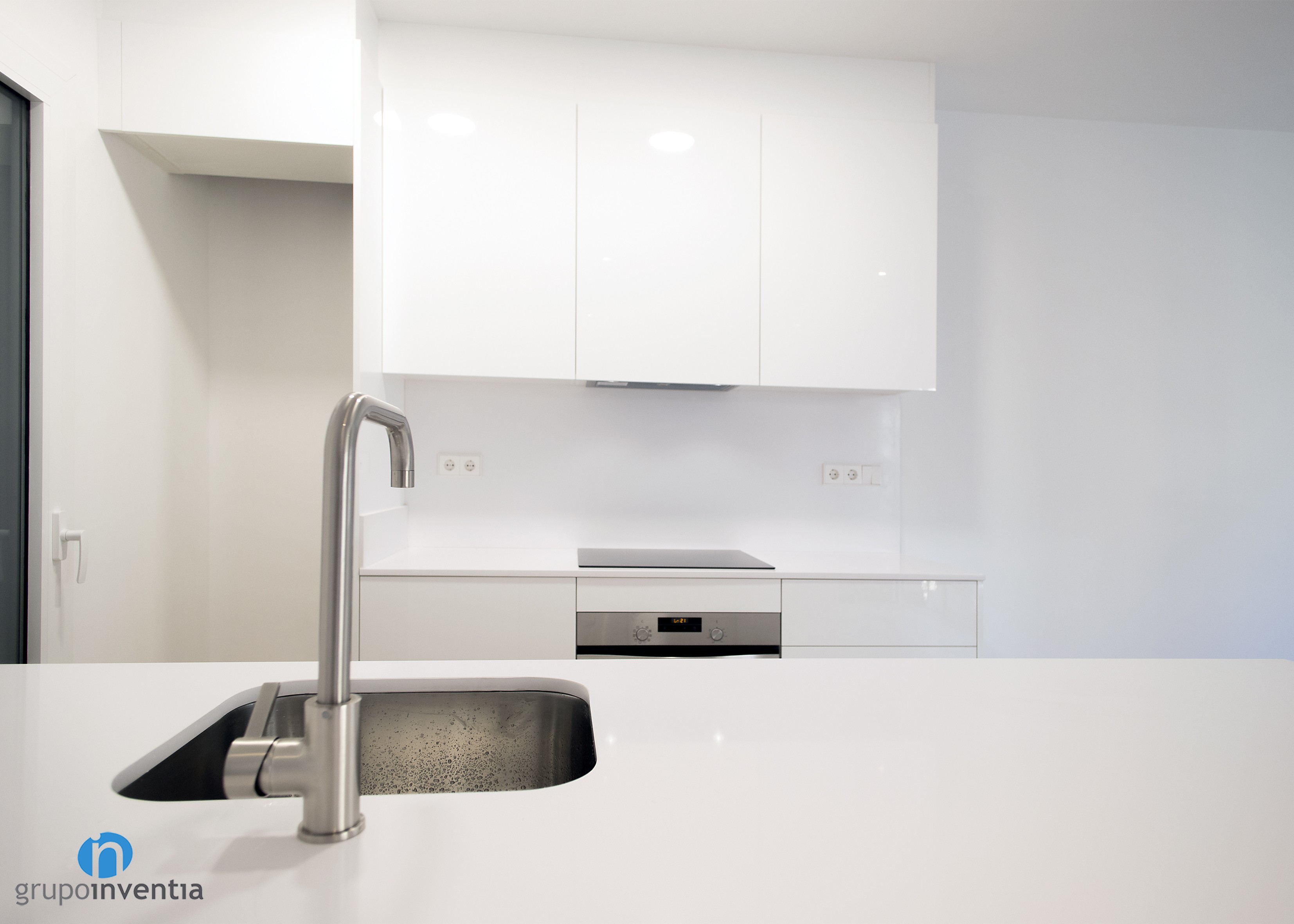 La reforma de cuina és oberta i està distribuïda a dos fronts. A la part de la paret es va col·locar un taulell equipat amb una placa vitroceràmica. Tant en la seva part inferior com superior es van col·locar armaris i calaixos per a l’emmagatzematge. A l’extrem es va disposar un buit a mida per encastar la nevera.