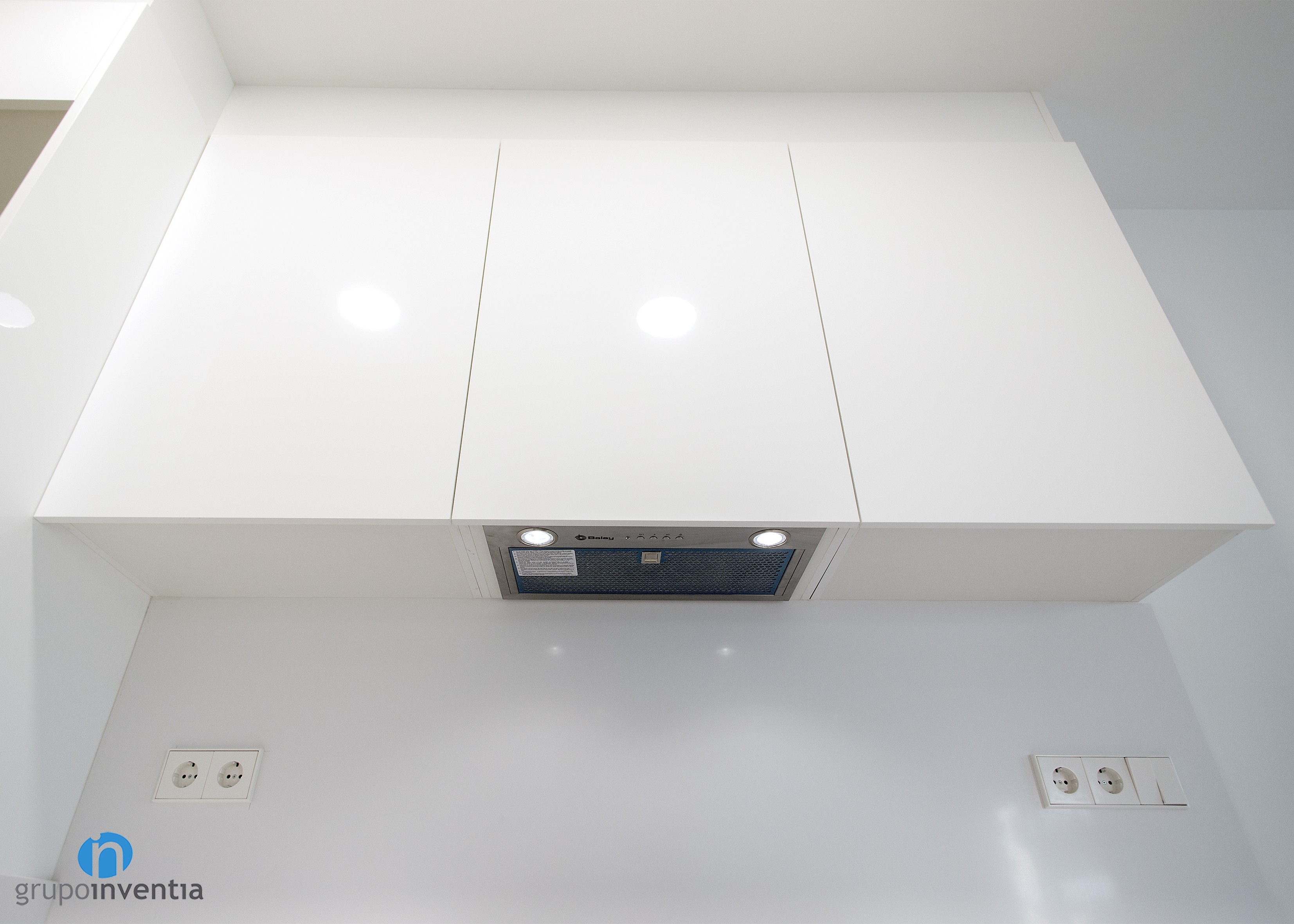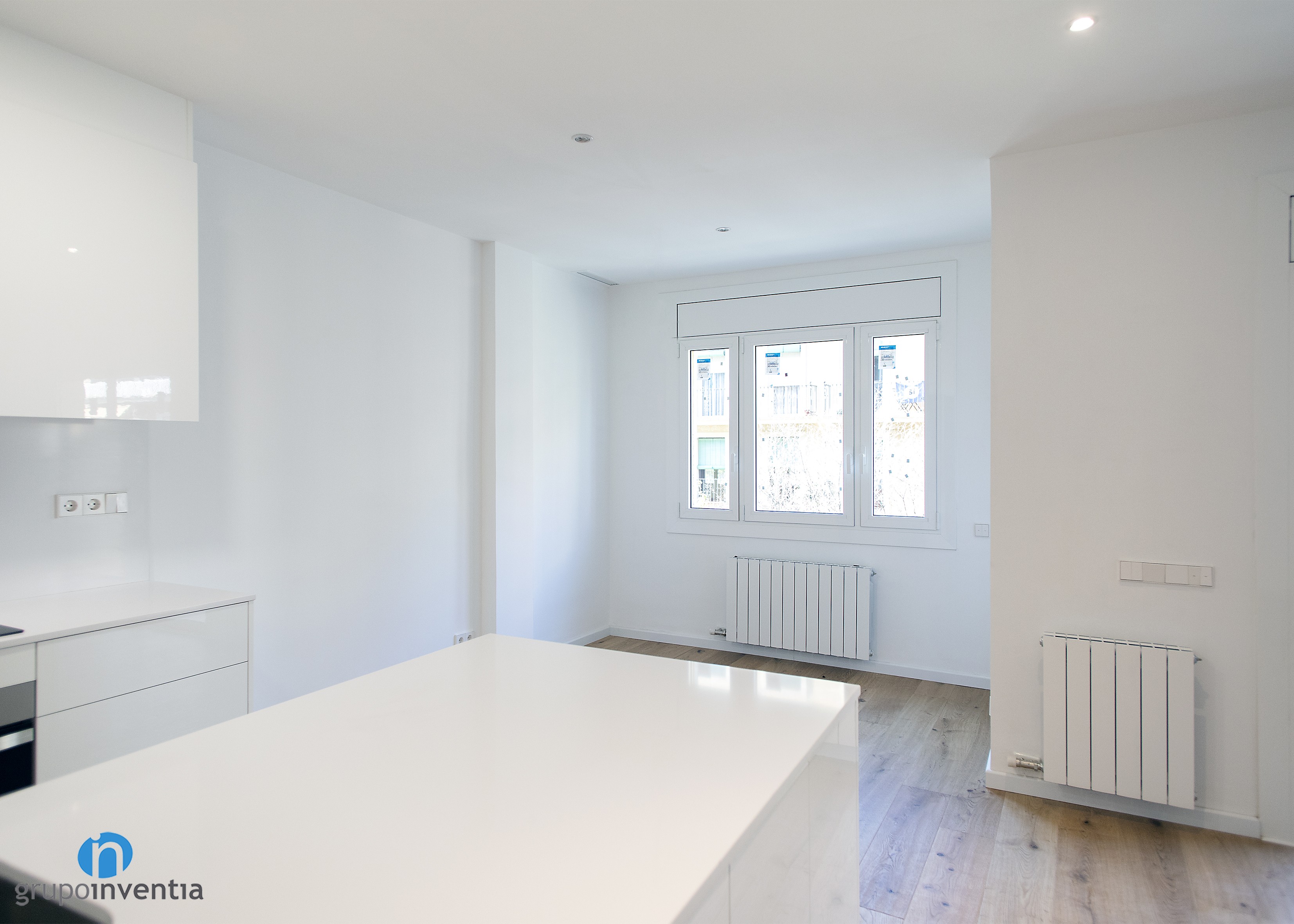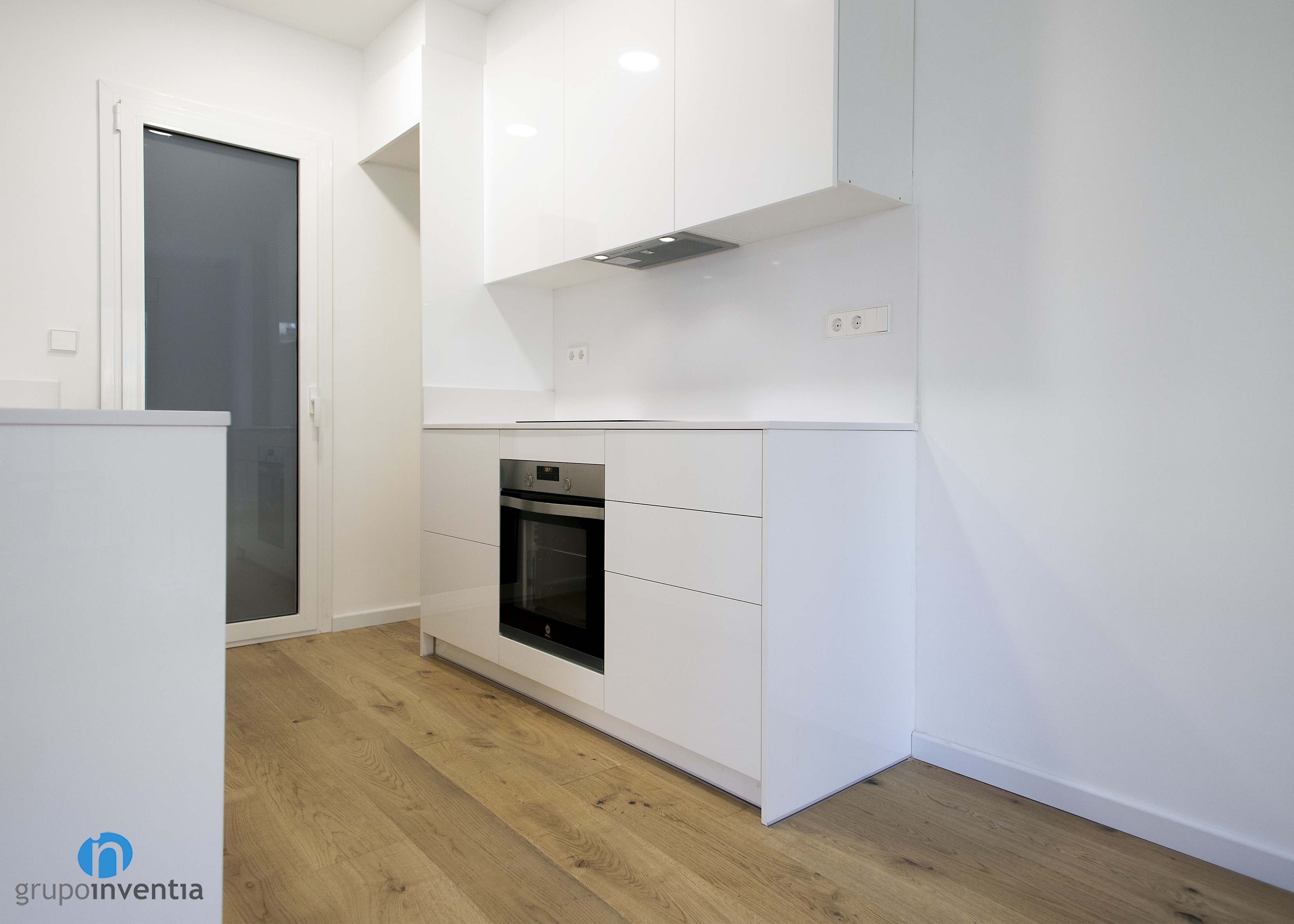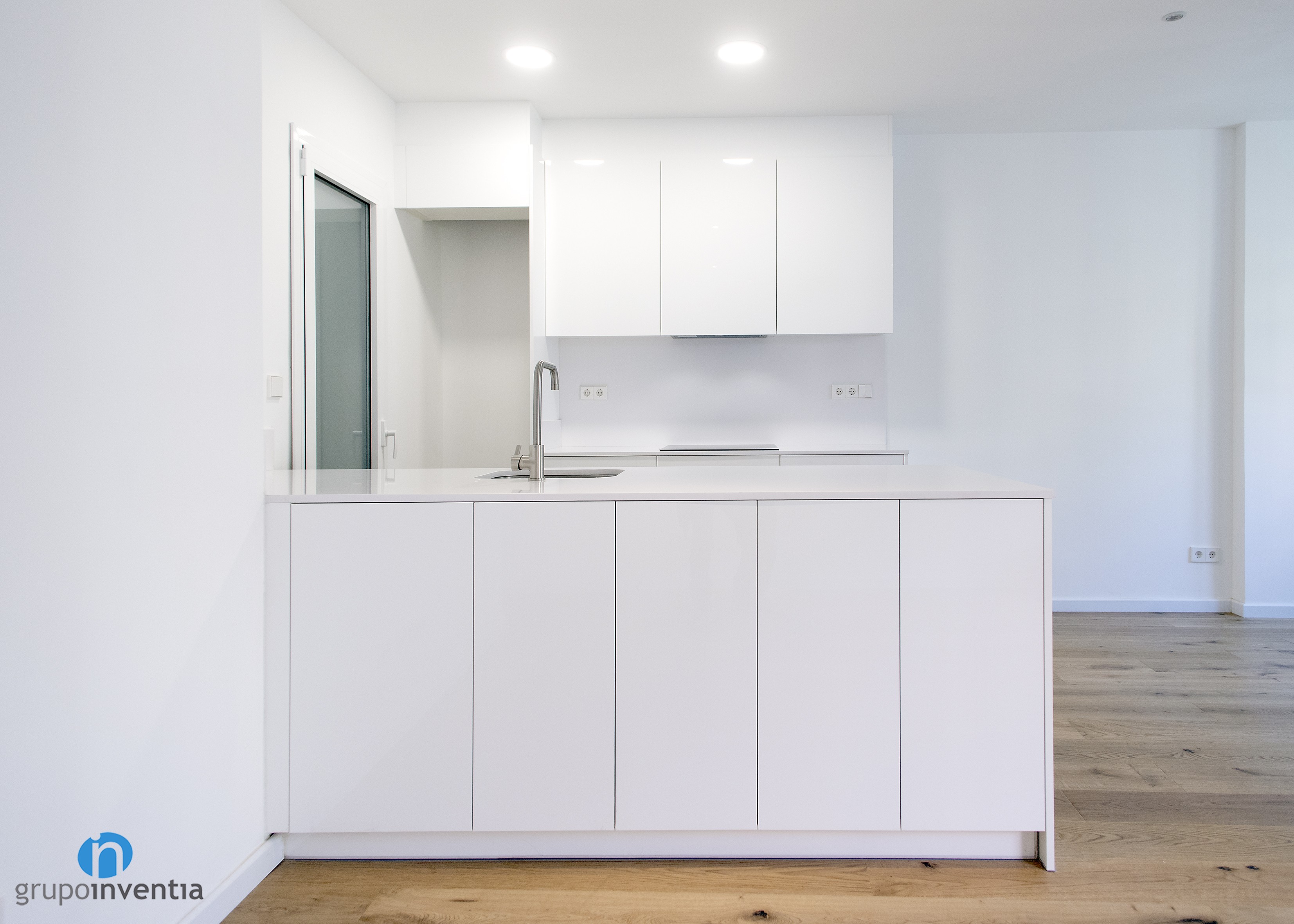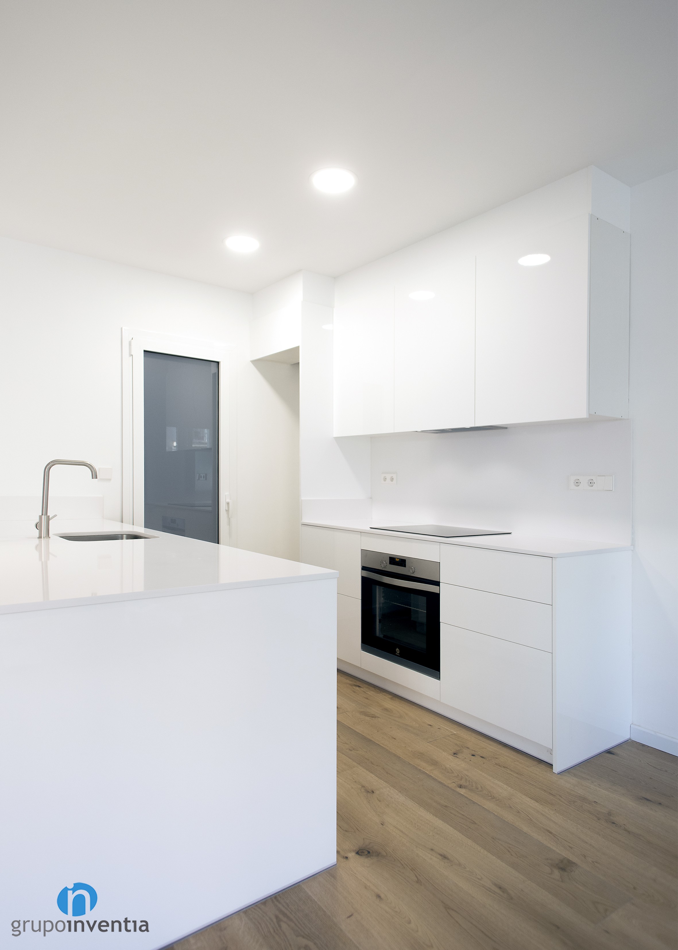La reforma de cuina és oberta i està distribuïda a dos fronts. A la part de la paret es va col·locar un taulell equipat amb una placa vitroceràmica. Tant en la seva part inferior com superior es van col·locar armaris i calaixos per a l’emmagatzematge. A l’extrem es va disposar un buit a mida per encastar la nevera.