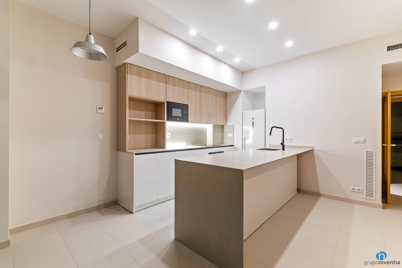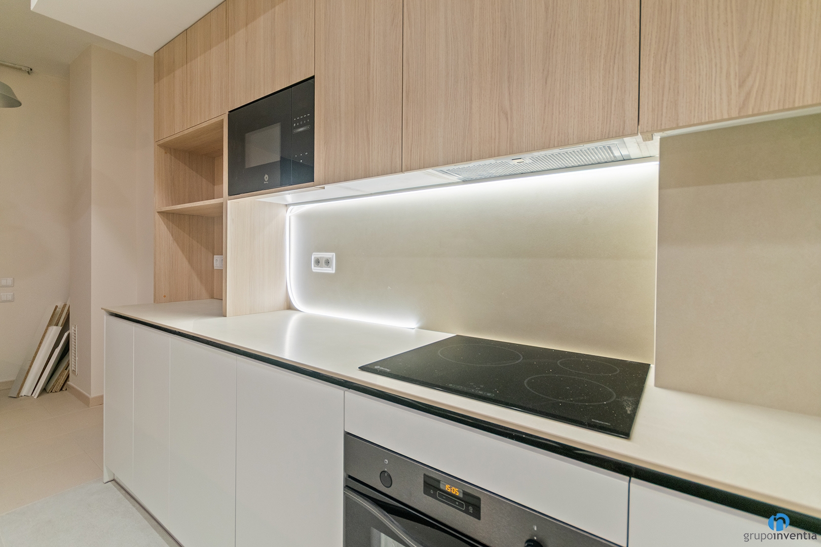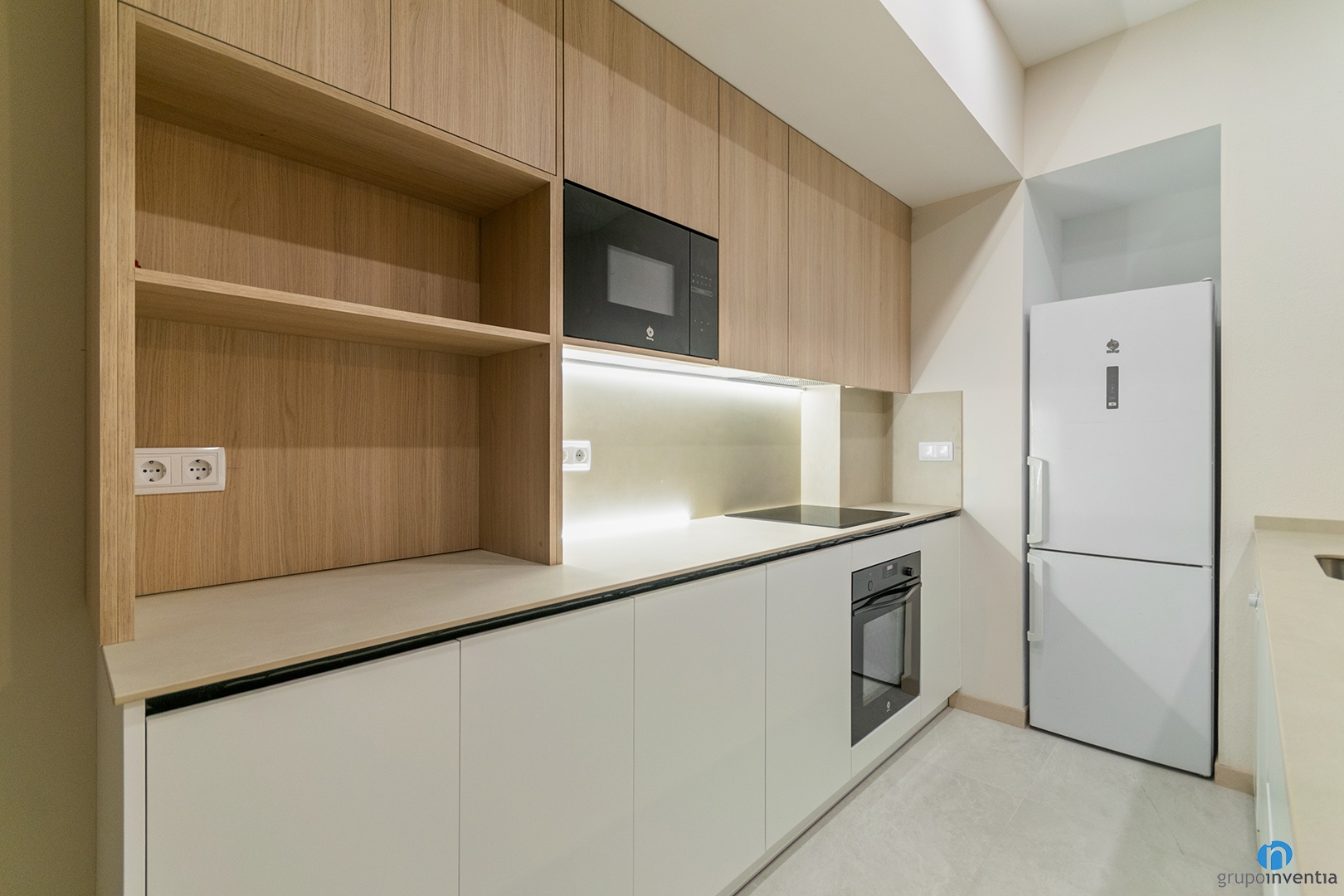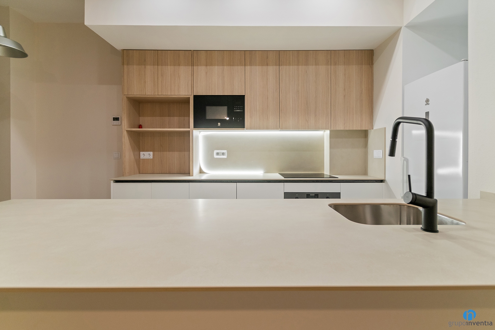 A més, aquesta reforma de cuina a Barcelona està completament equipada amb forn, microones, nevera i rentaplats. Tots els electrodomèstics s’han integrat al mobiliari, aconseguint una imatge uniforme i contemporània. El conjunt ofereix una cuina funcional, equilibrada i alineada amb l’estil general de l’habitatge.