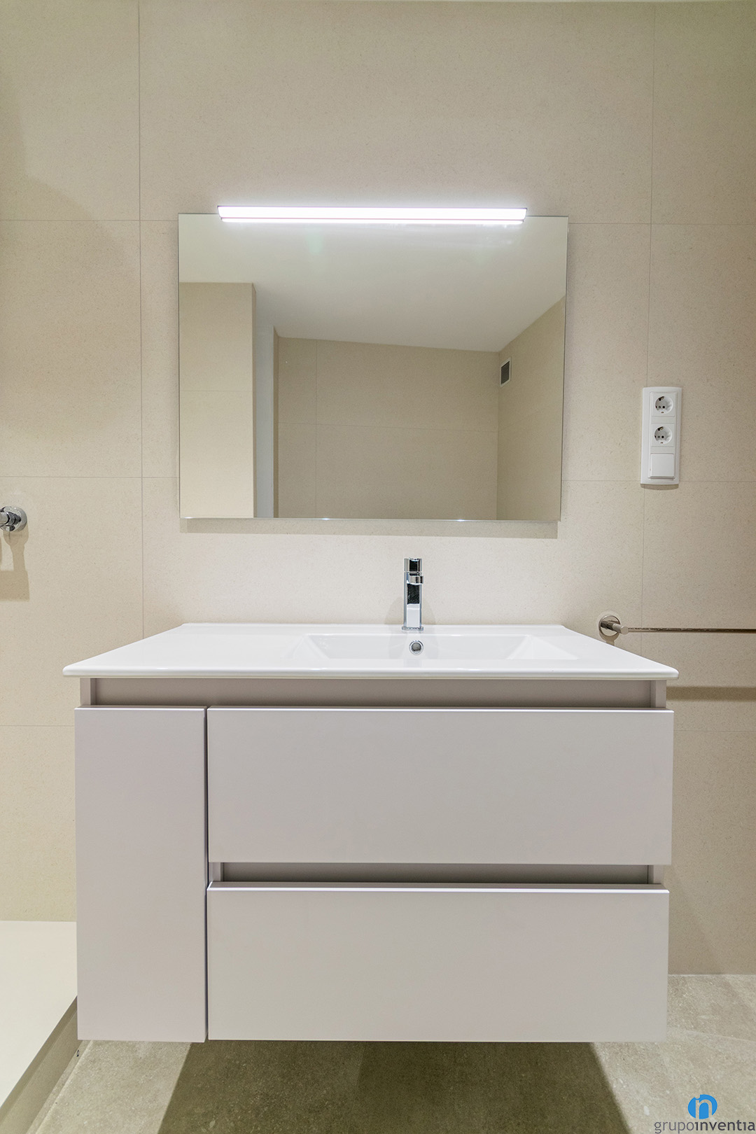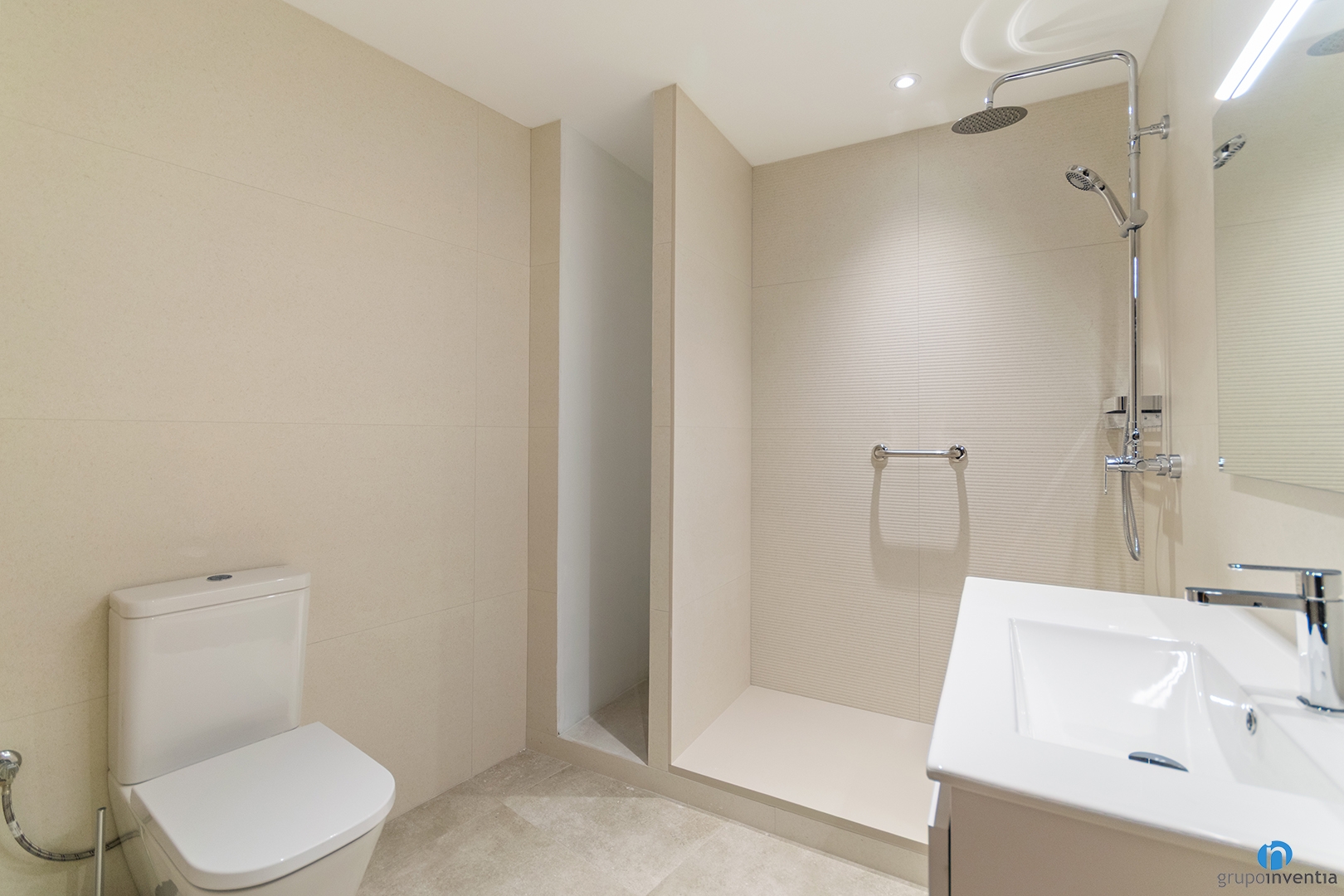 El bany principal compta amb un lavabo amb moble d’emmagatzematge, un inodor i un plat de dutxa. Per al revestiment s’han utilitzat rajoles en tons neutres, que aporten una sensació fresca i agradable. Aquesta elecció cromàtica ajuda a potenciar la lluminositat i crea un ambient relaxat i equilibrat.