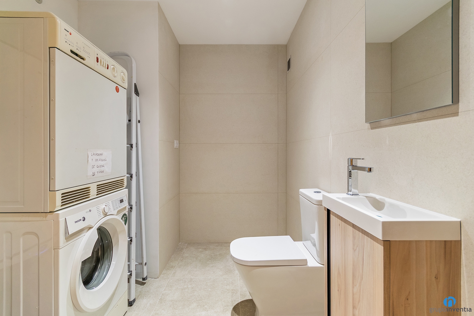 Per la seva banda, el lavabo disposa de lavabo i inodor i s’ha equipat amb rentadora i assecadora. D’aquesta manera, s’aprofita l’espai disponible i s’afegeix una funció pràctica al conjunt de l’habitatge, sense renunciar al disseny ni a la comoditat.
