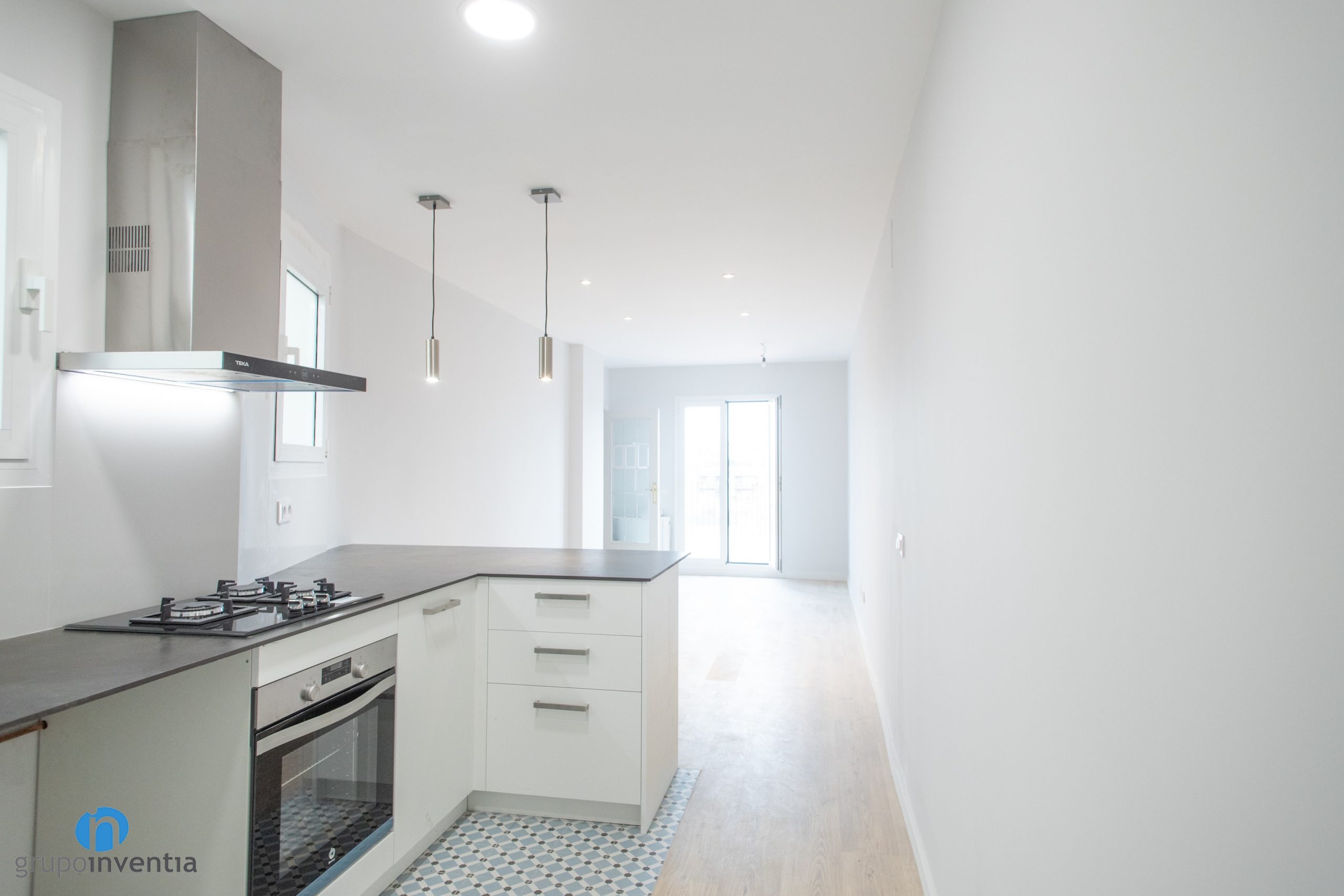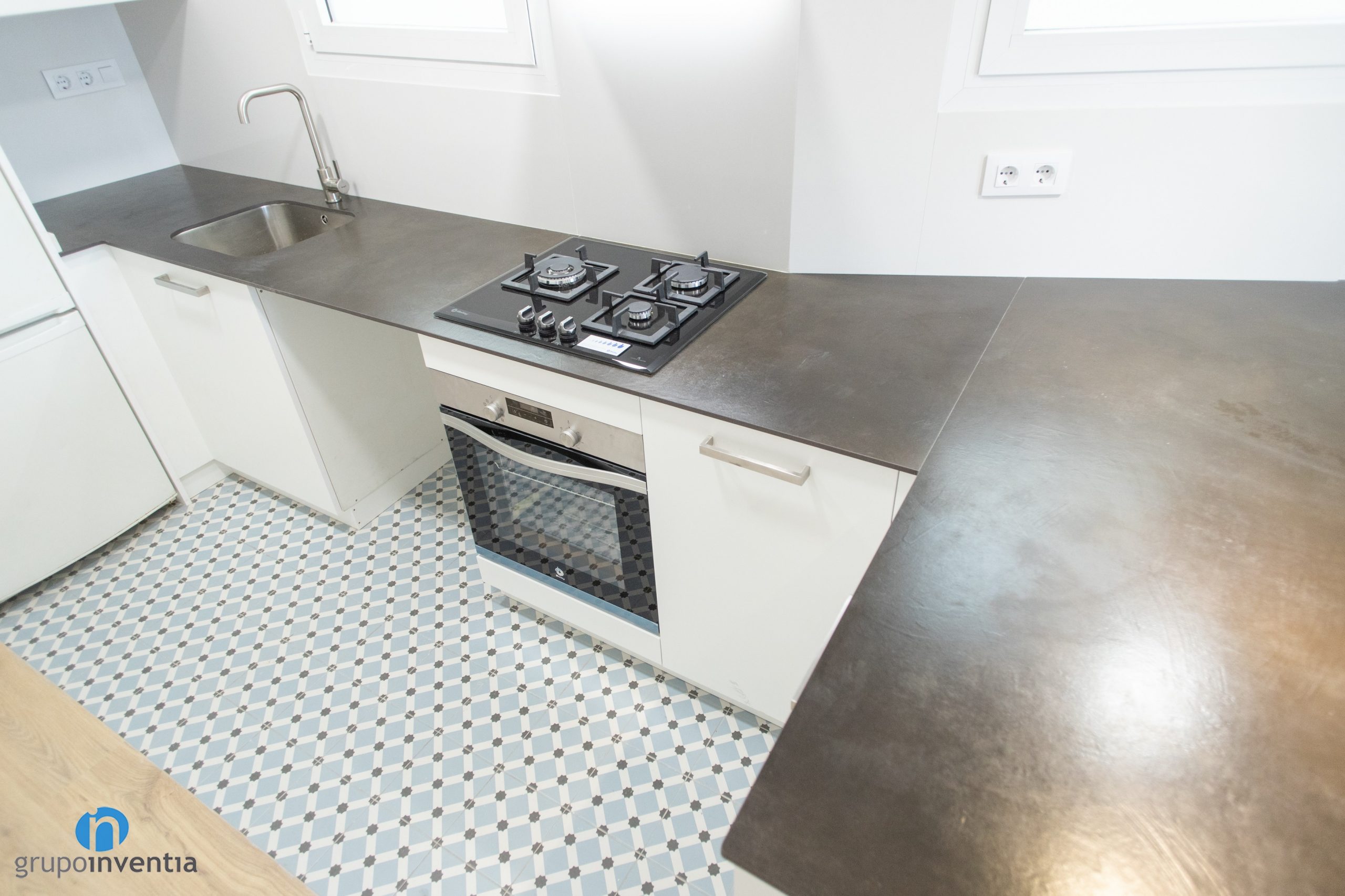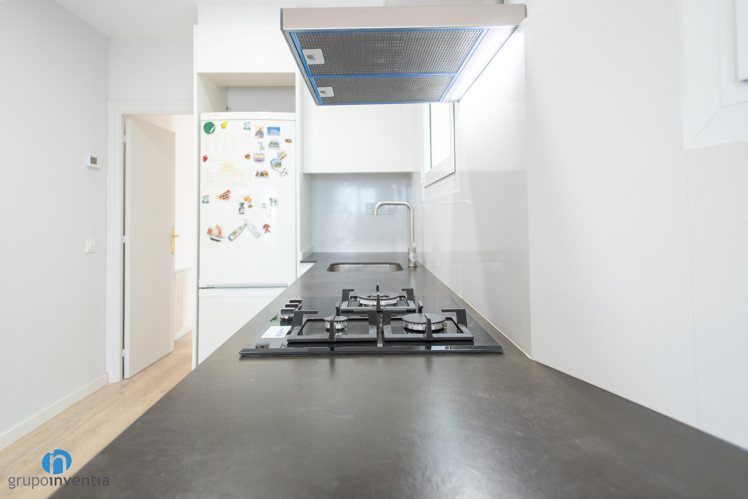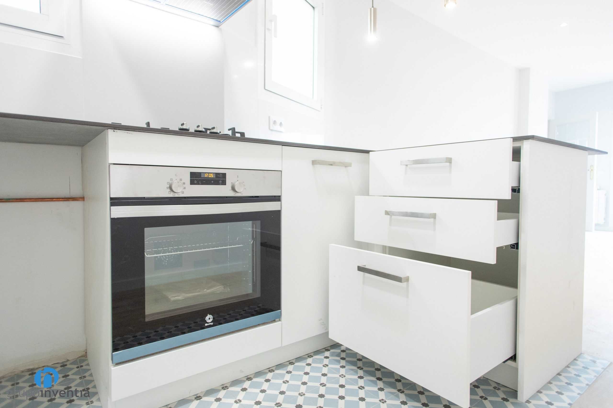 Es tracta d’una reforma de cuina oberta i que s’ha distribuït en forma d’U. Ara cada element ocupa el lloc indicat i ofereix una major funcionalitat en el seu ús. Al ser una cuina oberta s’ha utilitzat un disseny d’acord a la resta de l’habitatge. D’aquesta manera s’ha instal·lat un moble de cuina de color blanc que es combina amb taulells grisos. El resultat és el d’un espai lluminós i ampli.
