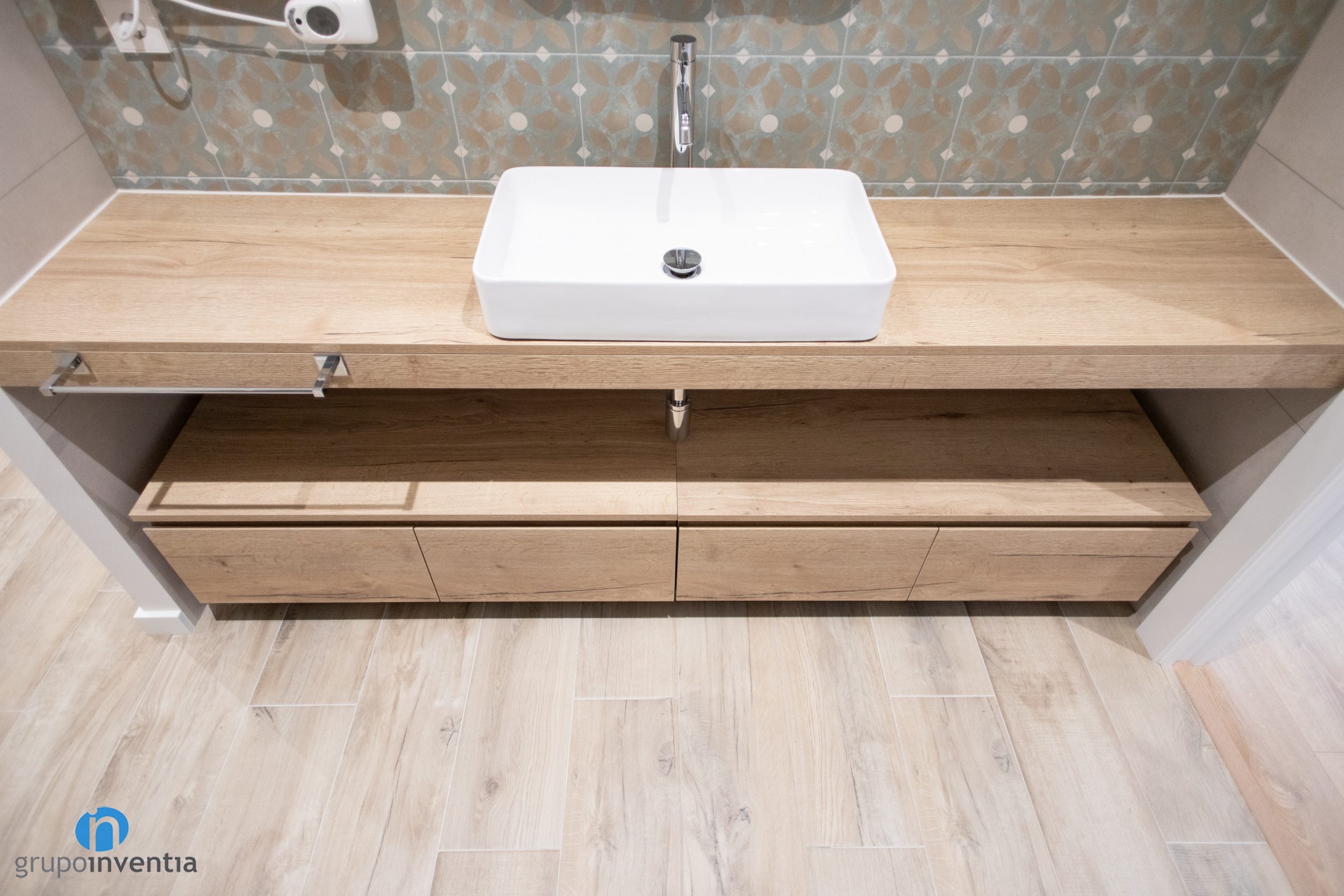 La nova imatge d’aquesta reforma de banys també llueix molt semblant. Encara que hi ha alguns detalls personalitzats s’ha imprès un disseny neutre amb el que s’ha aconseguit un ambient acollidor. En tots dos s’han utilitzat rajoles de color beige per enrajolar les parets. A la paret del lavabo de lavabo del bany suite també s’han fet servir rajoles tipus hidràulic. Per al nou paviment s’ha escollit un terra ceràmic imitació parquet.