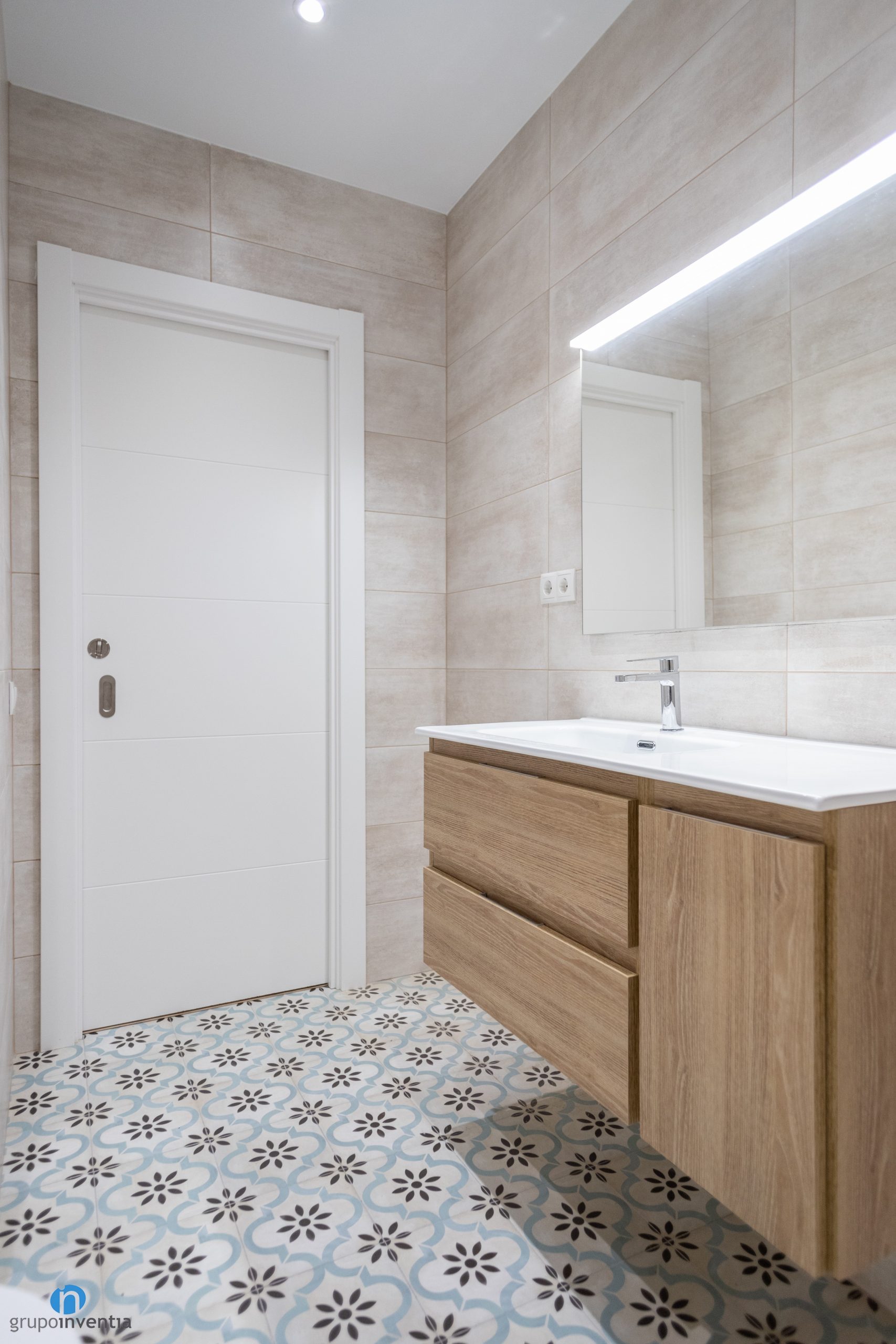 Pel que fa a la nova imatge de la cambra de bany s’ha mantingut el disseny que s’ha utilitzat en la resta de l’habitatge. Les parets s’han enrajolat completament amb rajoles rectangulars d’acabat en beige. Per al nou paviment s’ha optat per un terra tipus hidràulic amb un dibuix en tons blaus i negres.