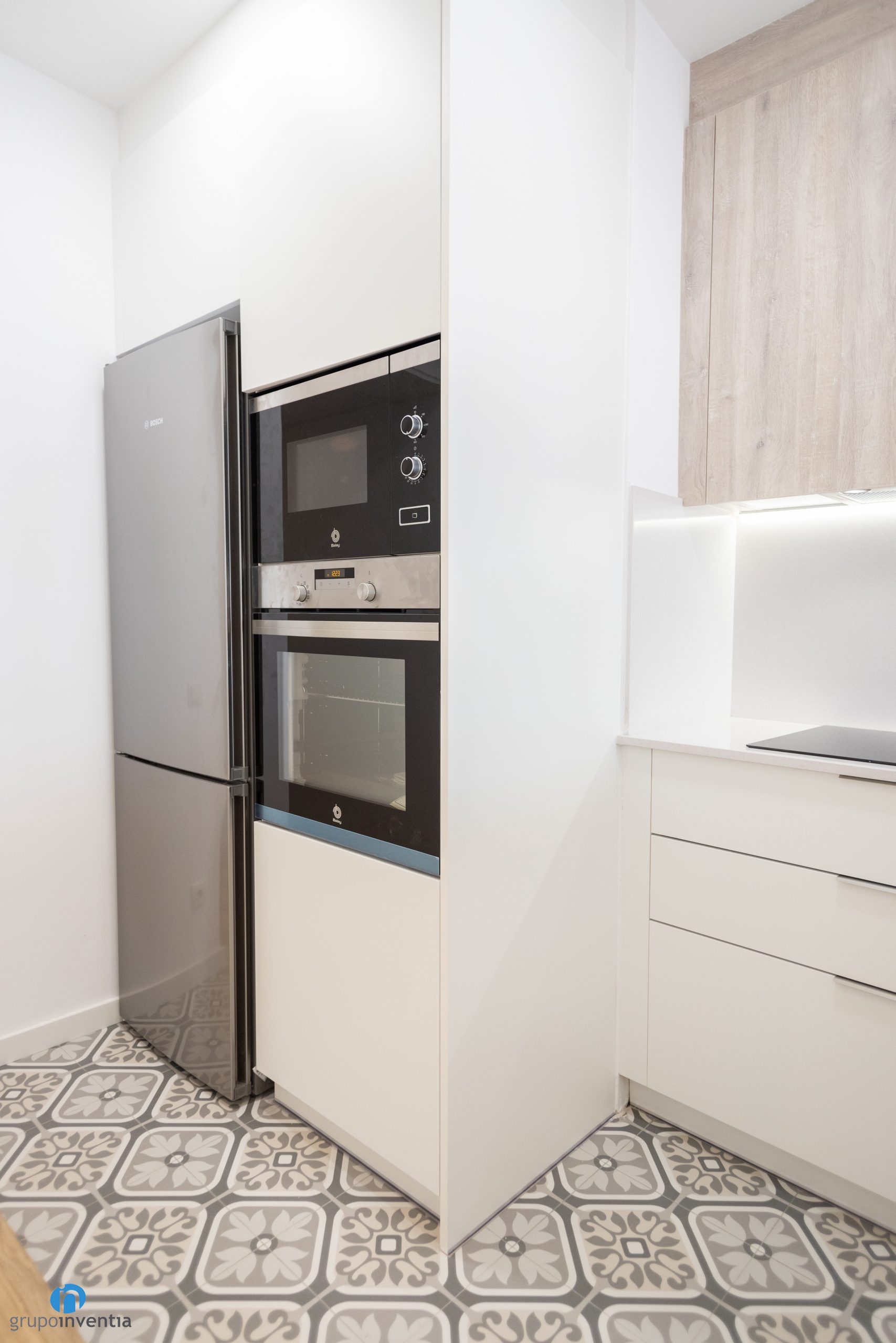 A l’extrem esquerre s’han integrat els nous electrodomèstics. Per a aquesta reforma de cuina a Barcelona són una nevera, un forn i un microones. Tots els electrodomèstics es presenten en una acabat d’acer inoxidable molt elegant. Seguidament neix un primer tram de taulell. En allargat i sobre ell s’ha instal·lat la placa vitroceràmica.