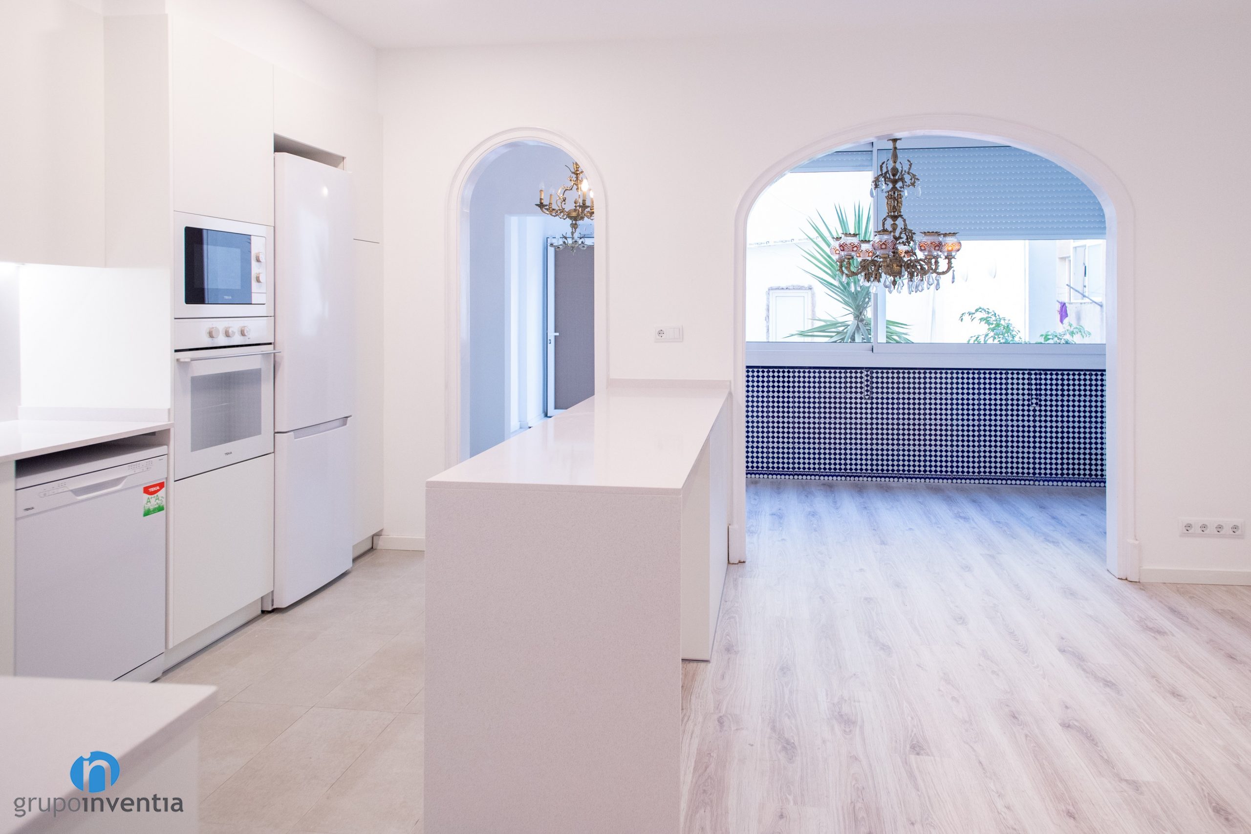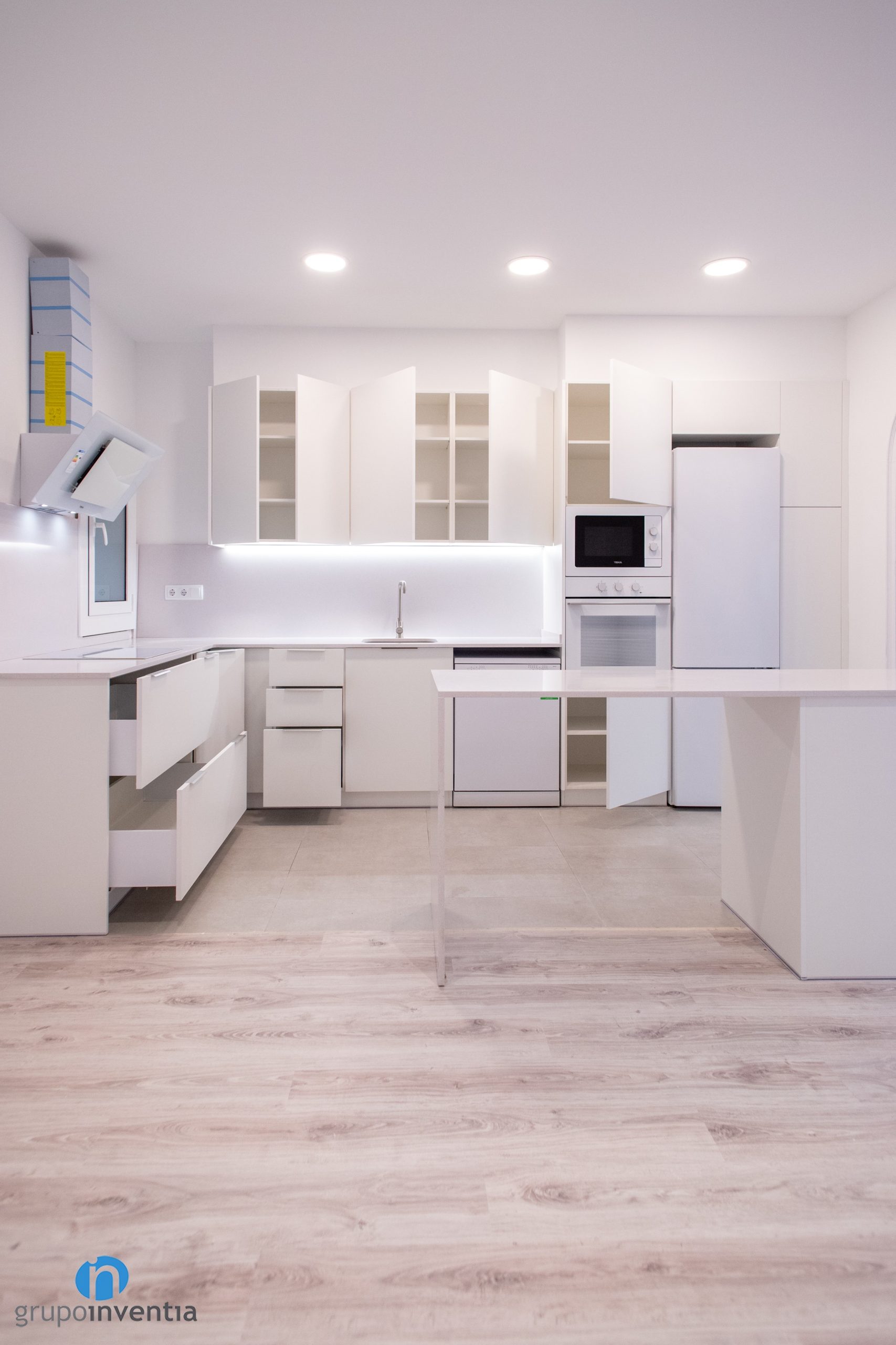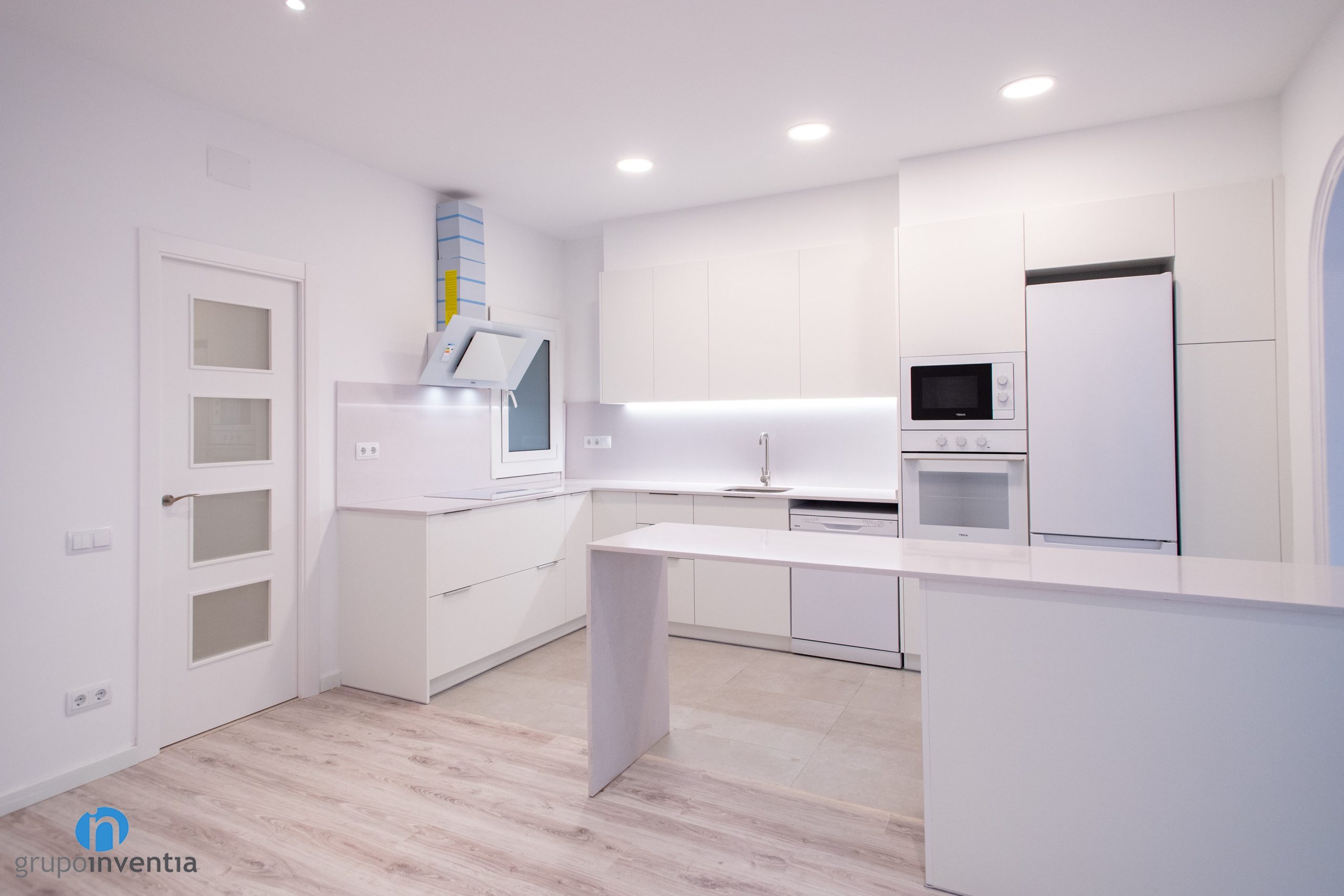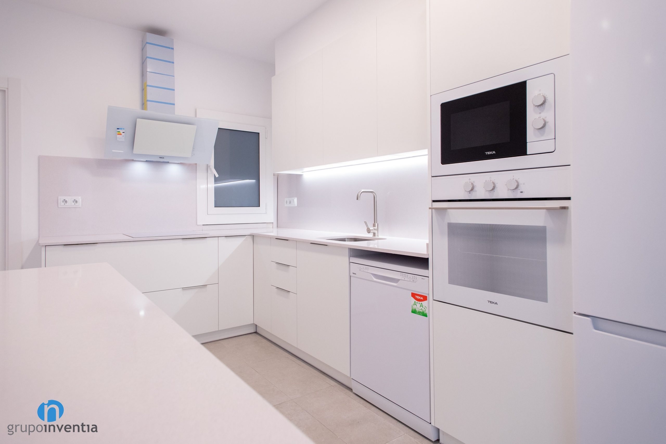 A l’extrem esquerre s’han integrat tots els electrodomèstics. Es componen de nevera, forn, microones i rentavaixelles. Tots ells presenten acabats en color blanc a joc amb tot el mobiliari de cuina. Seguidament neix un taulell amb una pica integrada i que compta amb capacitat d’emmagatzematge a la seva zona inferior i superior. A mà esquerra trobem una altra taulell equipada amb una placa vitroceràmica.