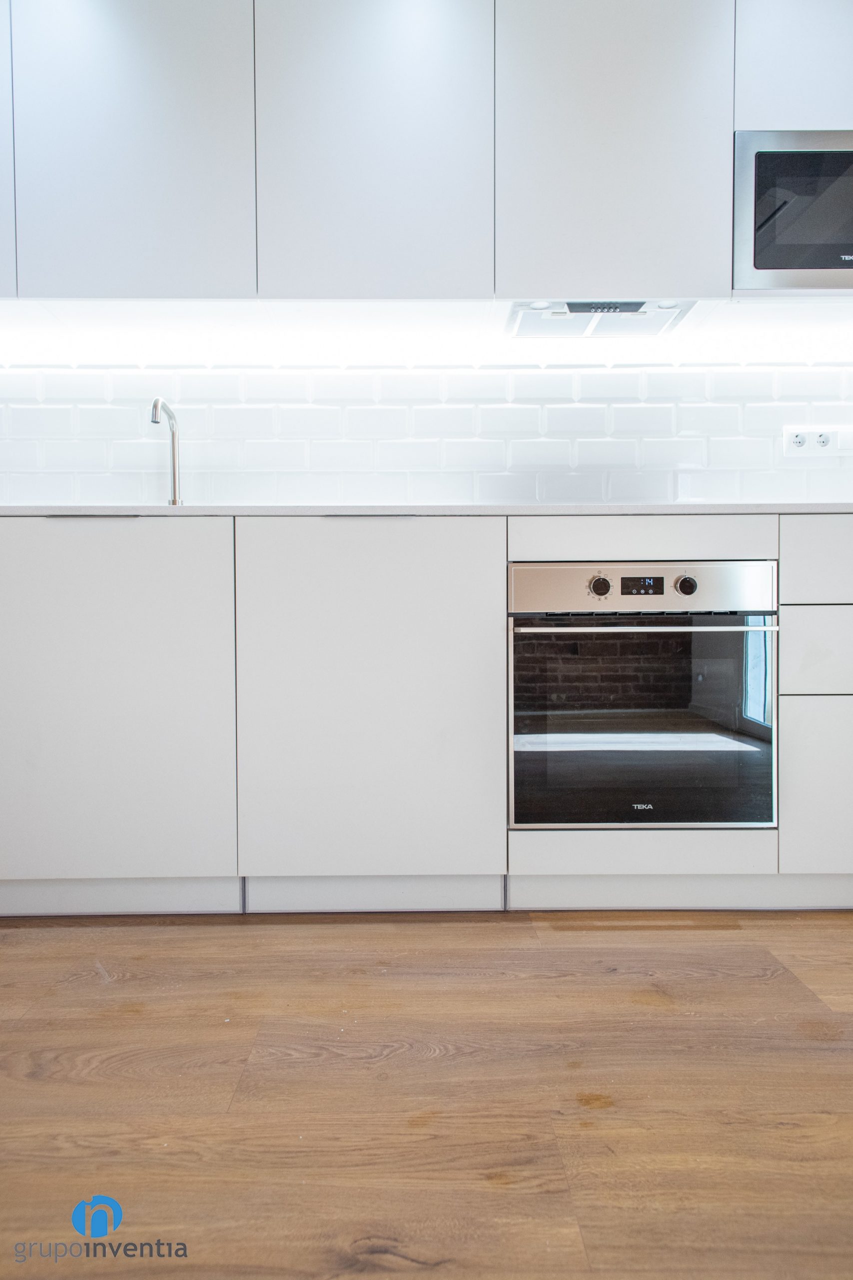 Tant el moble de cuina com els taulells són de color blanc. Sobre el taulell s’ha instal·lat una pica i una placa vitroceràmica. Tant en la seva zona inferior com superior compta amb armaris i calaixos per a l’emmagatzematge. De fet aquí s’han integrat el forn i el microones respectivament. A l’extrem dret s’ha col·locat la nevera. Està integrada en el moble de cuina i les portes són les de el mateix armari.