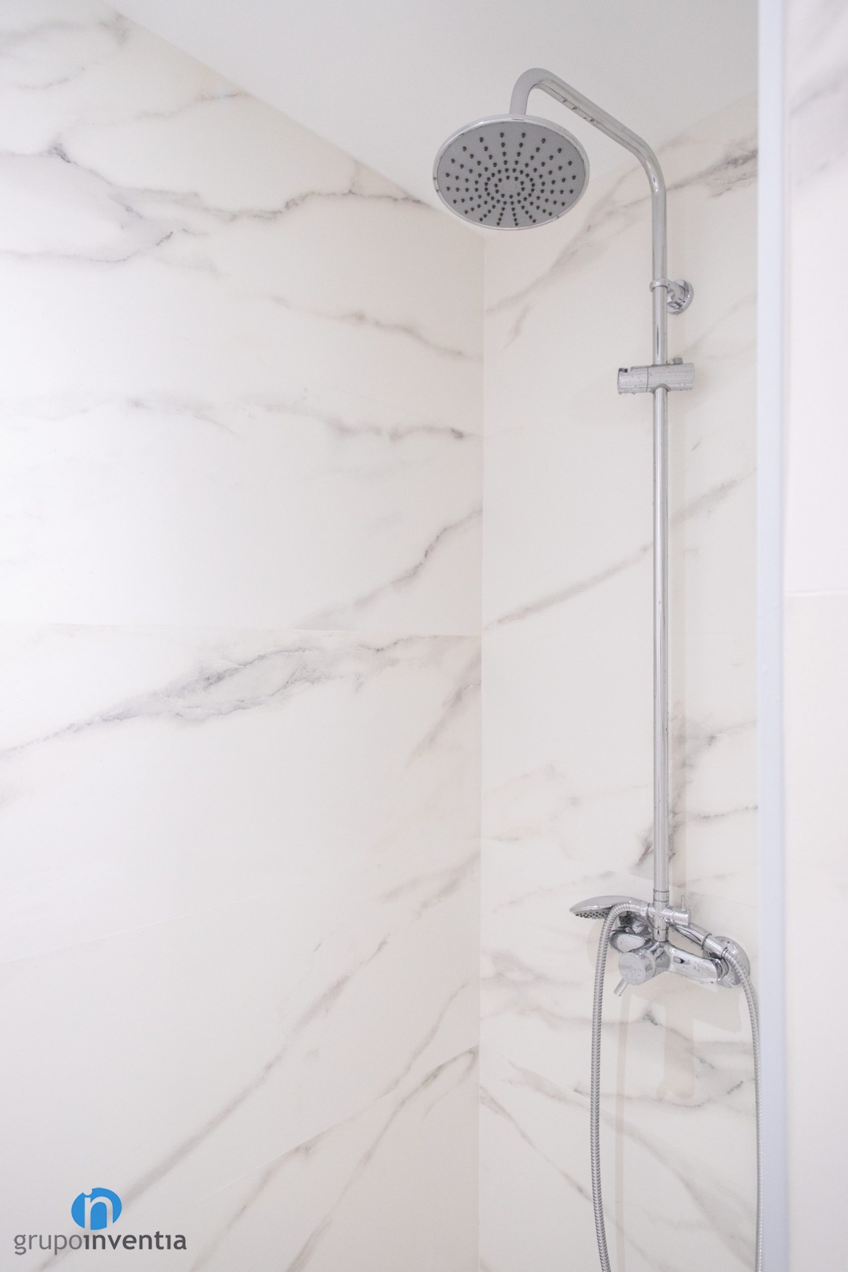 La imatge de la cambra de bany també s’ha millorat. Les parets s’han enrajolat completament amb rajoles de color blanc imitació marbre. Un toc molt subtil i que permet integrar el nou paviment de manera fluïda. Per aquest s’ha escollit un terra de gres en color gris. Visualment queda perfecte, a més de tractar-se d’un material resistent i molt indicat per a una cambra de bany.