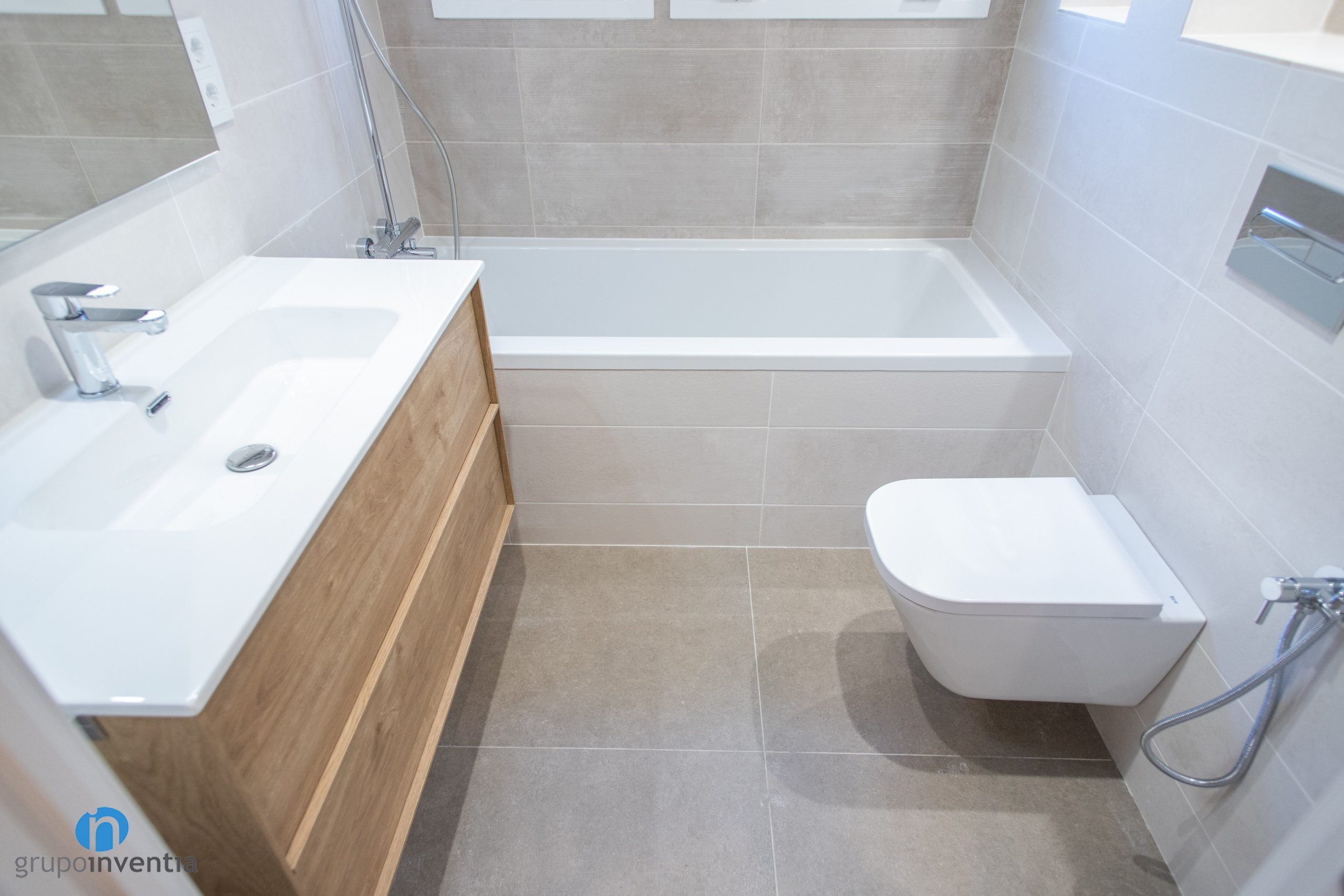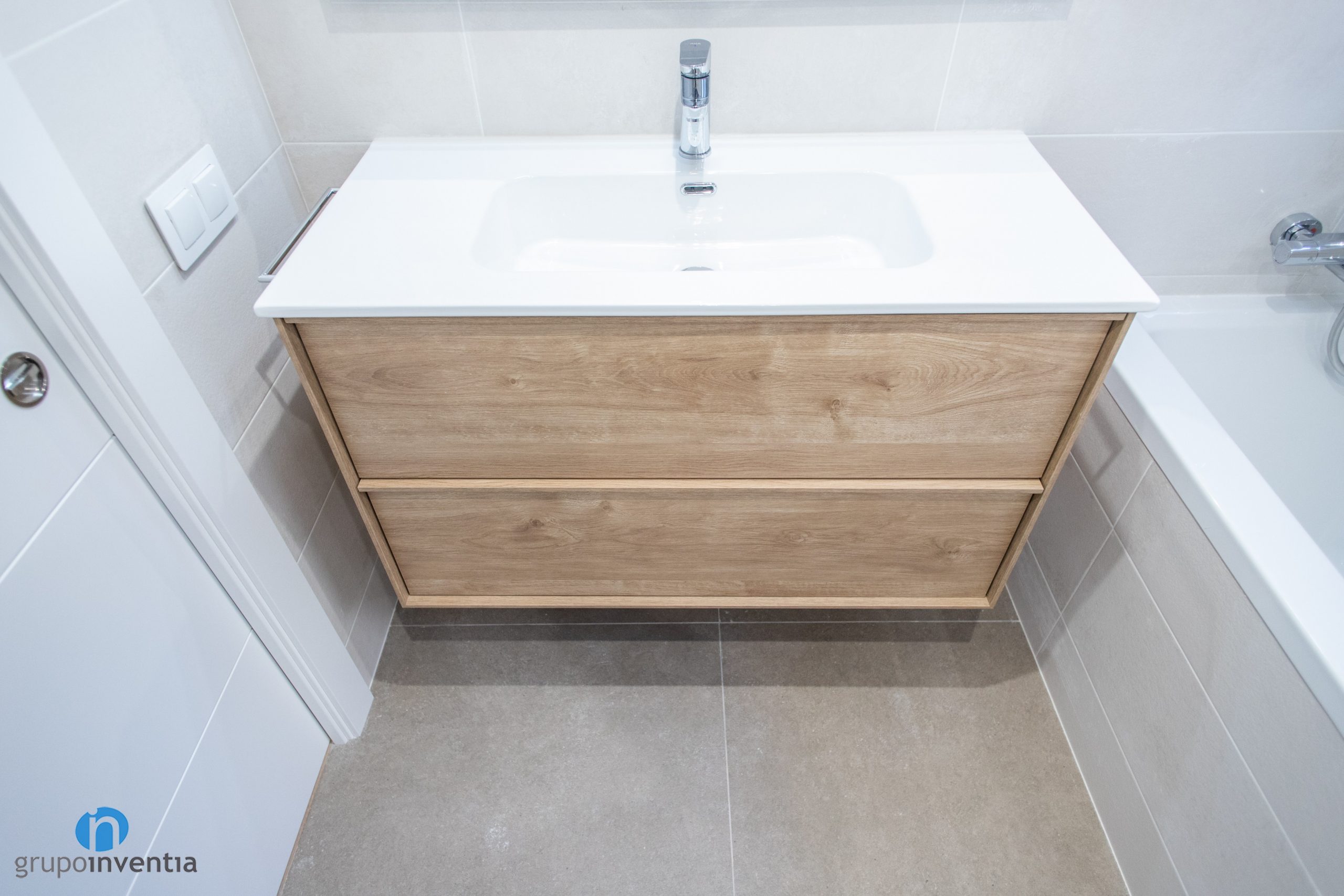 A mà dreta s’ha instal·lat un lavabo flotant que disposa de dos calaixos per a l’emmagatzematge. A Grupo Inventia treballem amb un ampli catàleg de sanitaris i també de mobles de bany. Just davant s’ha col·locat un vàter flotant i amb la cisterna oculta. Es tracta d’un element que contribueix a generar més espai visual a l’estança. En el fons del bany s’ubica la zona d’aigües, per a la qual s’ha mantingut la banyera.