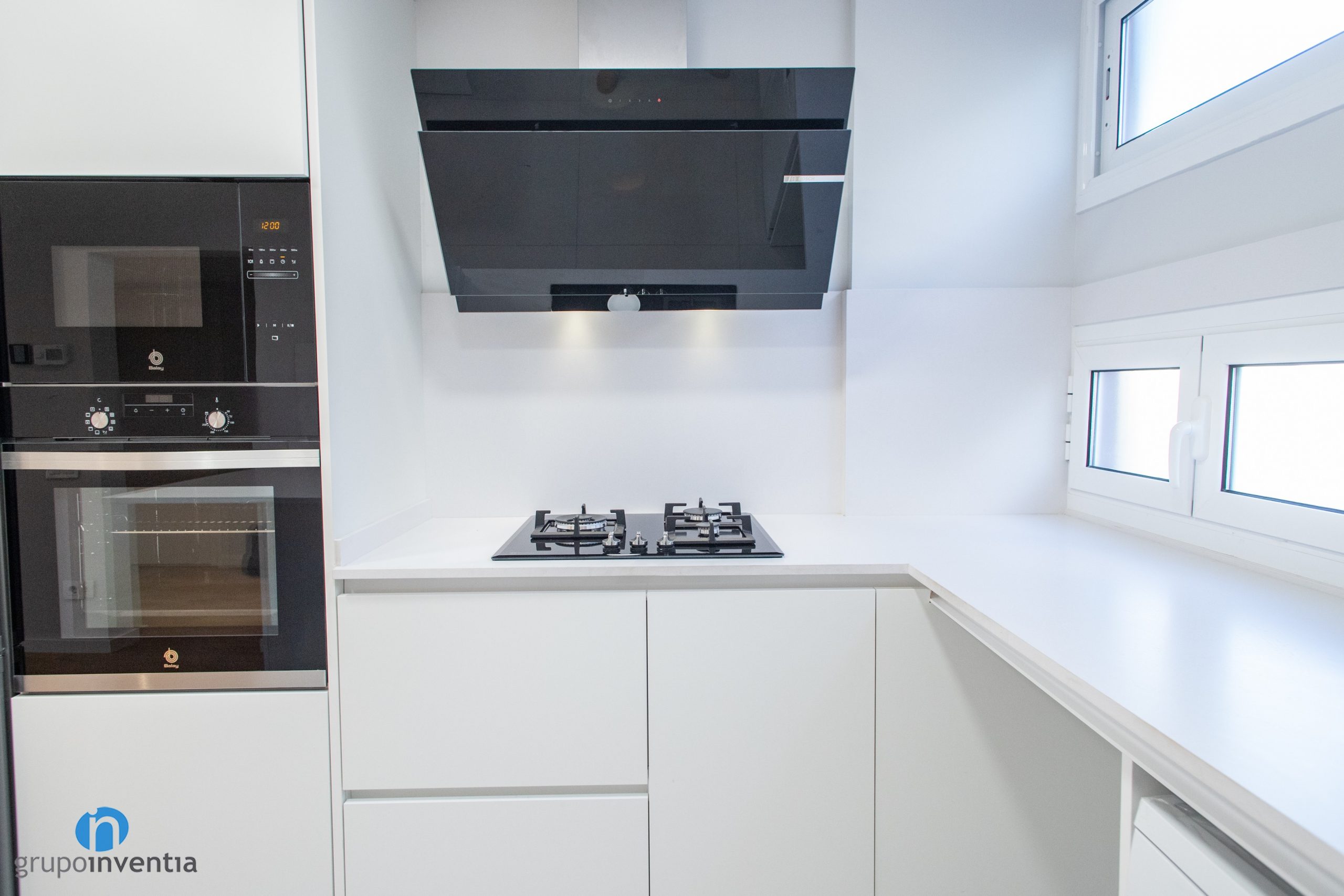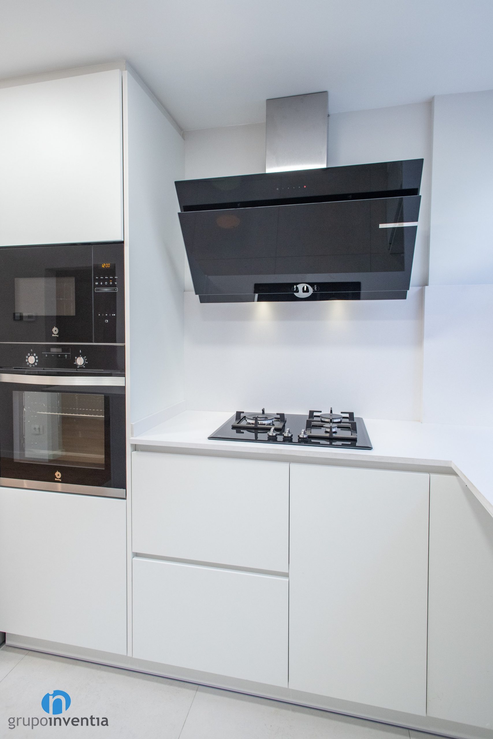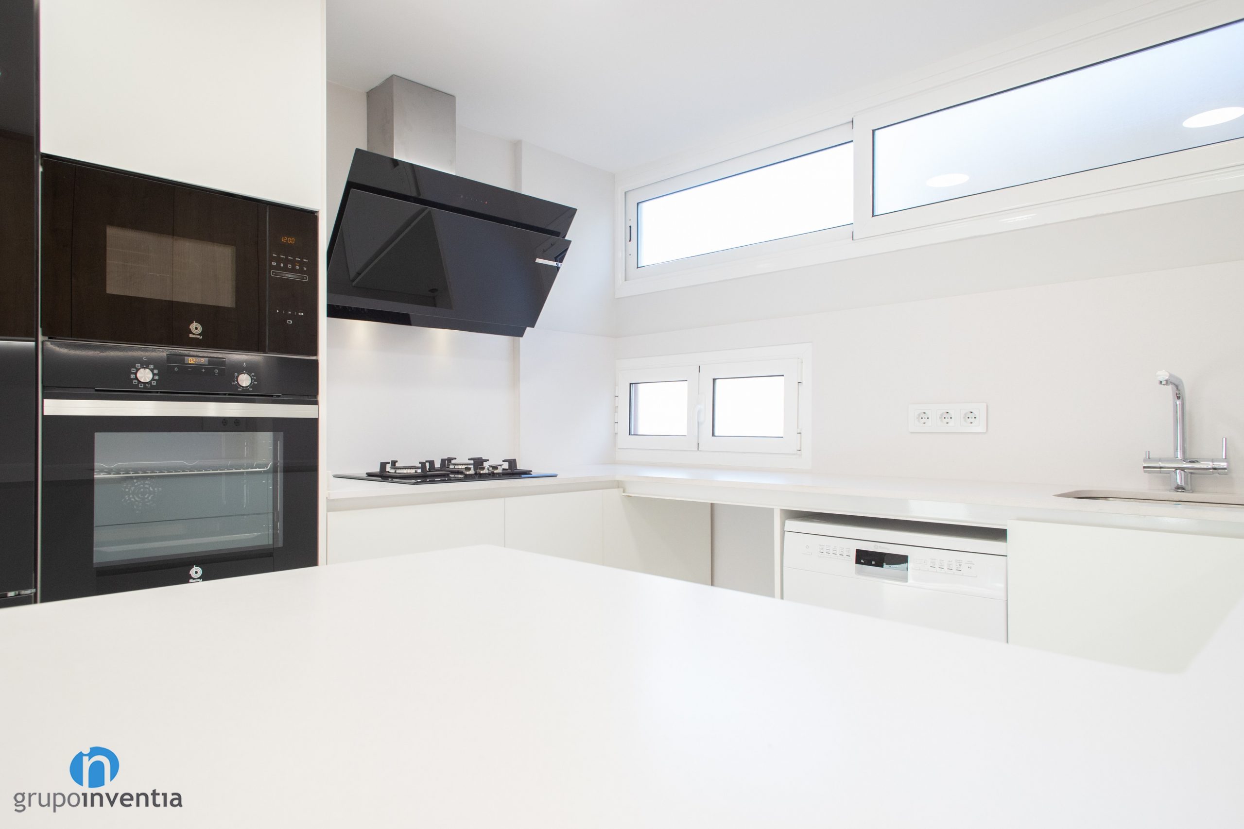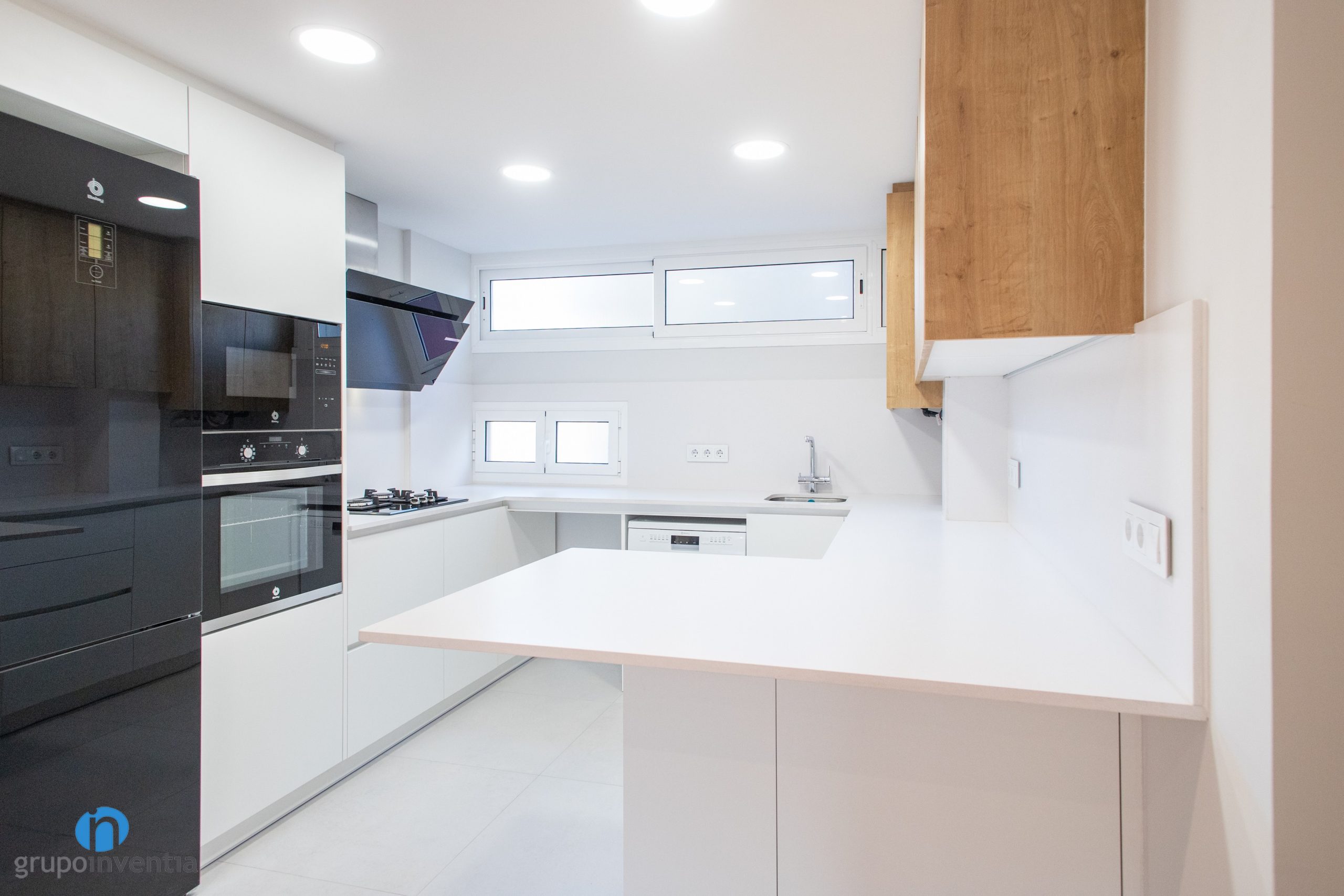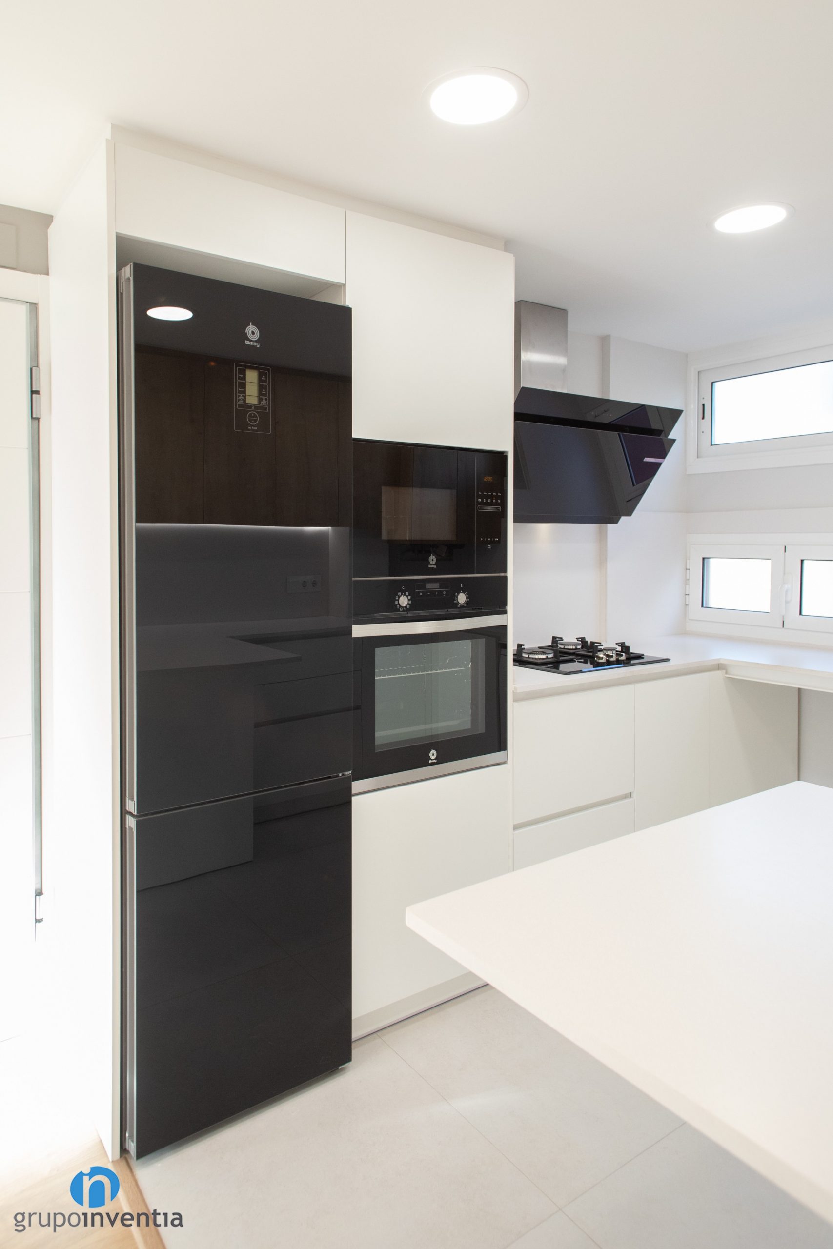 Els electrodomèstics amb acabat en color negre s’han integrat a l’extrem esquerre. Es componen de nevera combi, forn i microones. Seguidament neix un taulell equipada amb una placa de cocció i acompanyada d’una campana extractora decorativa també en color negre. El taulell central alberga la pica i en la seva zona inferior s’ha integrat el rentaplats.