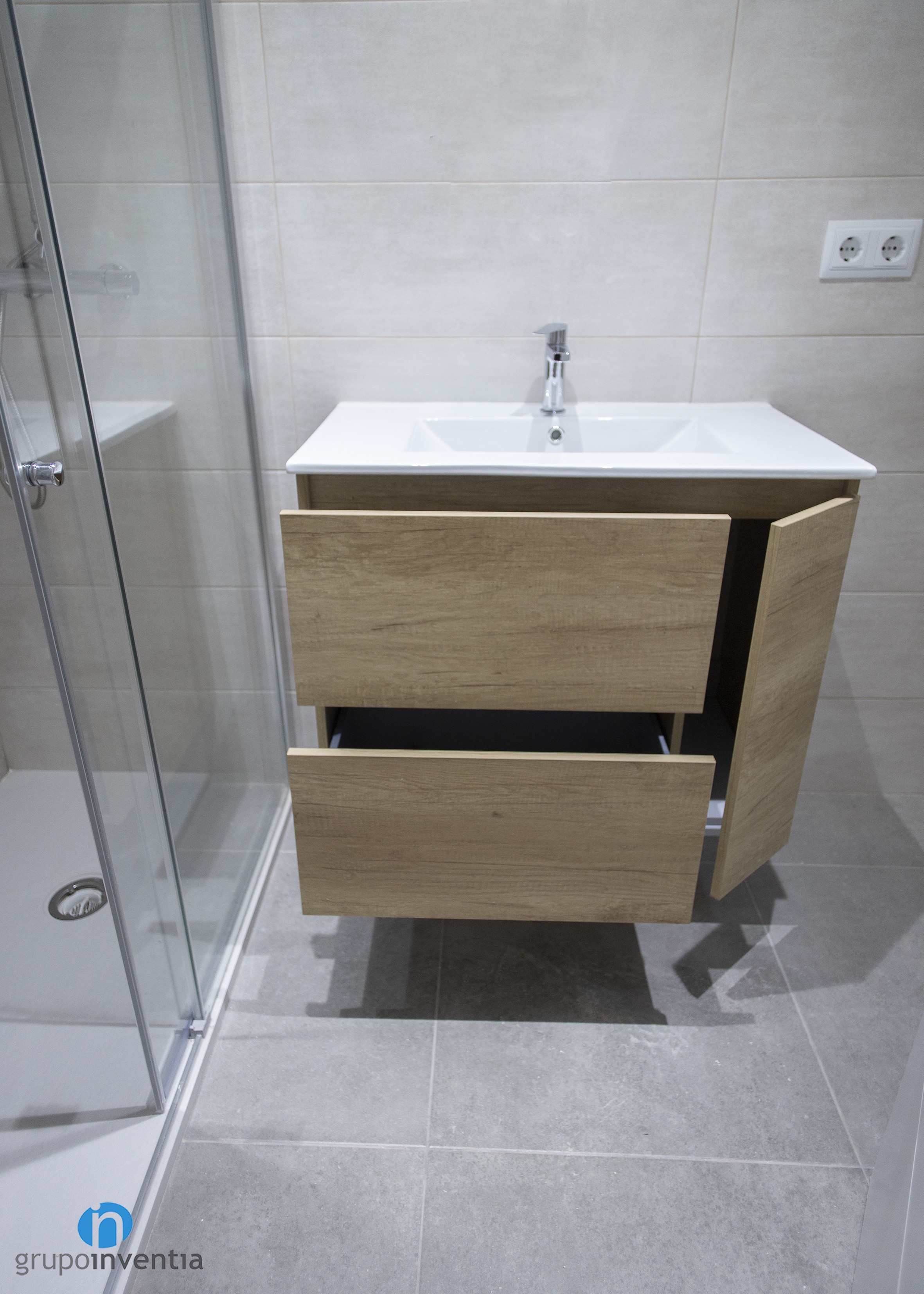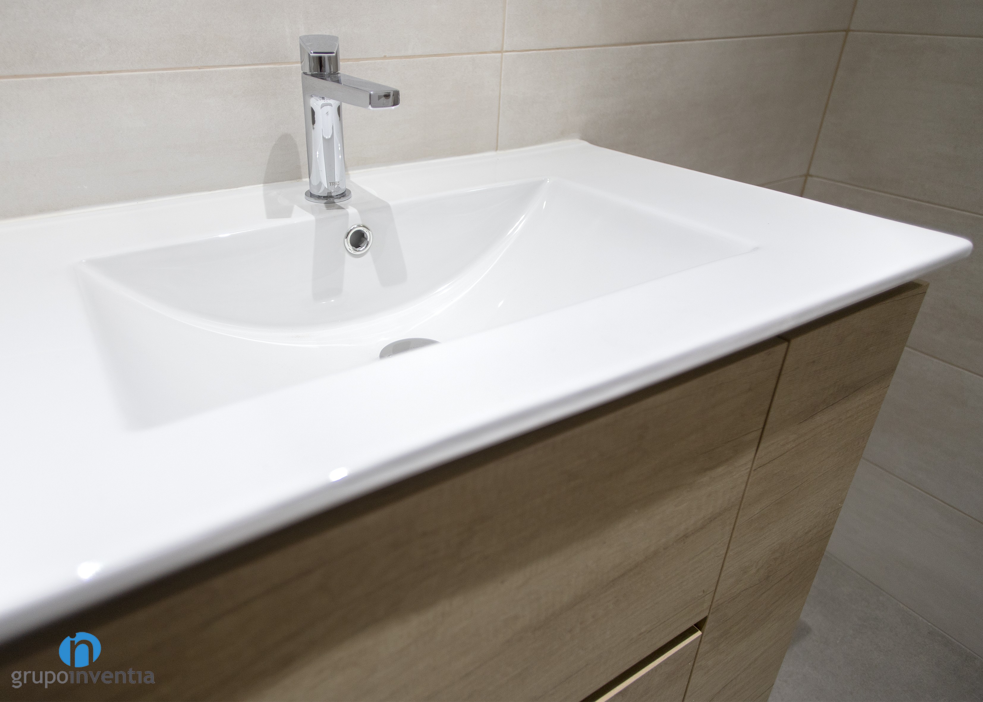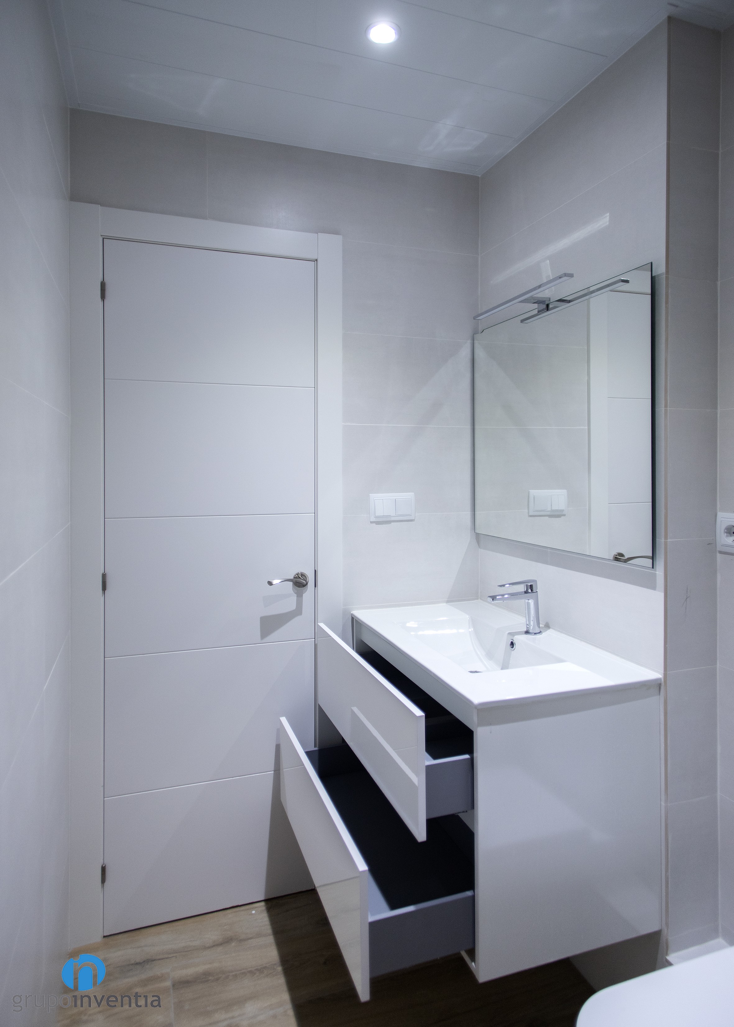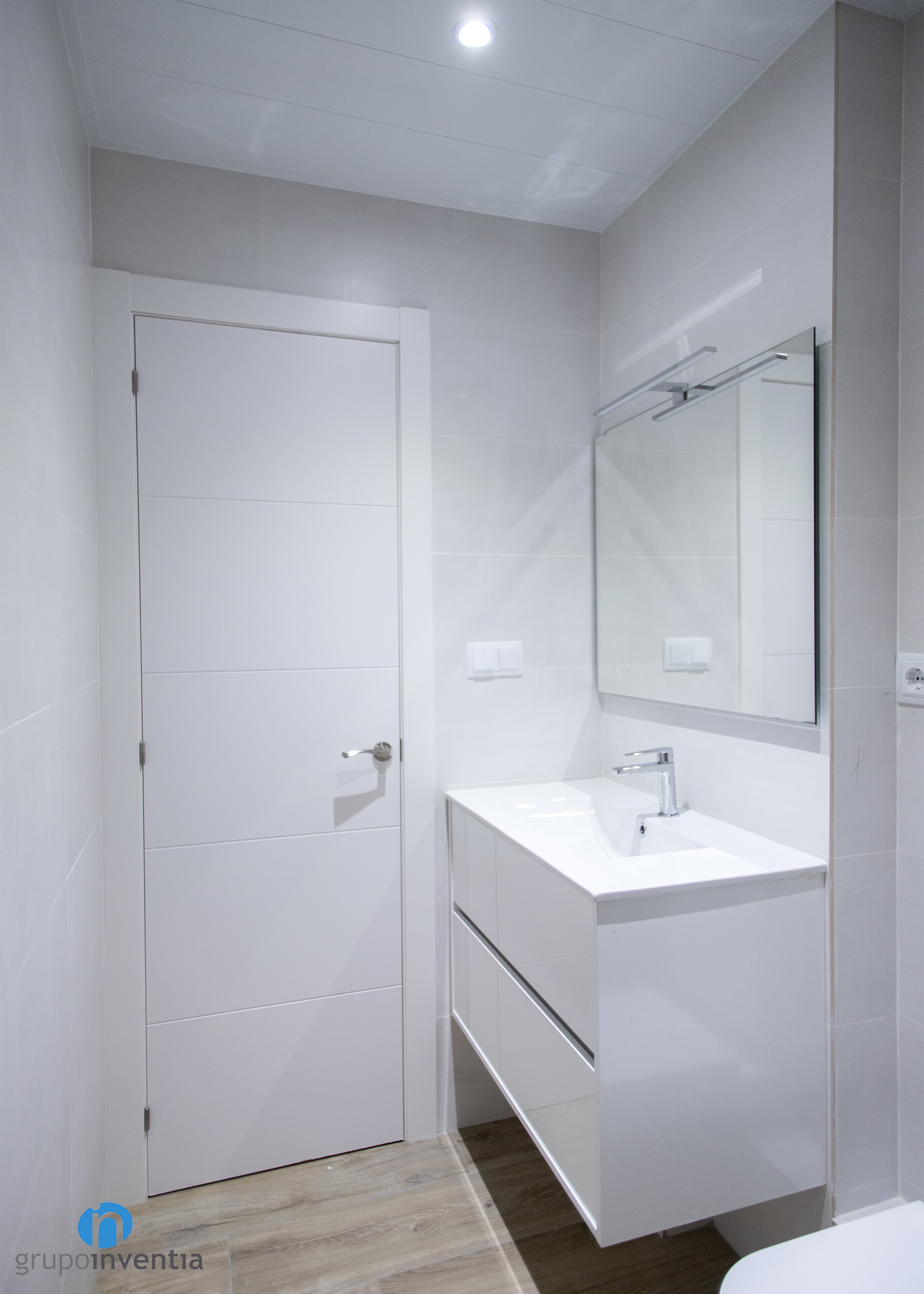 A Grupo Inventia també ens vam encarregar de la reforma de banys. L’habitatge comptava amb un parell i després de la reforma tots dos compten amb un equipament sanitari que ofereix les millors prestacions en el seu ús. Aquest està format per un lavabo amb moble d’emmagatzematge incorporat, un vàter i una dutxa.