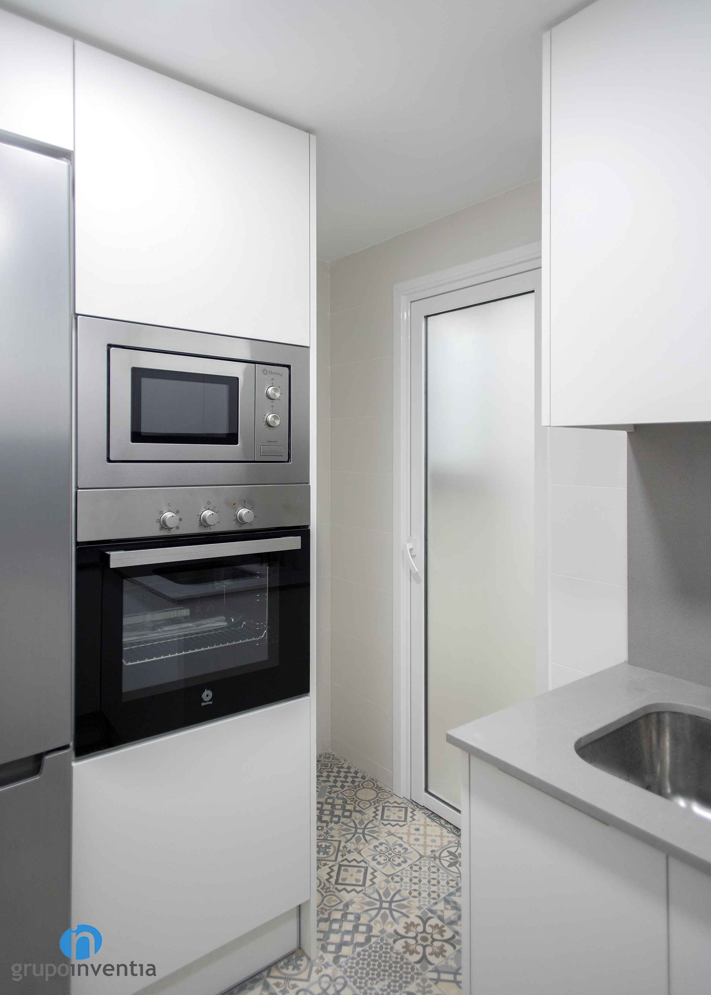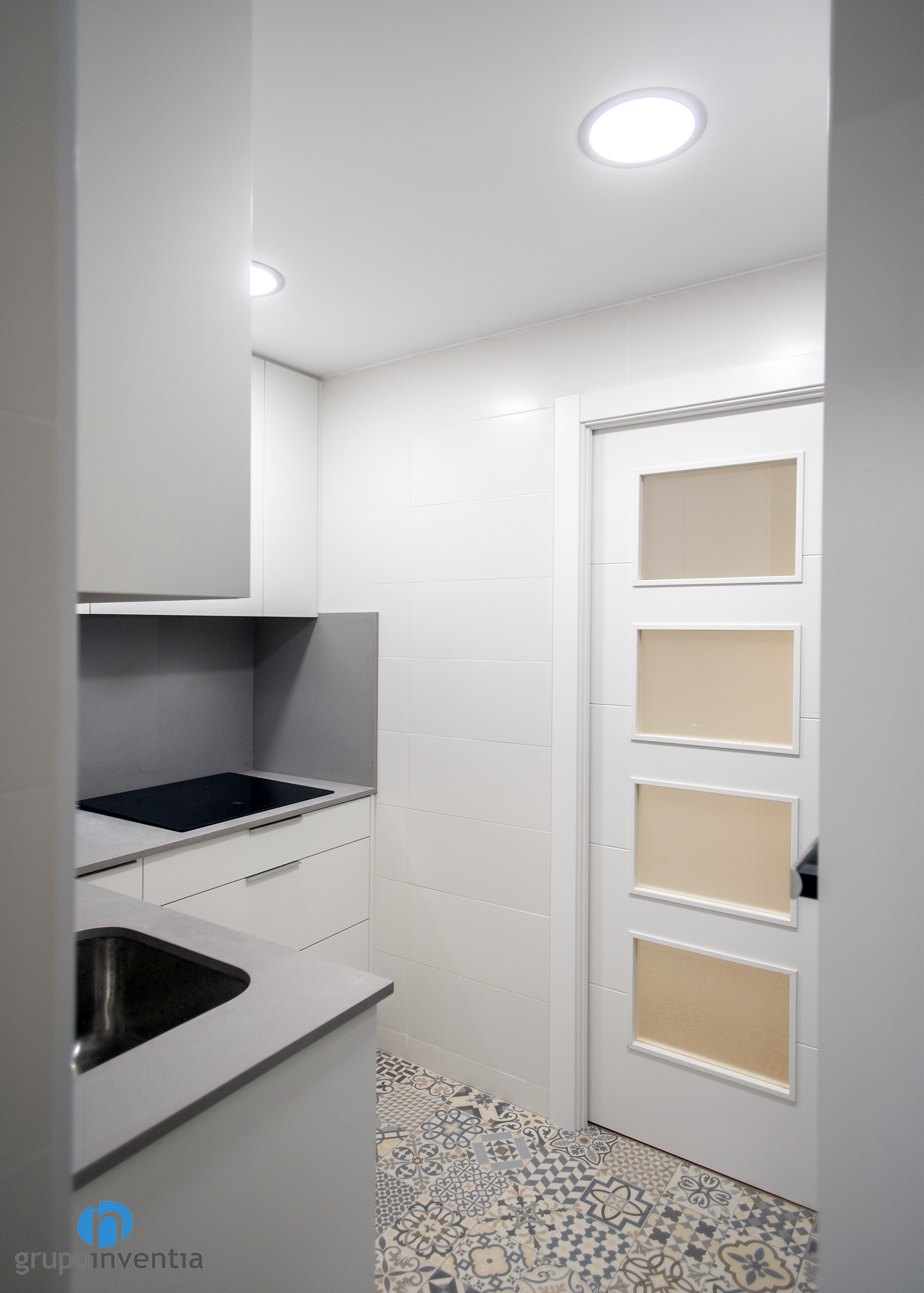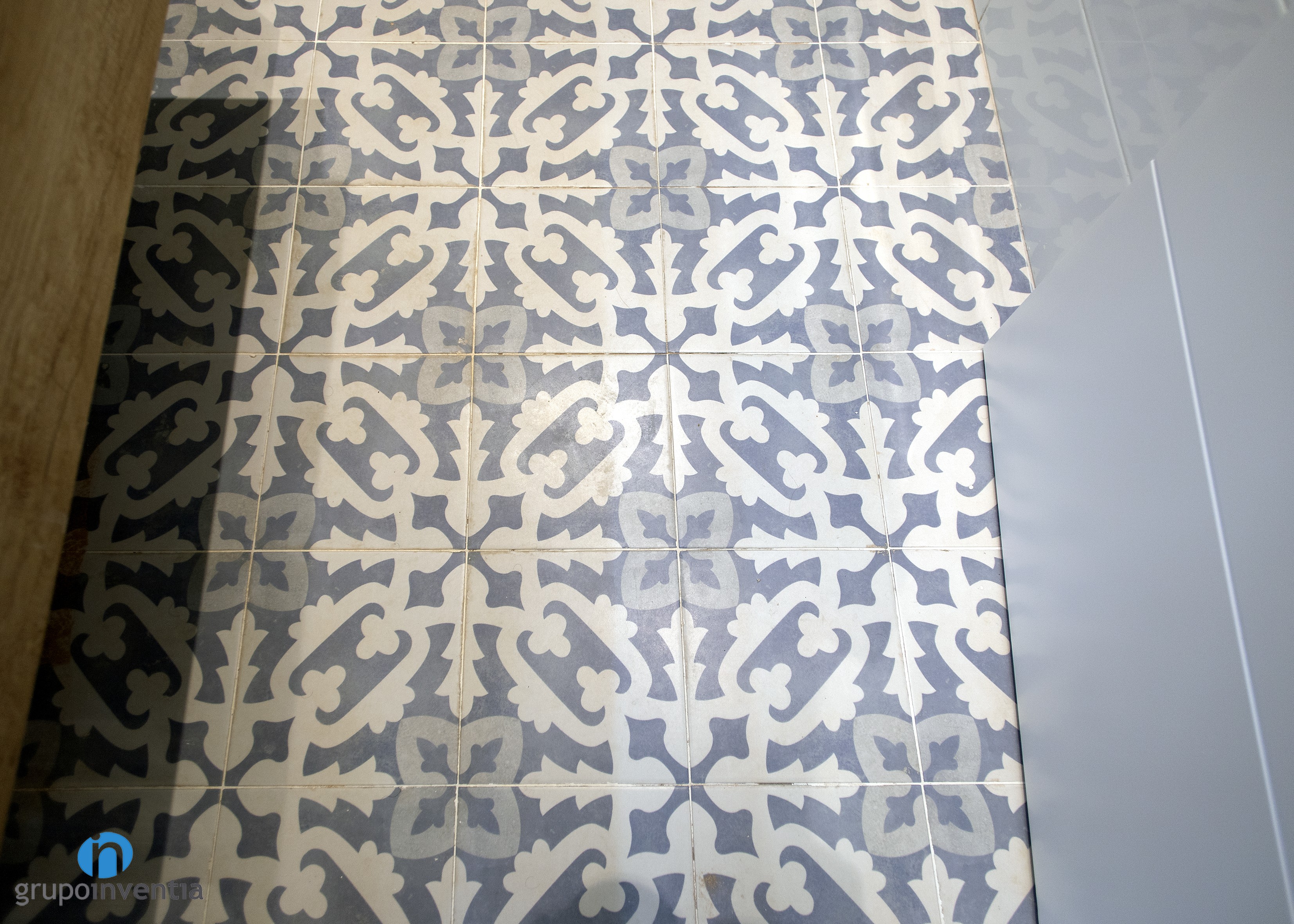 Per la seva banda, els taulells ofereixen una bona superfície de suport i estan equipats amb una pica i una placa vitroceràmica. Al seu torn, compten amb espai per a l’emmagatzematge tant en la seva zona inferior com superior. Un altre detall d’aquesta reforma de cuina és el paviment. Embolicat en una estança de tons neutres es va col·locar un terra hidràulic amb molta personalitat.