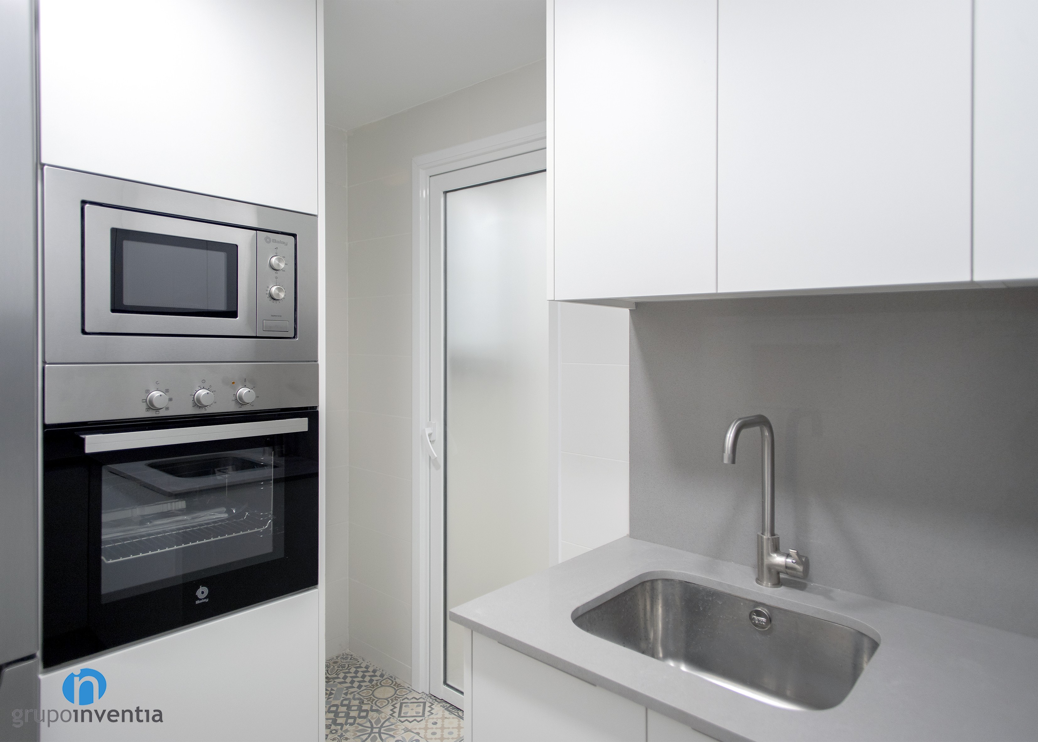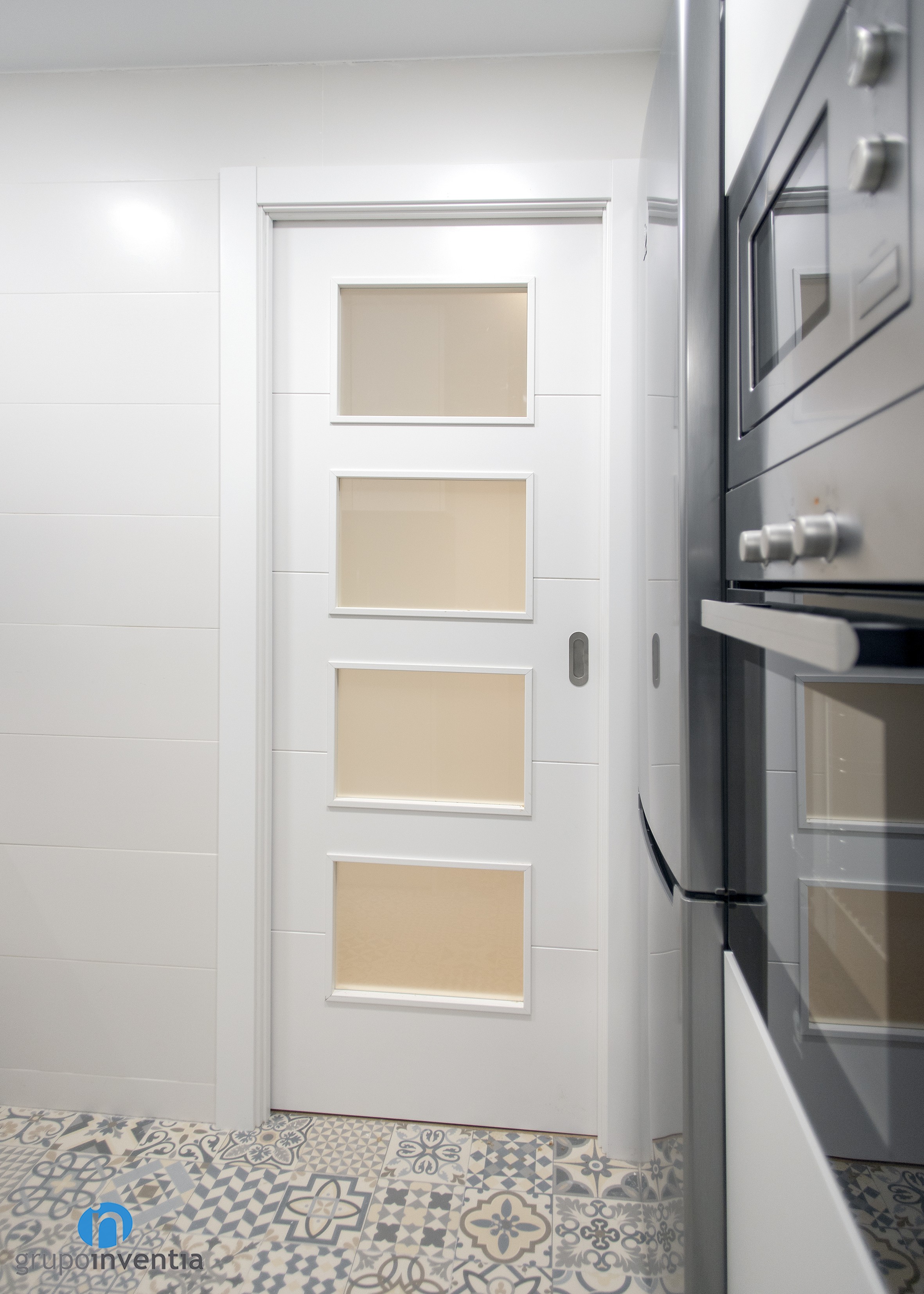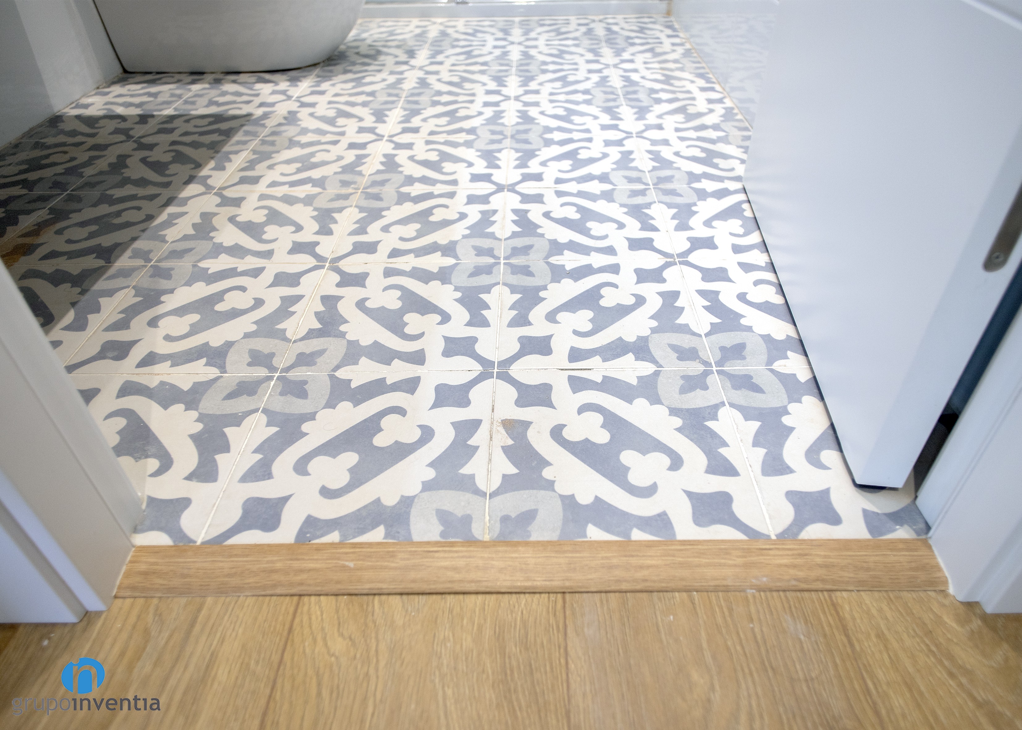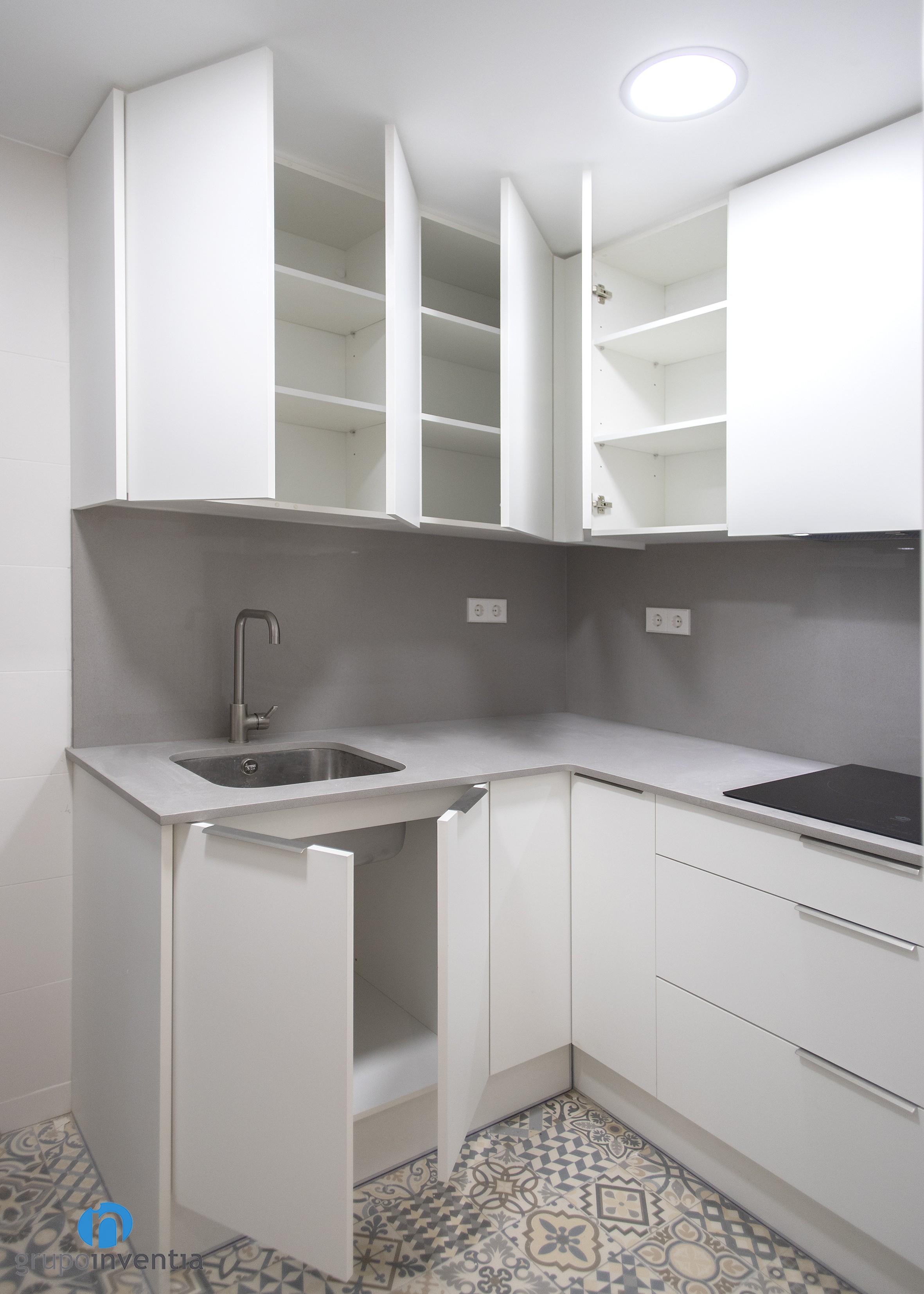 Per la seva banda, els taulells ofereixen una bona superfície de suport i estan equipats amb una pica i una placa vitroceràmica. Al seu torn, compten amb espai per a l’emmagatzematge tant en la seva zona inferior com superior. Un altre detall d’aquesta reforma de cuina és el paviment. Embolicat en una estança de tons neutres es va col·locar un terra hidràulic amb molta personalitat.