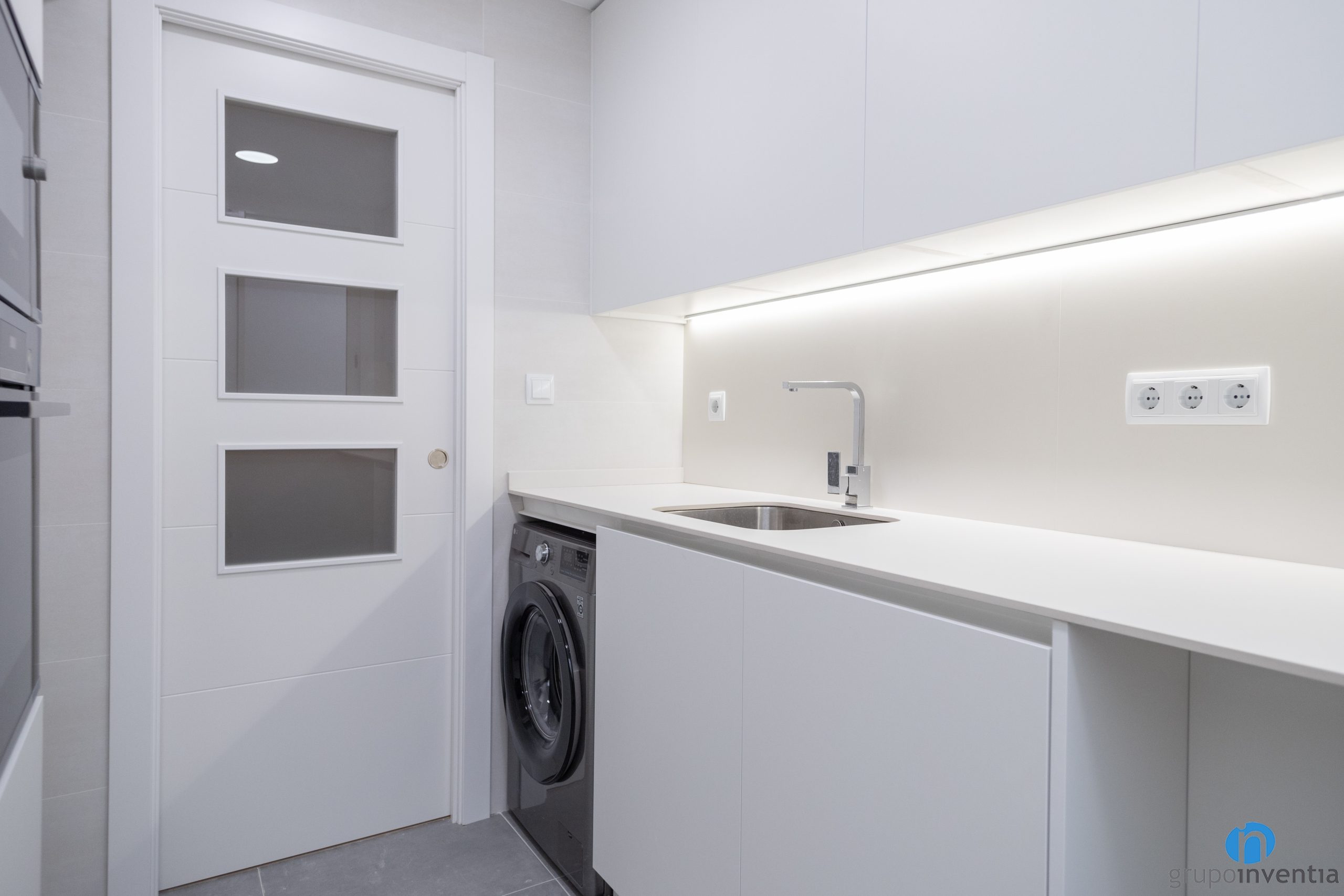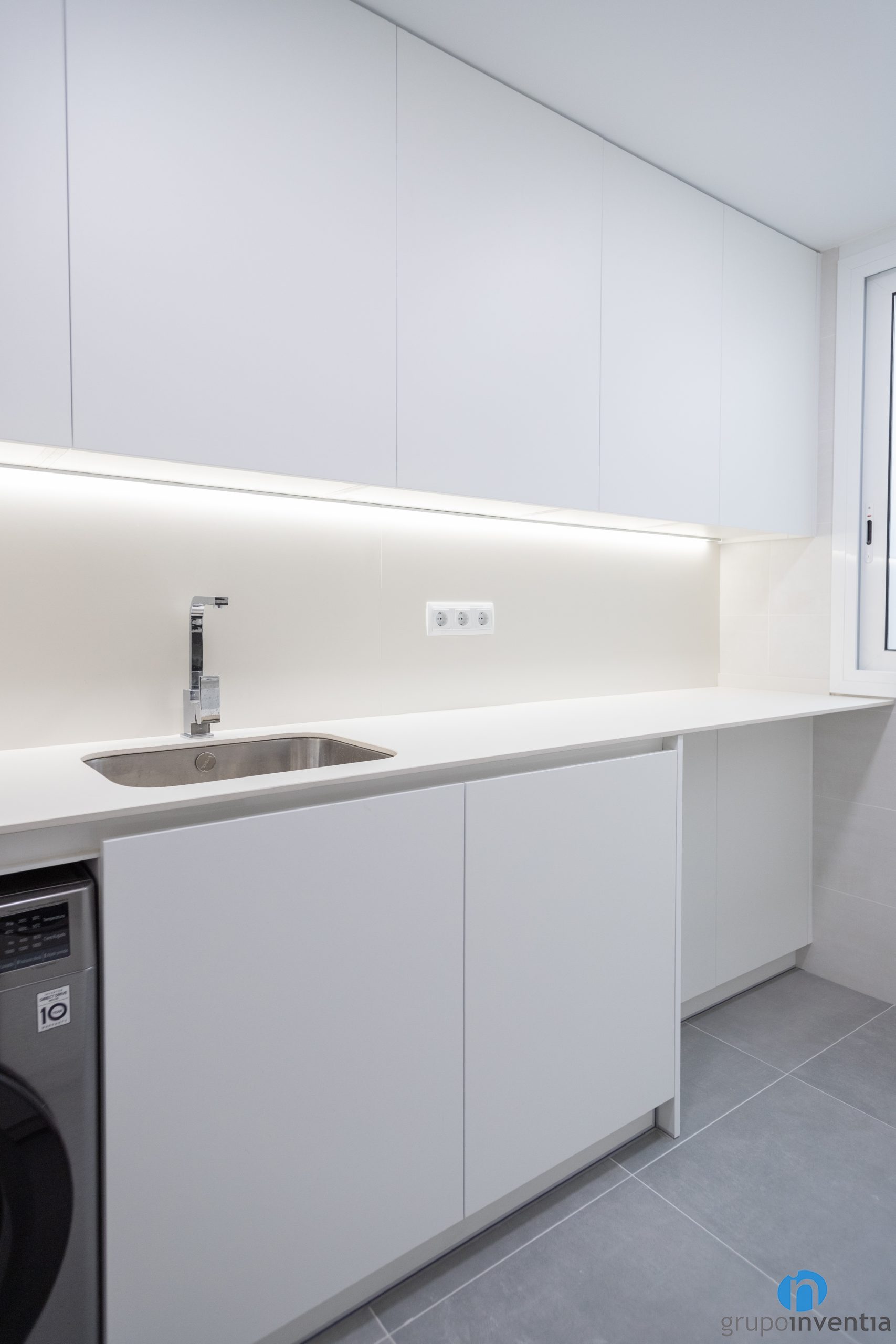 A la part dreta s’ha col·locat un taulell allargat que ofereix superfície de suport i de treball. Compta amb una pica d’un sinus i de capacitat d’emmagatzematge a la part superior i inferior. En aquesta última també s’hi han integrat la rentadora i el rentaplats.