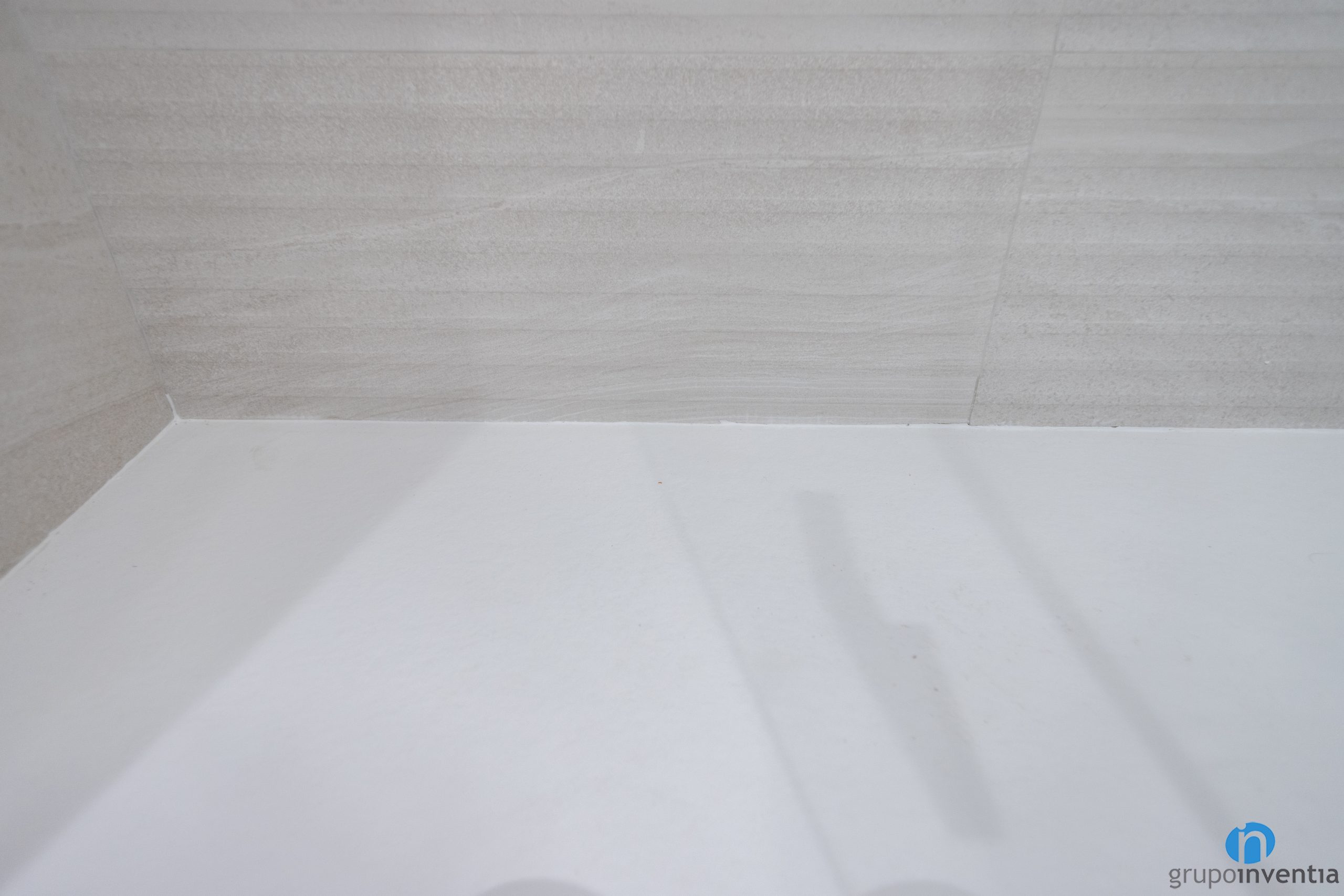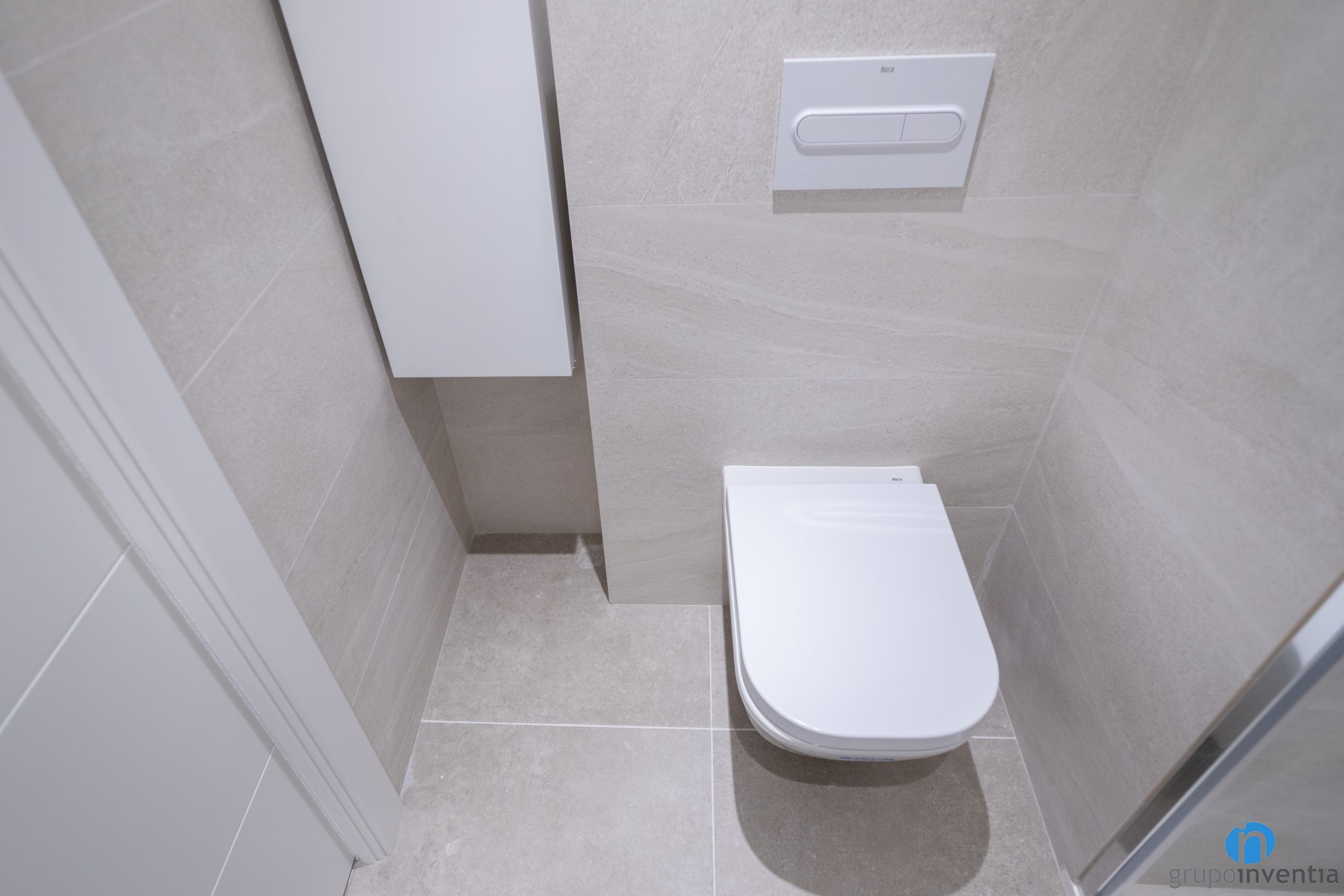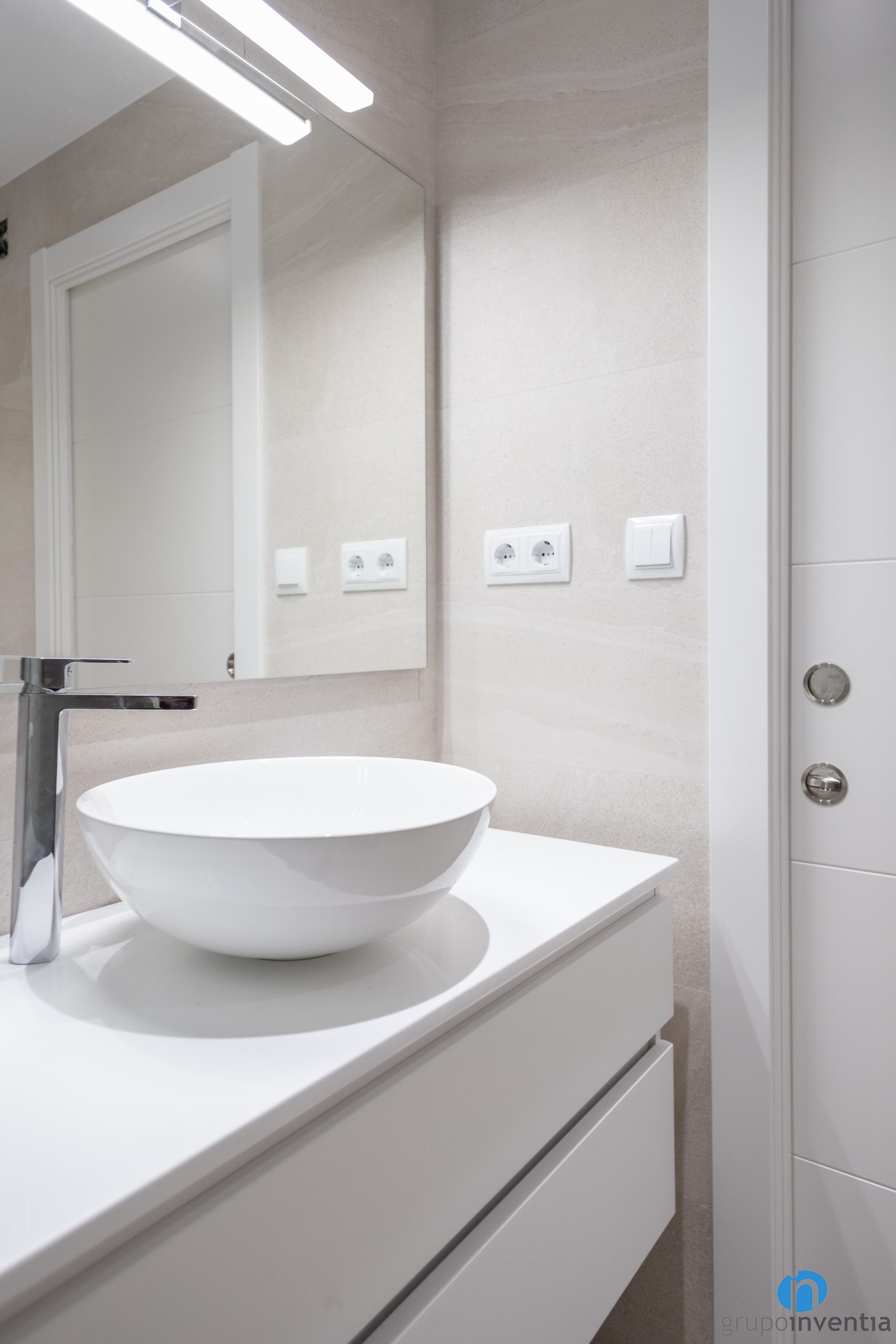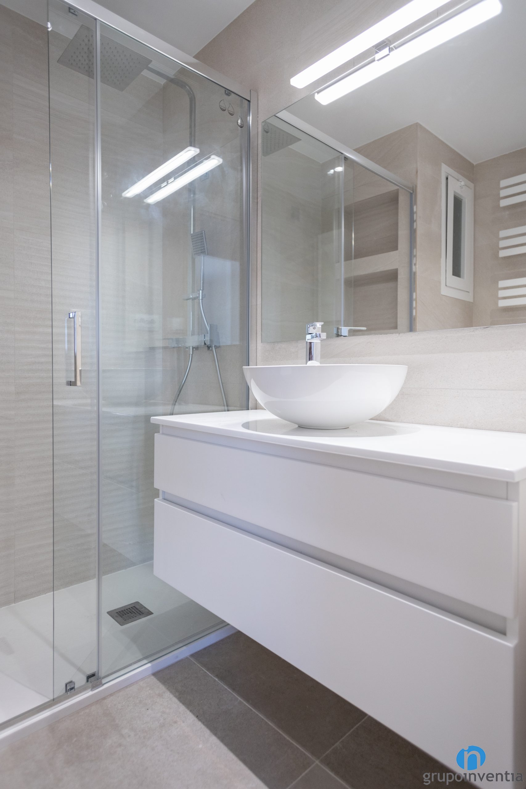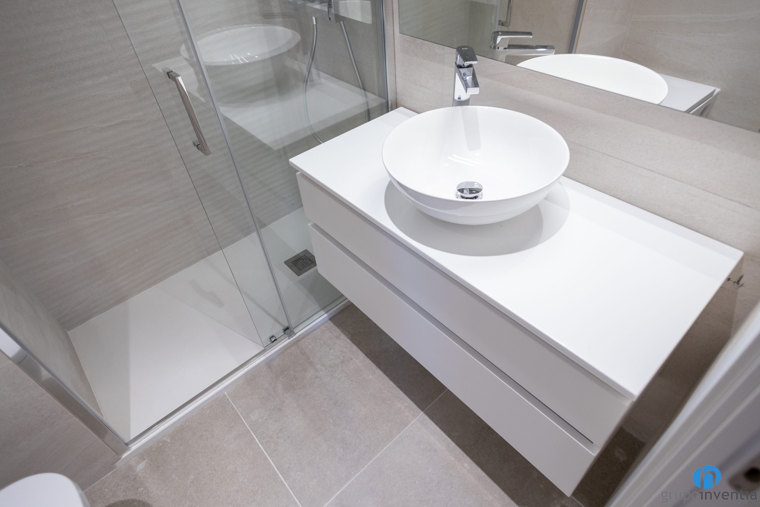 Un altre dels espais millorats en aquesta reforma a Barcelona és la cambra de bany. S’han dut a terme tasques per modernitzar la imatge i instal·lar-hi un equipament sanitari altament fincional. Ara la cambra de bany disposa d´un lavabo amb moble d´emmagatzematge incorporat, un vàter flotant i una zona d´aigües. Per aquest darrer s’hi ha instal·lat un plat de dutxa que queda protegit per mampares de portes corredisses.
