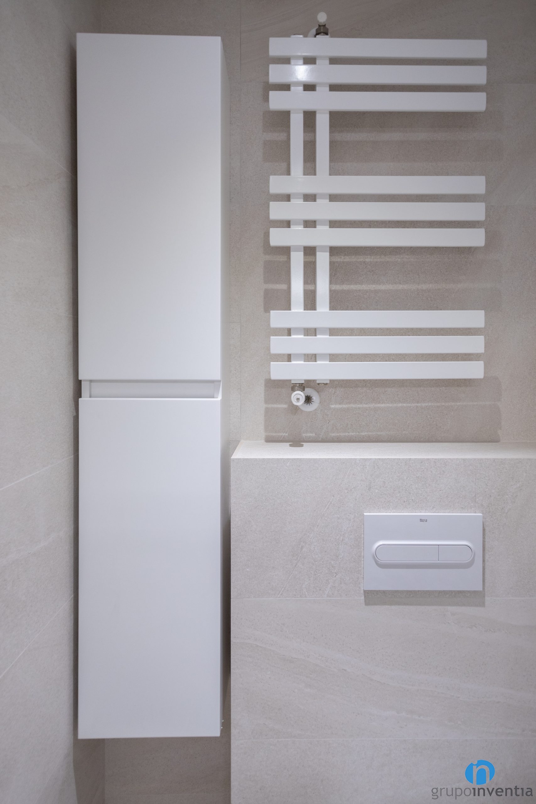 Pel que fa a la nova imatge les parets s’han enrajolat per complet amb rajoles de color beix. D’aquesta mateixa tonalitat s’han col·locat les rajoles del terra. Així es pot generar un espai lumniós i visualment ampli. Contrasta amb el color blanc del nou mobiliari de bany i de la porta corredissa dentrada.