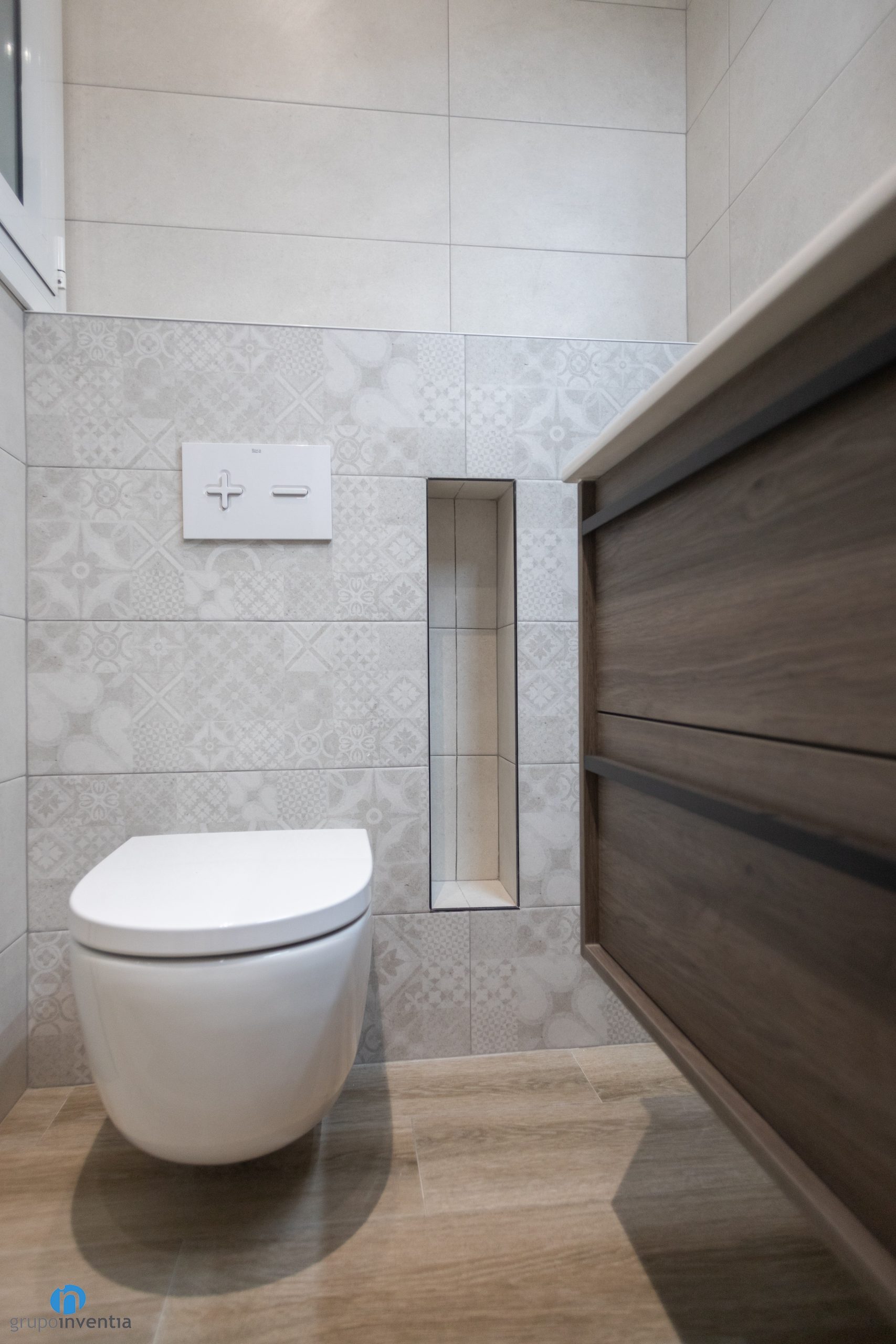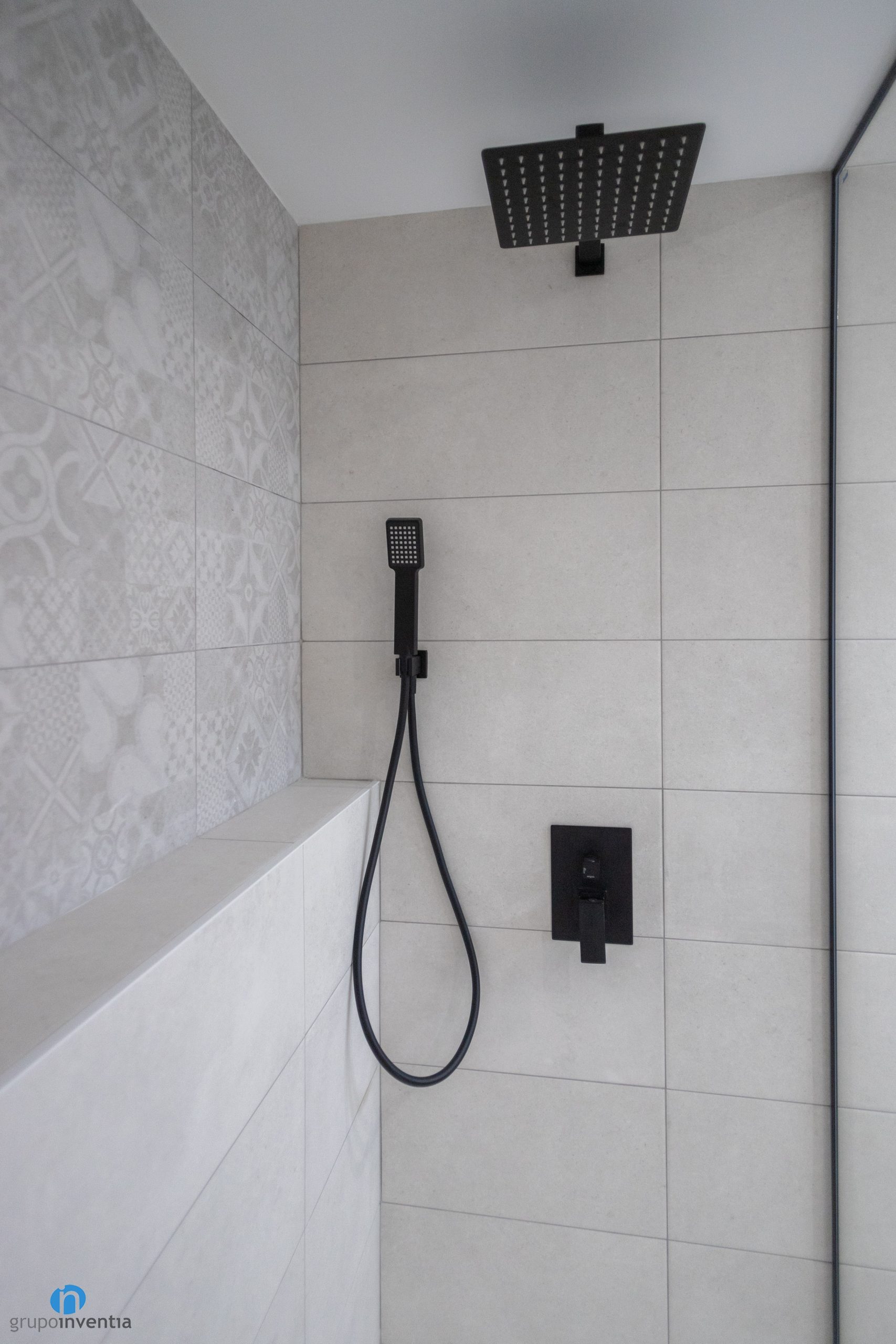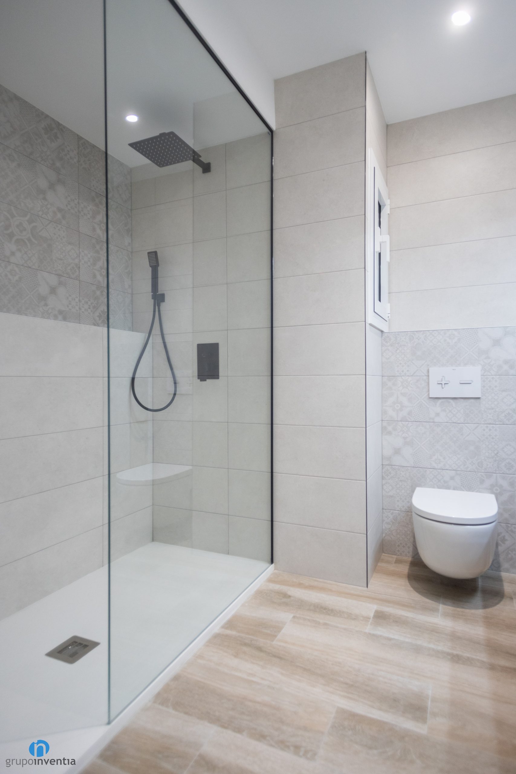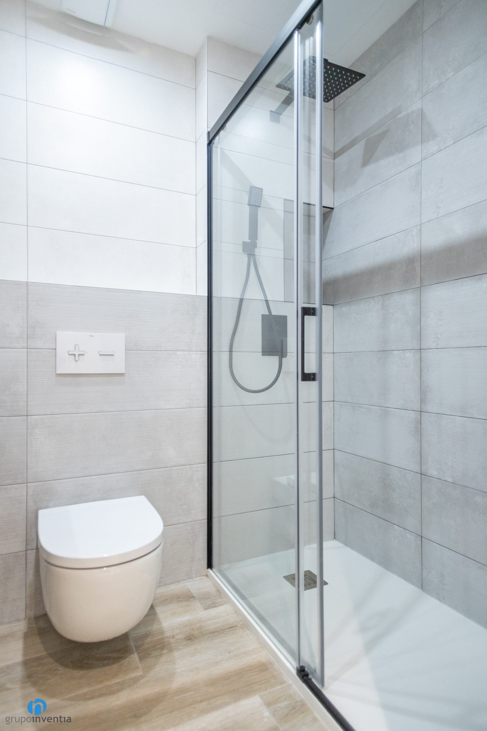 Al tractar-se d’una reforma integral completa també hem millorat les cambres de bany. En tots dos s’ha seguit una mateixa decoració en tons neutres. Així es generen espais molt lluminosos i visualment amplis. La part inferior de les parets s’ha enrajolat amb rajoles de color gris. Mentre que per la part superior s’han fet servir rajoles de color blanc. Per al paviment dels banys s’ha escollit un terra ceràmic imitació parquet.