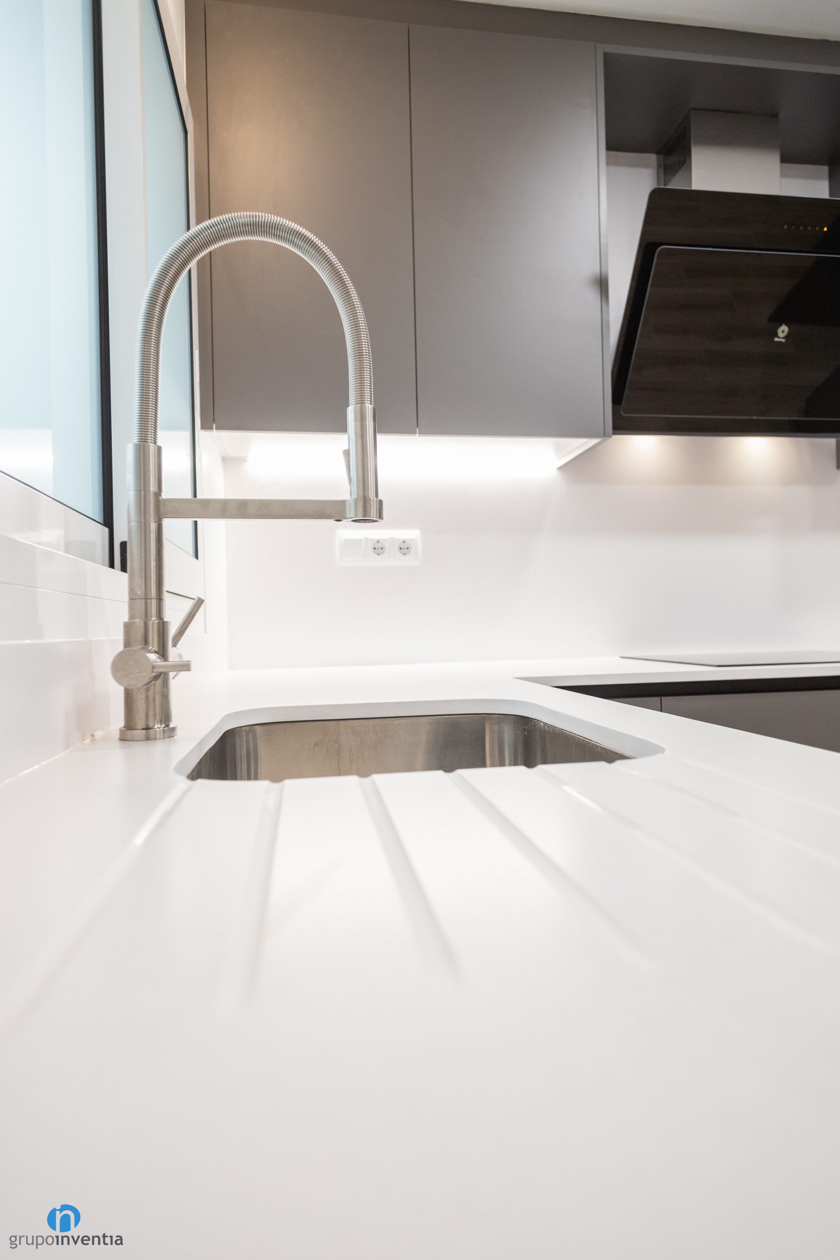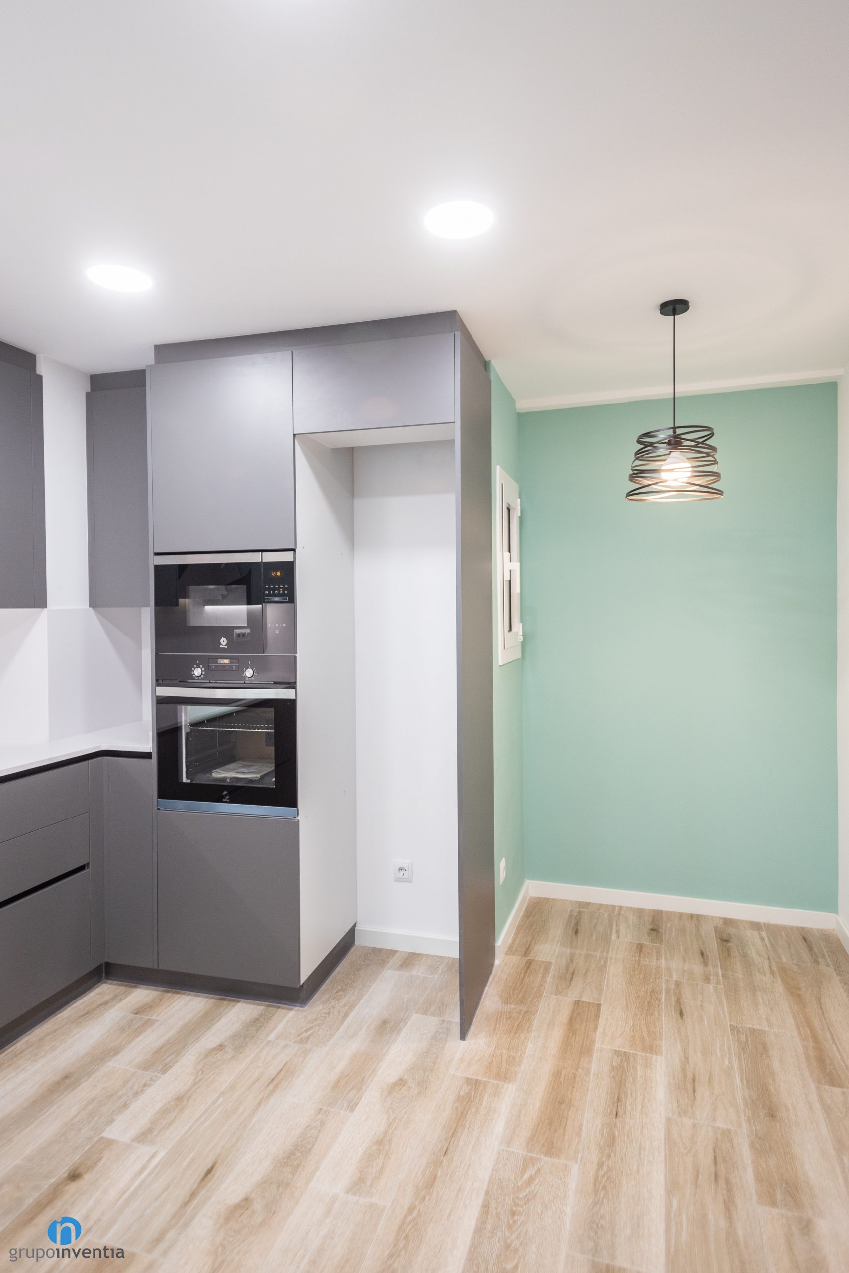 En aquesta nova reforma integral a Barcelona ens hem encarregat de renovar completament la cuina. Se situa en una estada independent i s’ha escollit un moble de cuina en forma d’U. A més a la part inferior del taulell de cuina hi ha diversos calaixos i armaris que aporten una gran capacitat d’emmagatzematge.