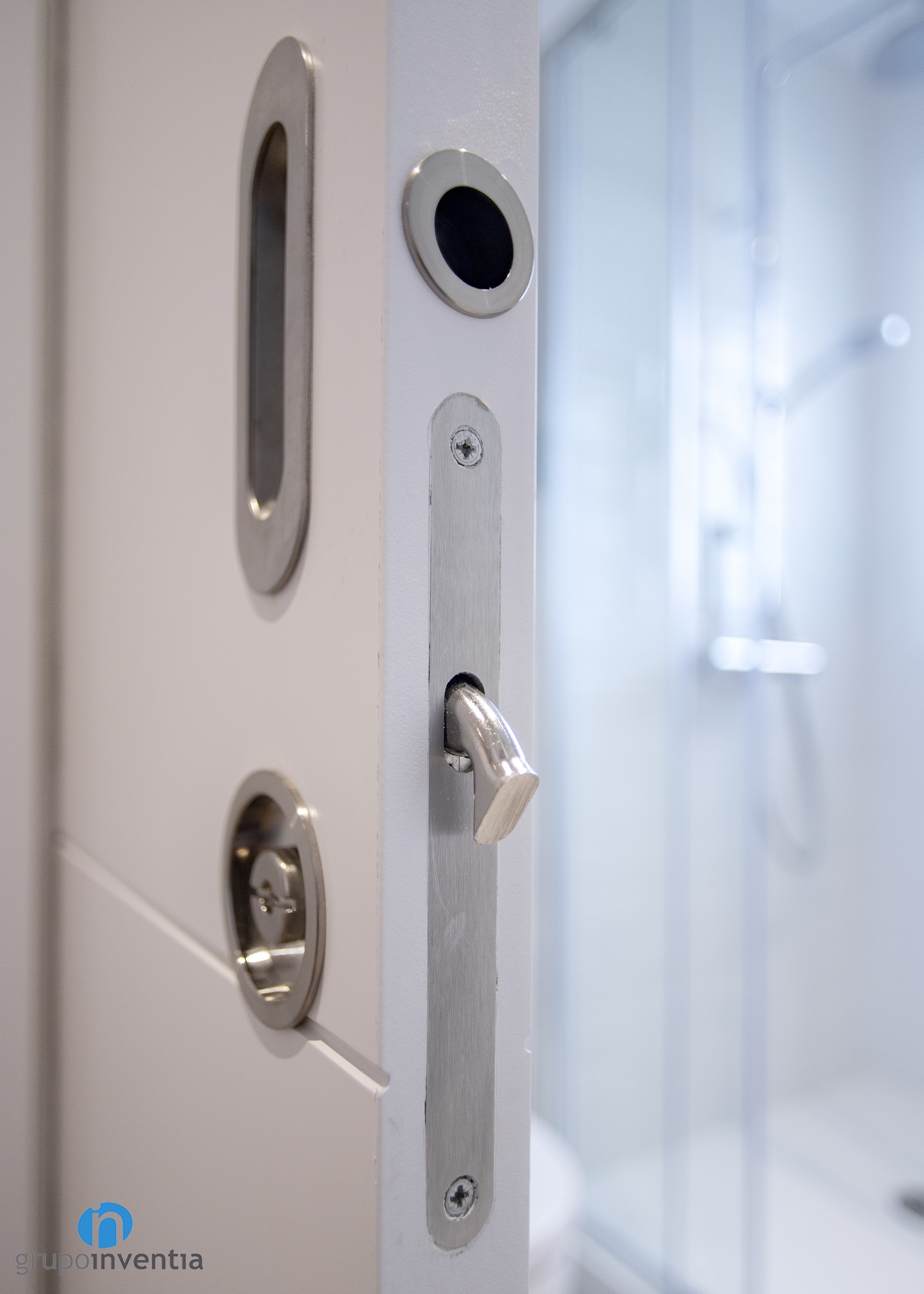 També disposa d’un equipament sanitari complet, compost per un lavabo amb moble d’emmagatzematge incorporat, un vàter suspès i una dutxa cantonera protegida amb mampares de portes corredisses transparents.