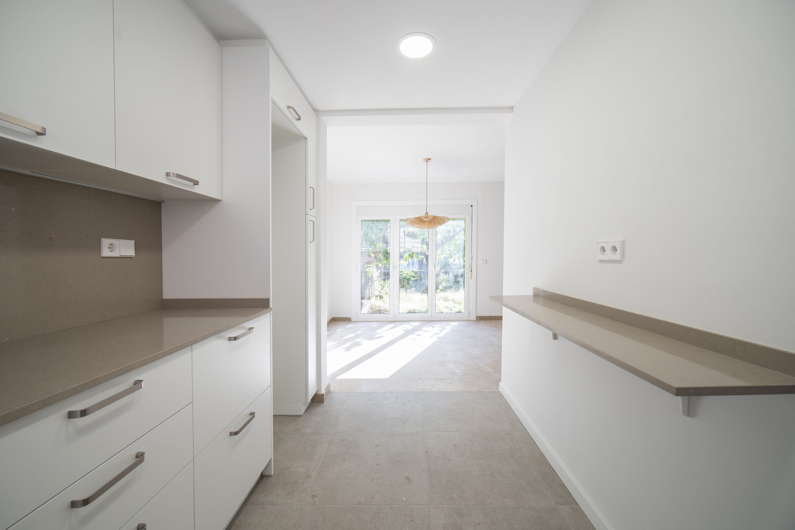 Per a aquesta reforma de cuina, s’ha mantingut la imatge global de la casa. El nou mobiliari de cuina cuina és de color blanc i es combina amb uns taulells i terra en tons marrons. Com a resultat la cuina és àmplia i ofereix una mobilitat excel·lent, a més de generar un ambient agradable i poc recarregat.