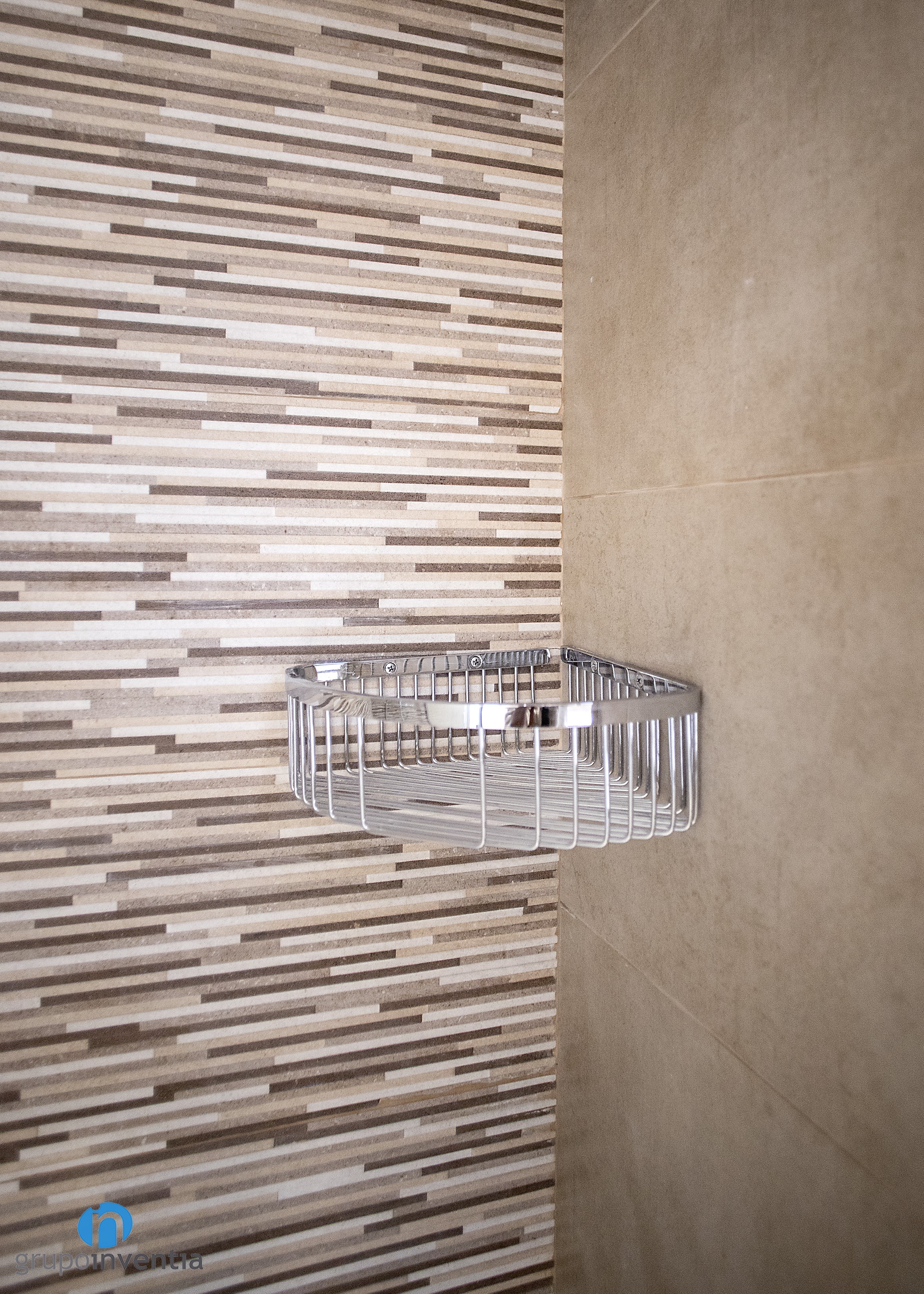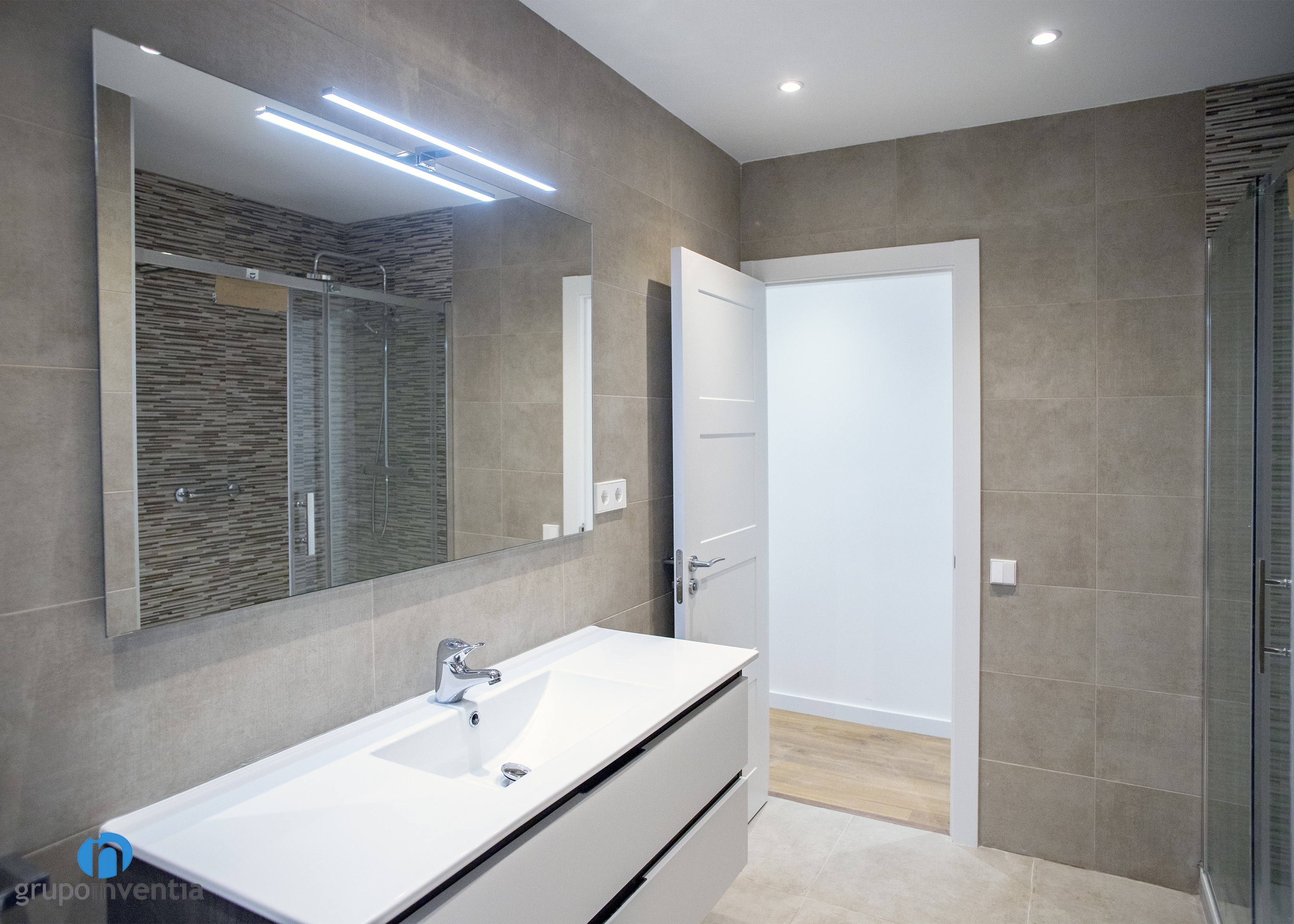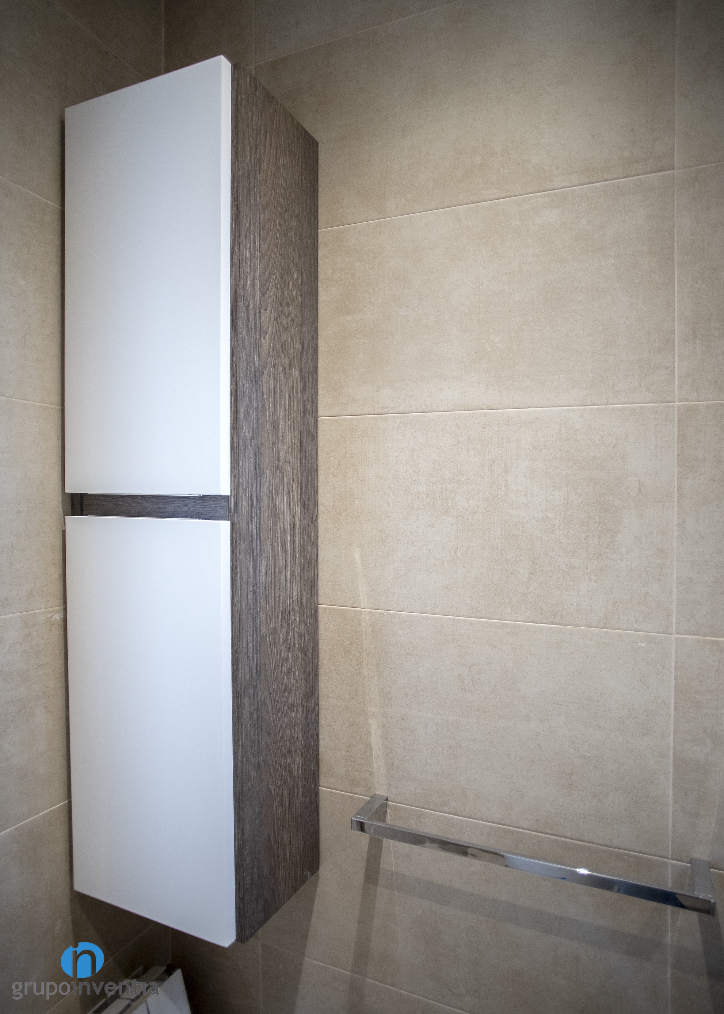 Per l’interiorisme es va apostar per una imatge neutra, creant un ambient fresc i agradable. Les parets es van enrajolar completament amb grans rajoles de color beige, mateixa tonalitat utilitzada en les rajoles del paviment. Això permet la introducció d’altres acabats en l’estança, com les rajoles tipus mosaic de la paret de la dutxa o els acabats en fusta blanca del moble de bany.