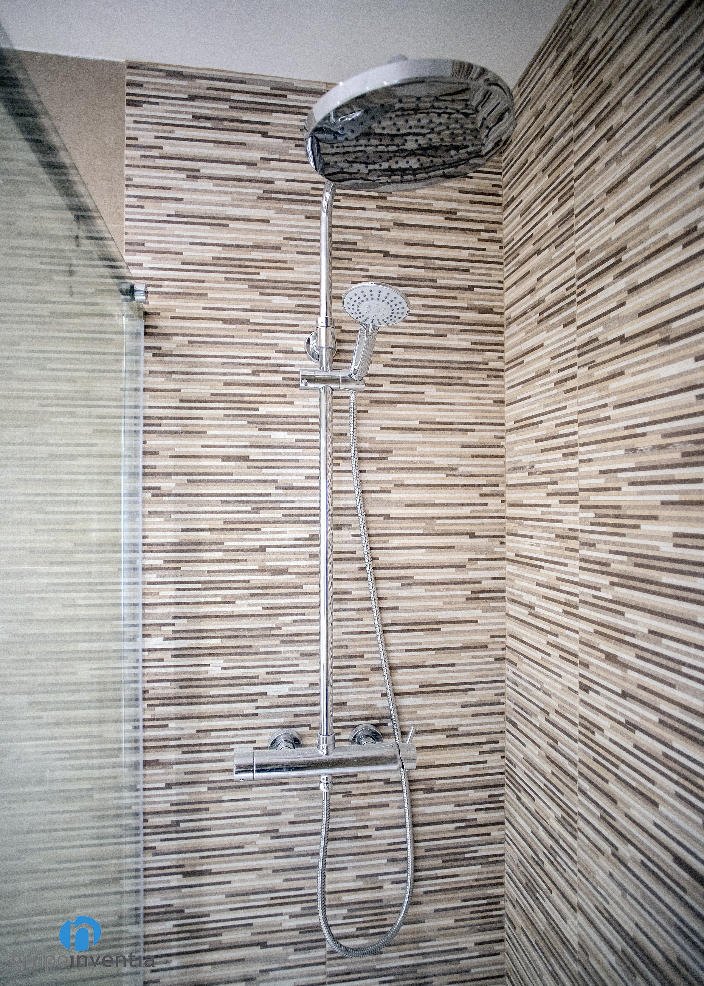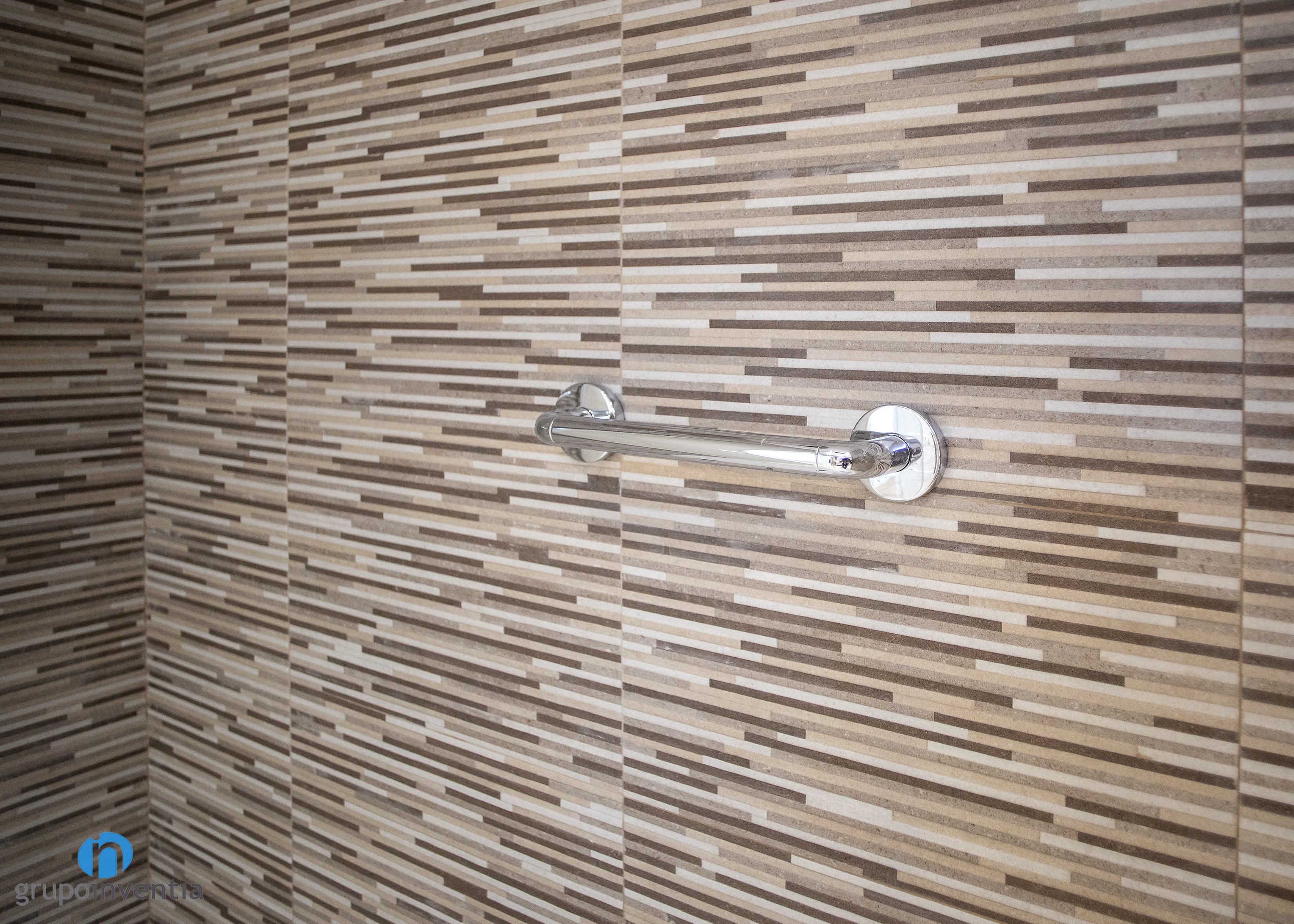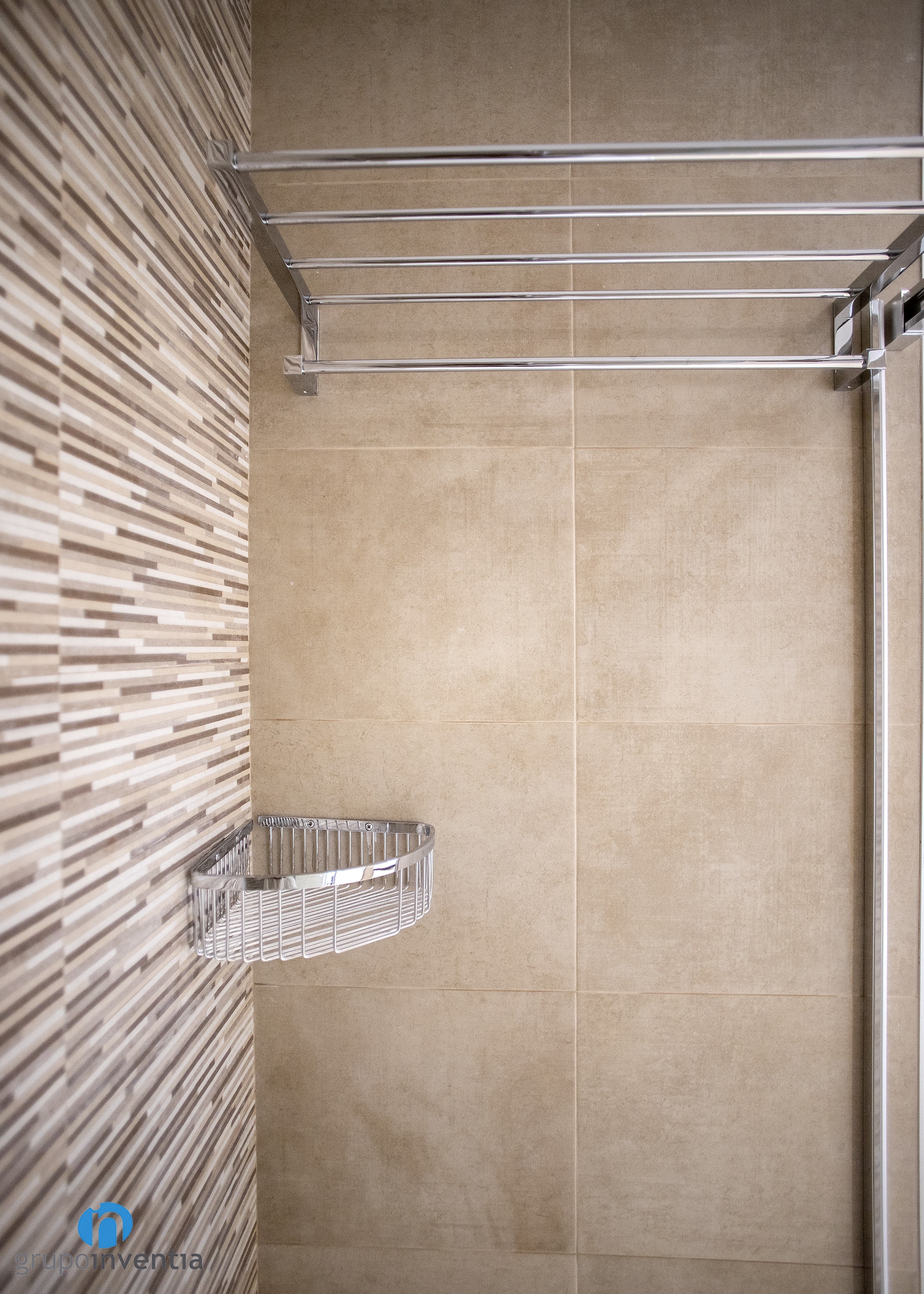 Per l’interiorisme es va apostar per una imatge neutra, creant un ambient fresc i agradable. Les parets es van enrajolar completament amb grans rajoles de color beige, mateixa tonalitat utilitzada en les rajoles del paviment. Això permet la introducció d’altres acabats en l’estança, com les rajoles tipus mosaic de la paret de la dutxa o els acabats en fusta blanca del moble de bany.