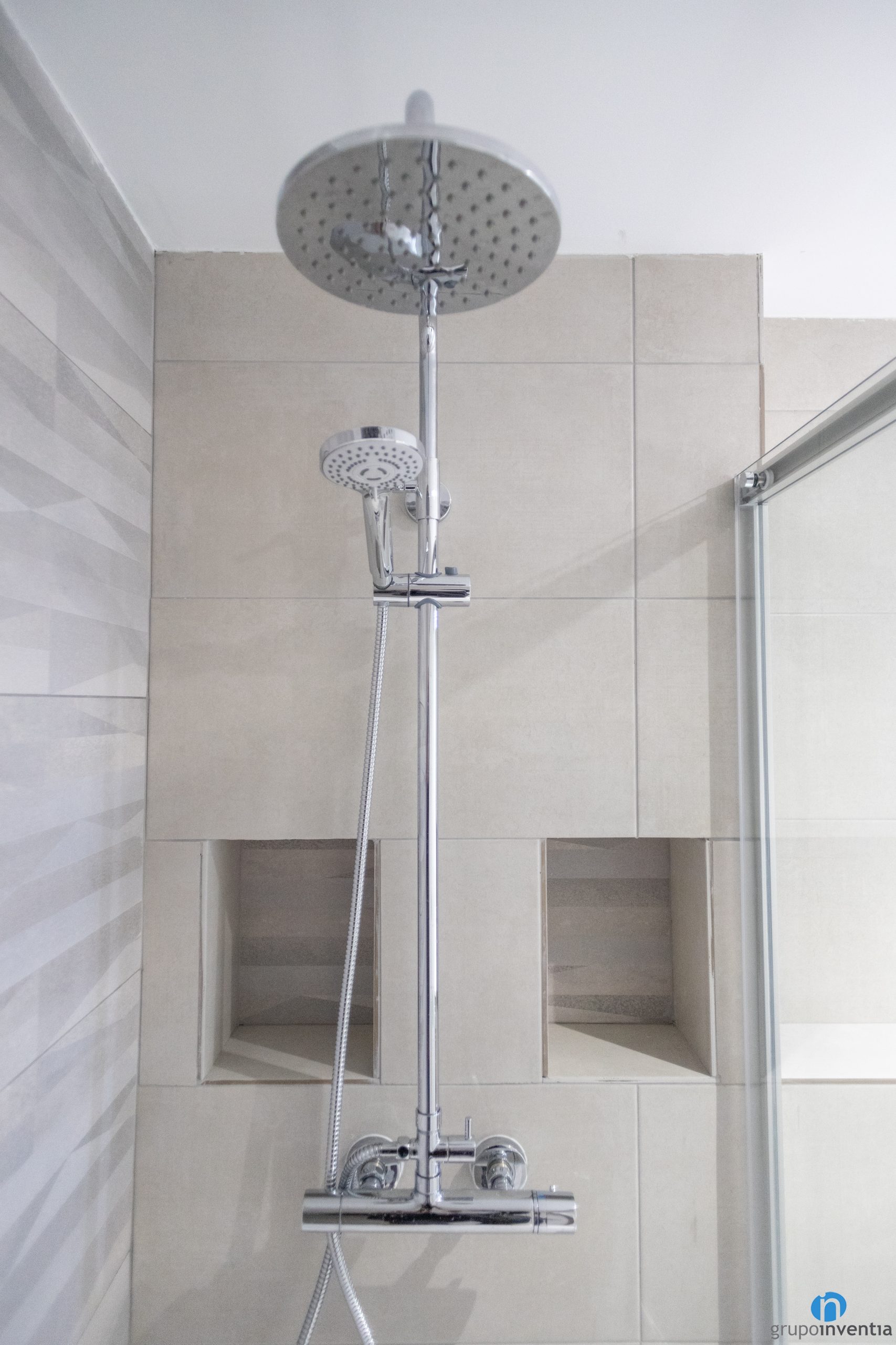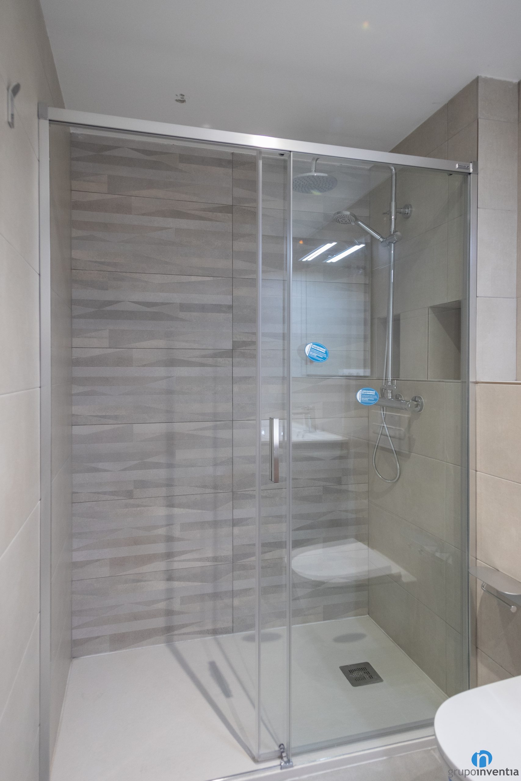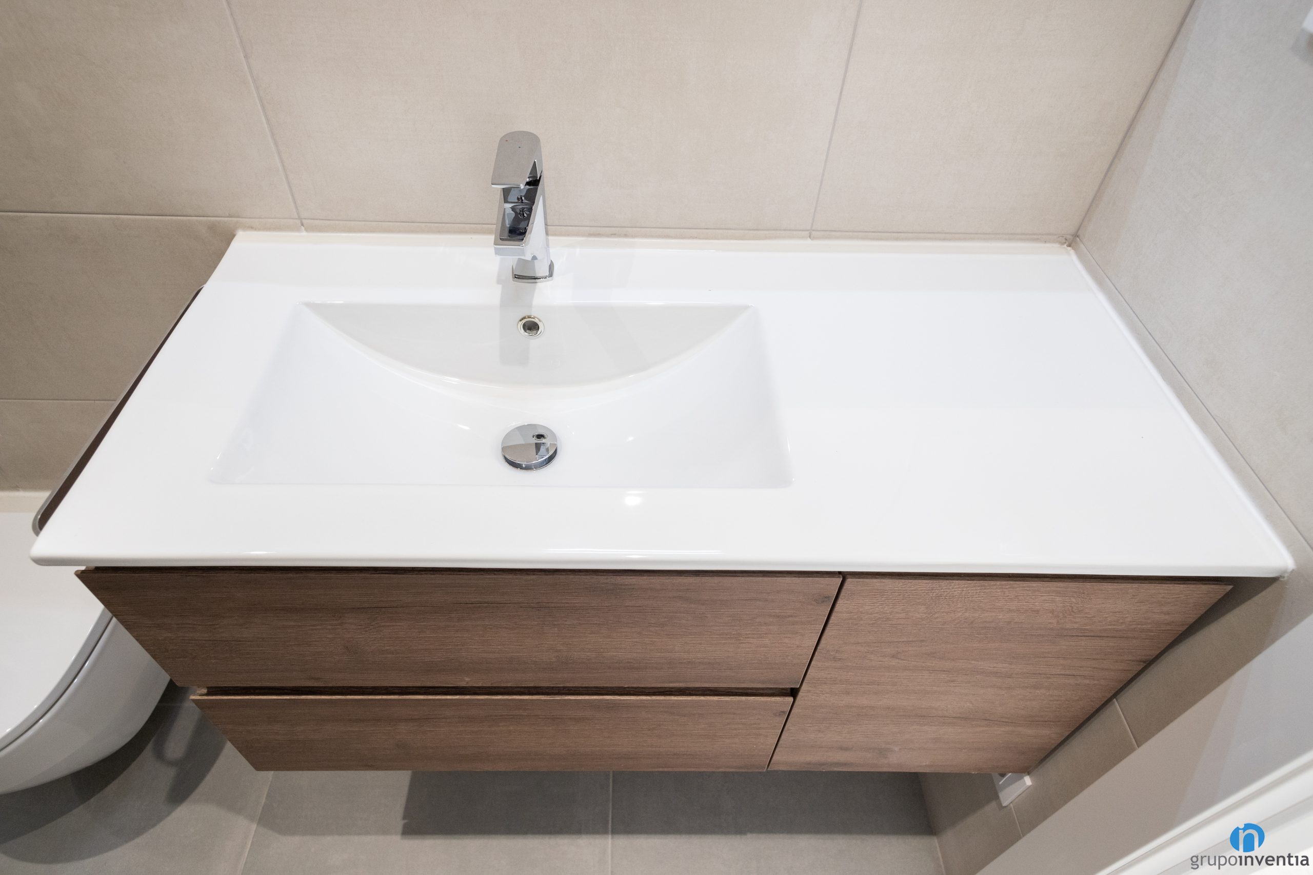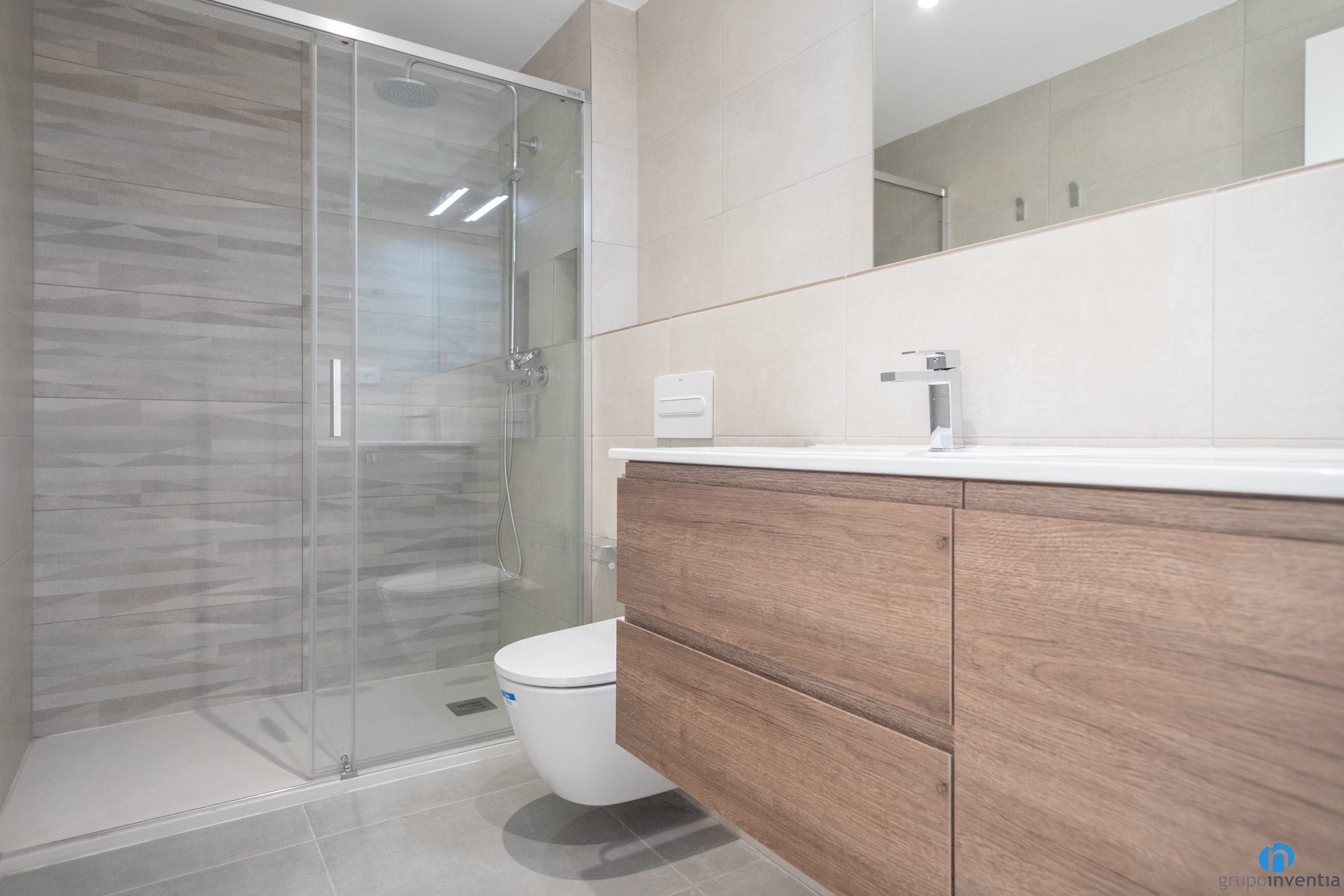 Aquesta reforma de bany també s’ha acabat amb la instal·lació d’un nou equipament sanitari. Ara el bany compta amb un lavabo amb moble demmagatzematge incorporat, un vàter i una zona daigües. Per a aquesta última s’hi ha instal·lat un plat de dutxa que queda protegit per unes mampares de portes corredisses.