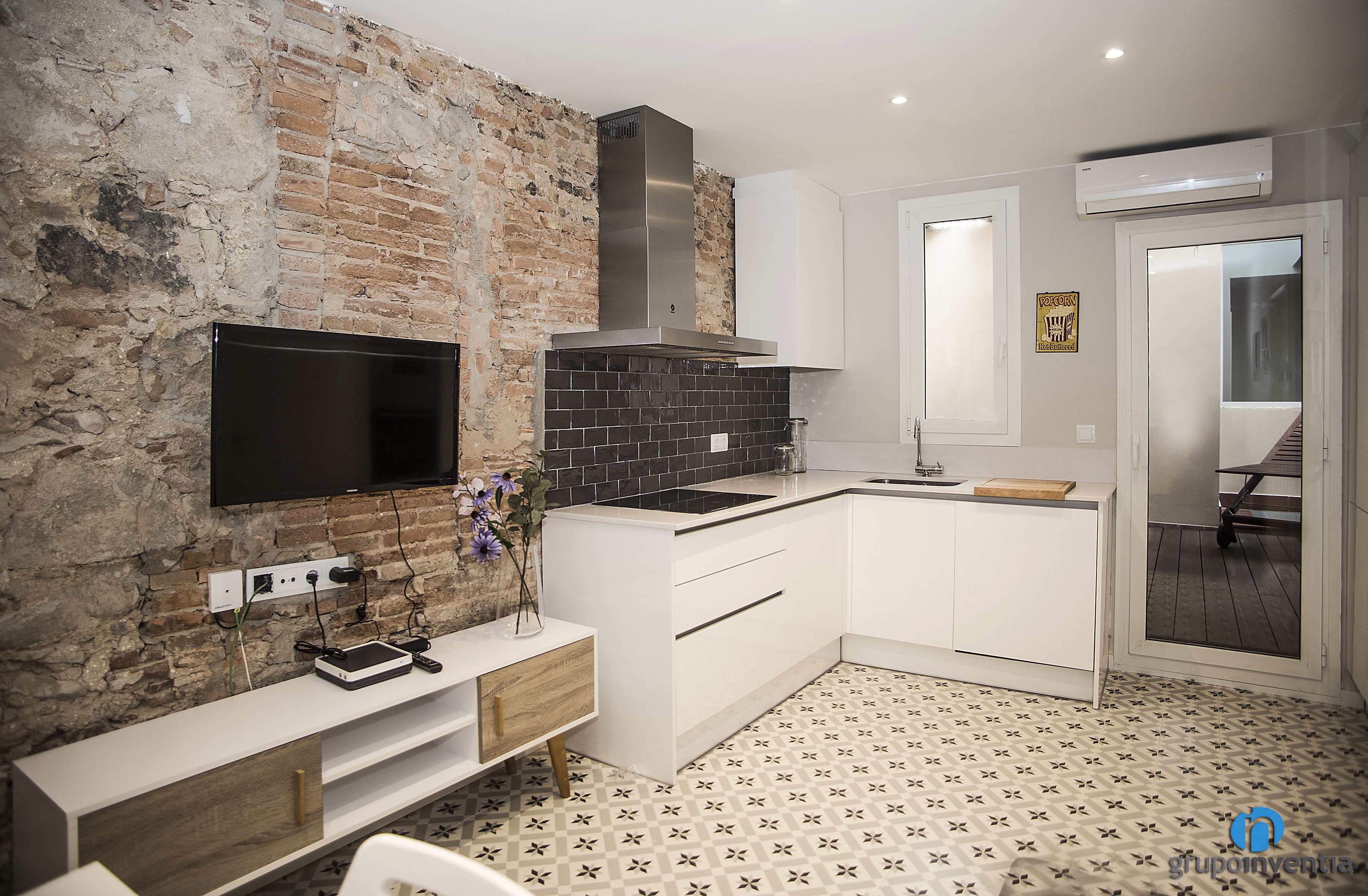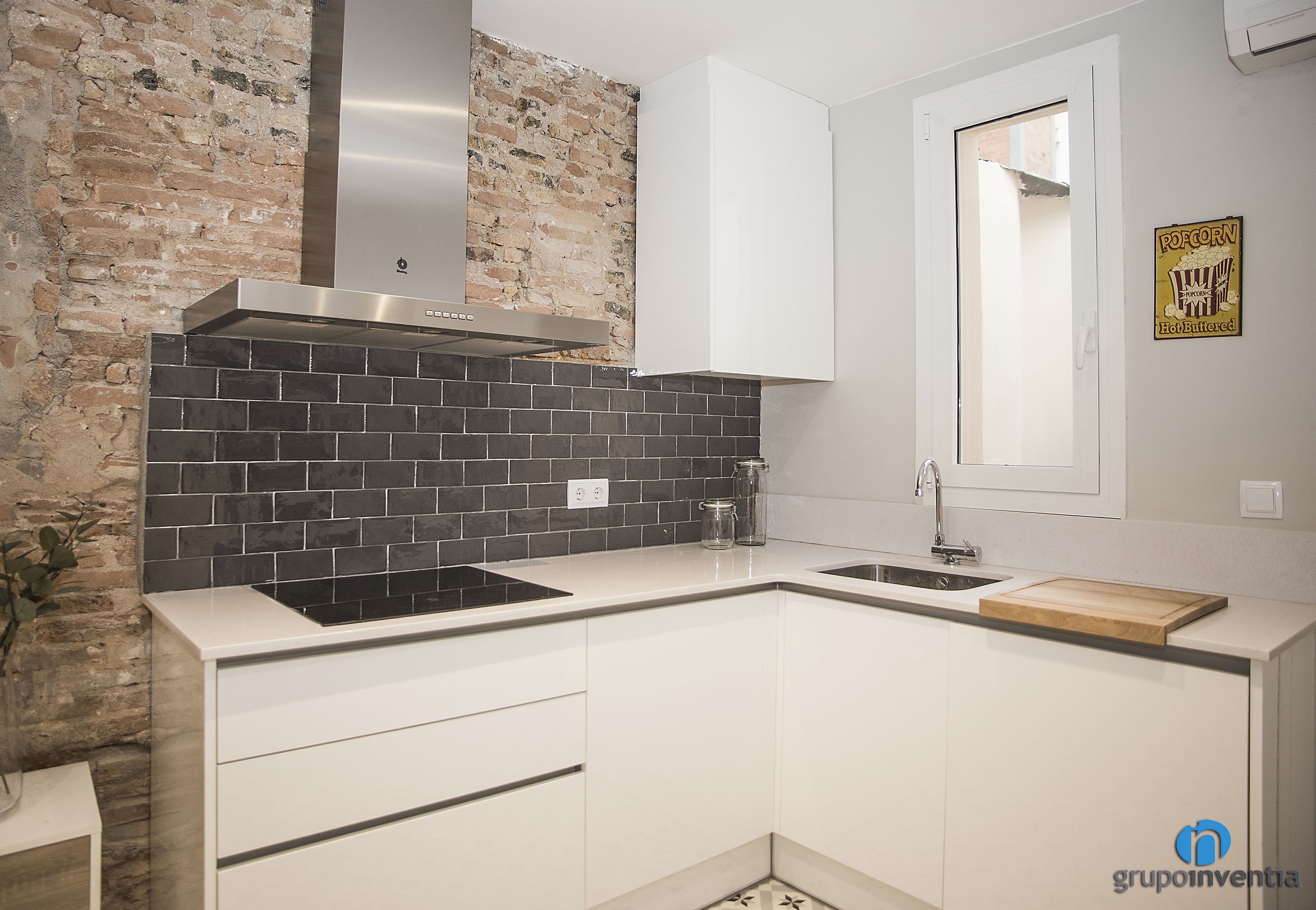 Es tracta d’una cuina oberta al saló i distribuïda en forma de L. El tram de taulell de cuina col·locat a la part esquerra està equipat amb una placa vitroceràmica, mentre que el de la dreta compta amb una pica individual. Aquest es va col·locar just a sota de la finestra, garantint així la ventilació de l’espai. D’aquesta reforma de cuina també destaquen la capacitat d’emmagatzematge, al llarg de tota la part inferior del taulell, i l’enrajolat de la paret, on es van utilitzar rajoles bisellades de color gris.