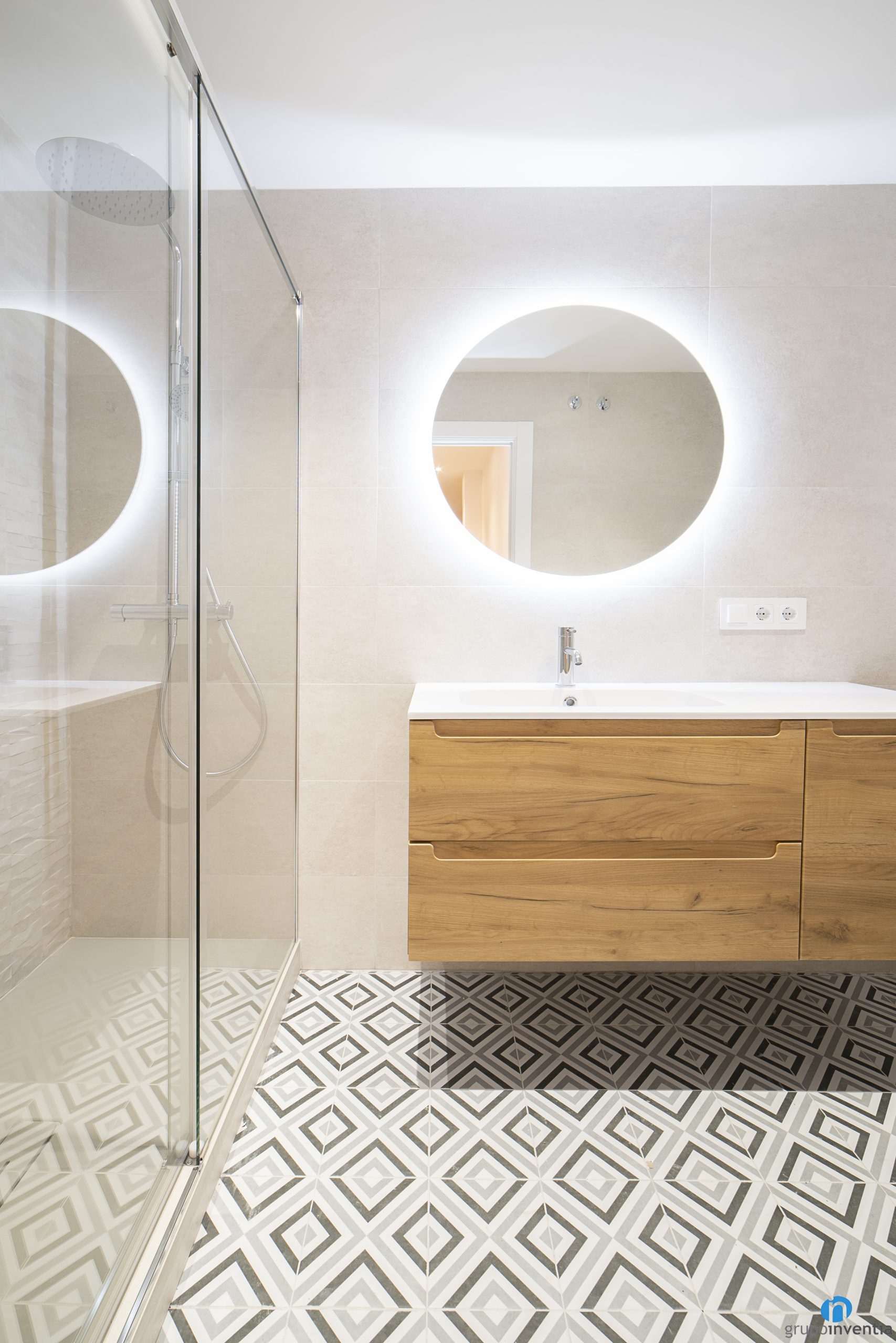 Per a la imatge interior del bany, s’ha seguit la línia general de disseny contemporani de la resta de l’habitatge. Les parets s’han enrajolat per complet amb rajoles de color beix i s’han combinat amb un terra de rajoles tipus hidràulic. El resultat final ofereix una imatge moderna i un ambient molt agradable.