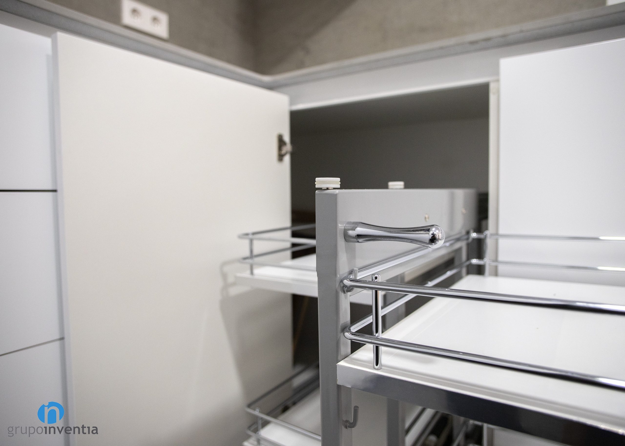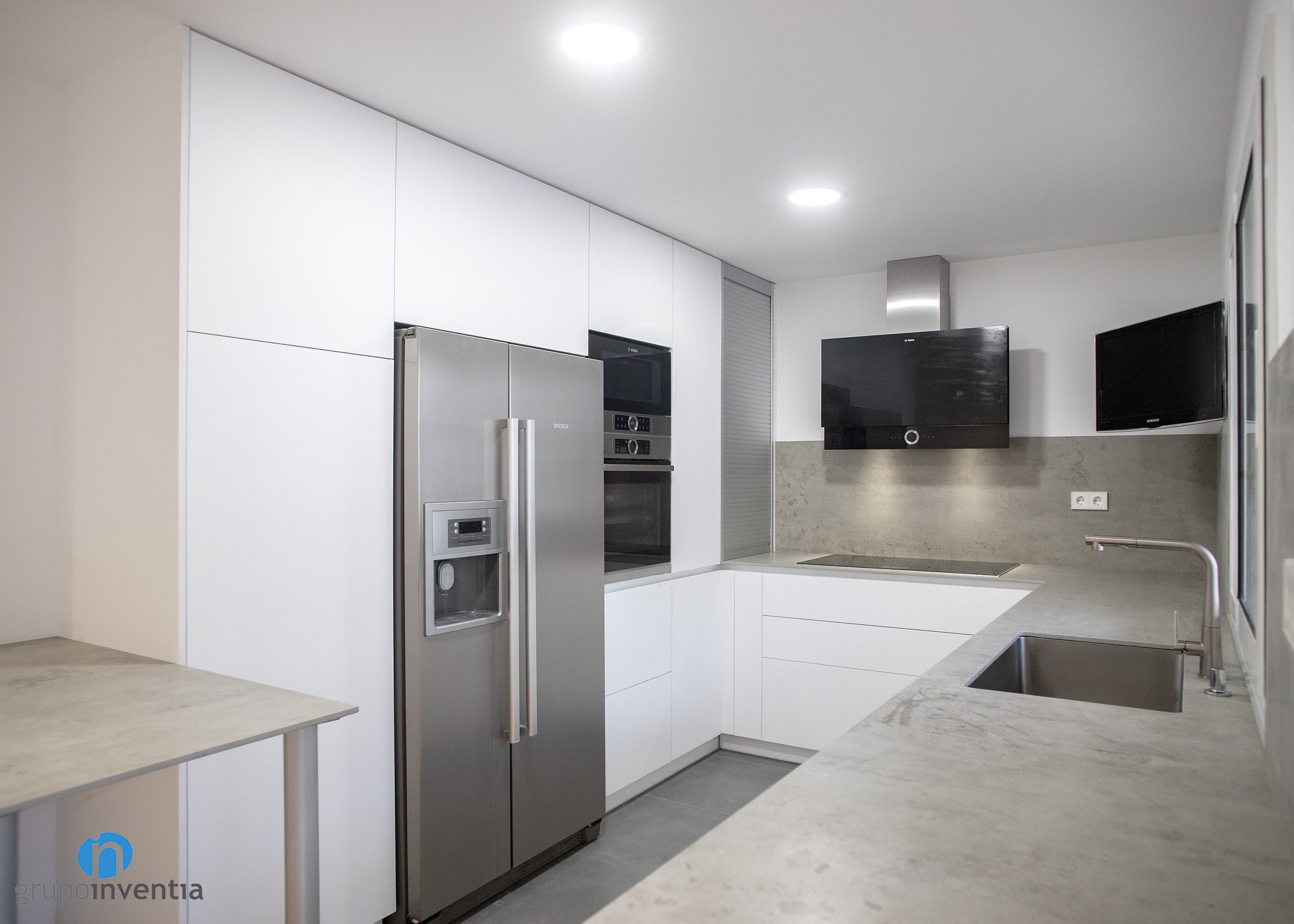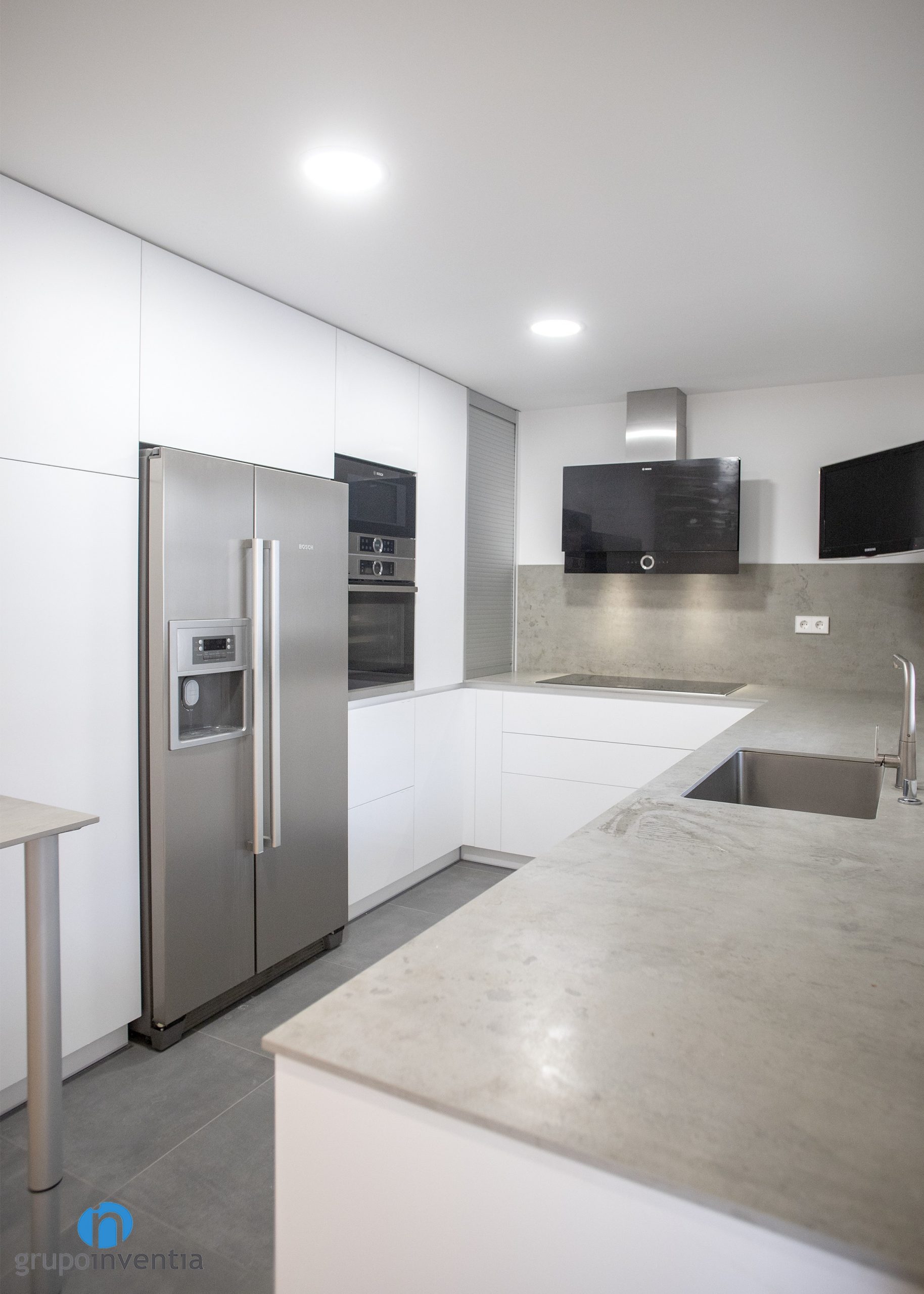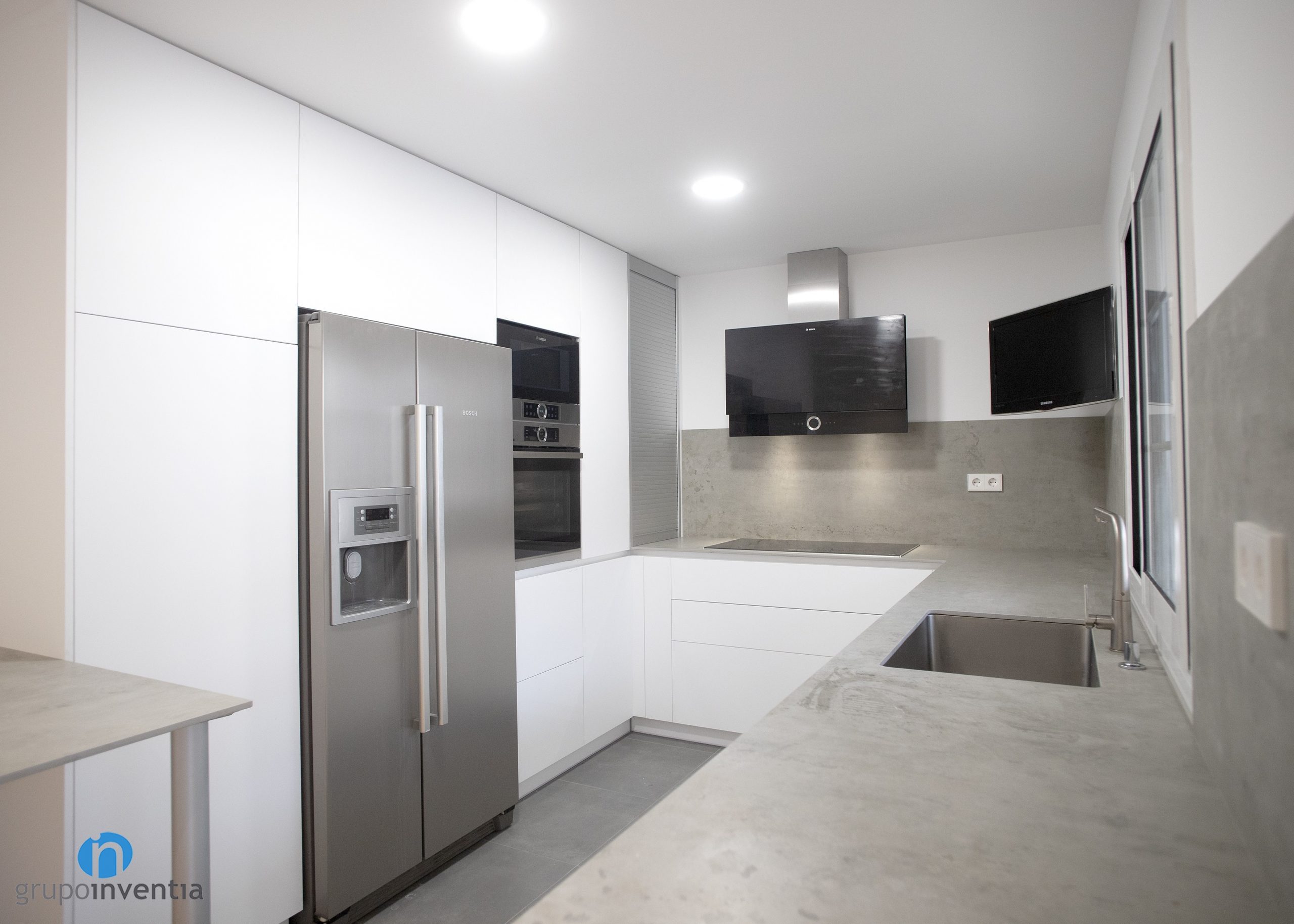 El costat esquerre d’aquesta reforma de cuina l’ocupen els electrodomèstics, concretament la nevera, el forn i el microones. A la part central apareix el primer tram de taulell, equipat amb una placa vitroceràmica. Una nova taulell ocupa tota la part dreta de la cuina. Aquest aporta una àmplia superfície de suport i de treball ia més compta amb la pica.