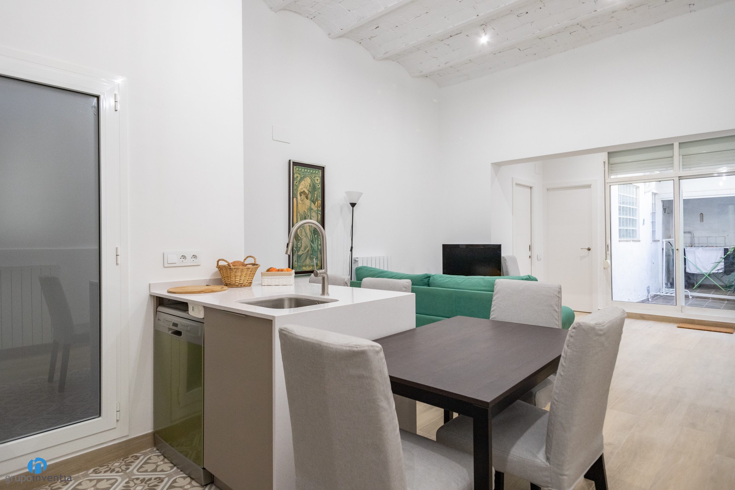 D’altra banda, els espais de la sala d’estar i del menjador s’han moblat. Al primer espai s’ha col·locat un sofà de dues places i una taula auxiliar per col·locar la televisió. Per la seva banda, la cuina s’ha col·locat una taula com a extensió que compta amb capacitat per a diversos comensals. En línies generals són espais pràctics i funcionals per a tota mena de moments.