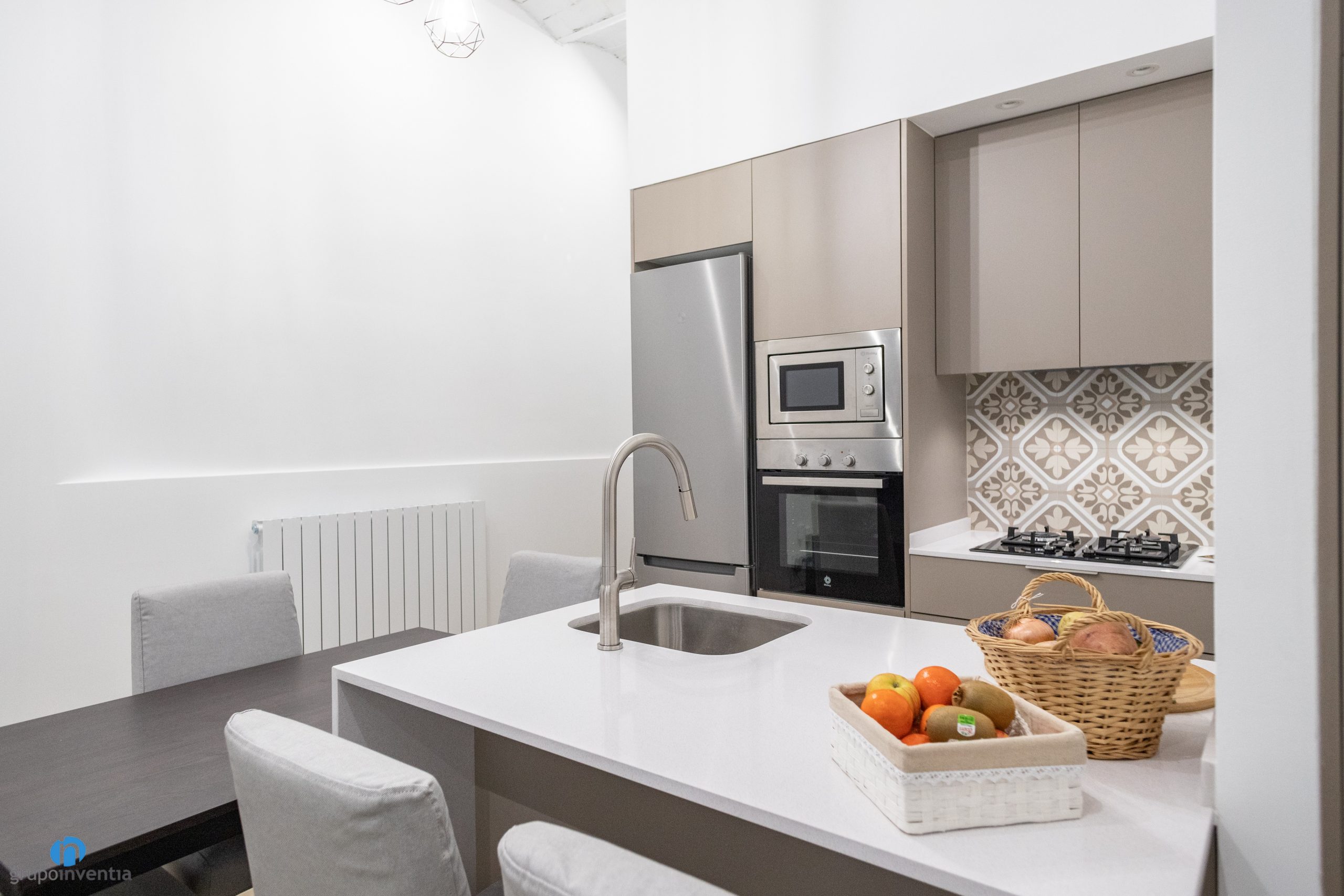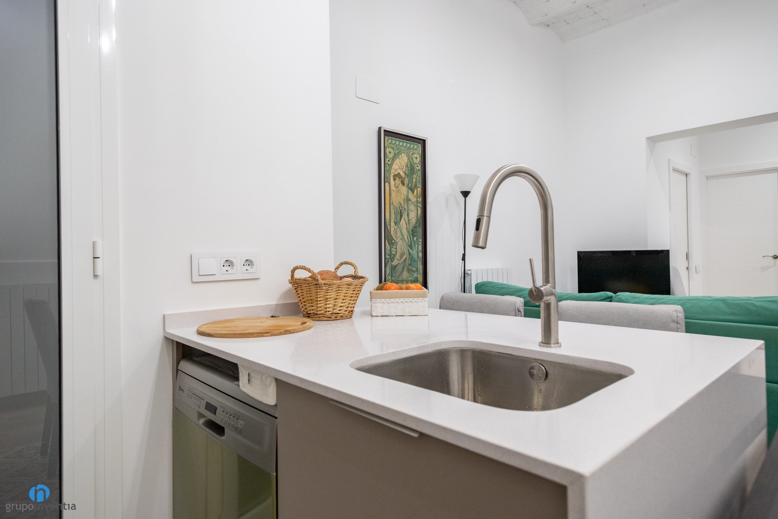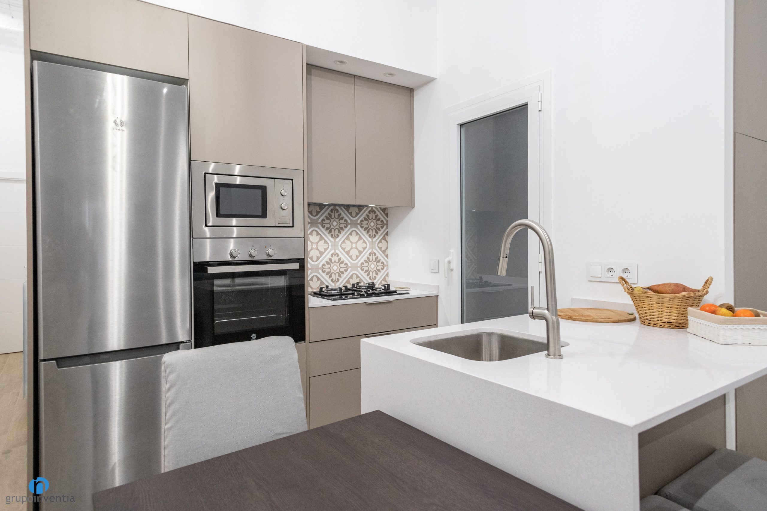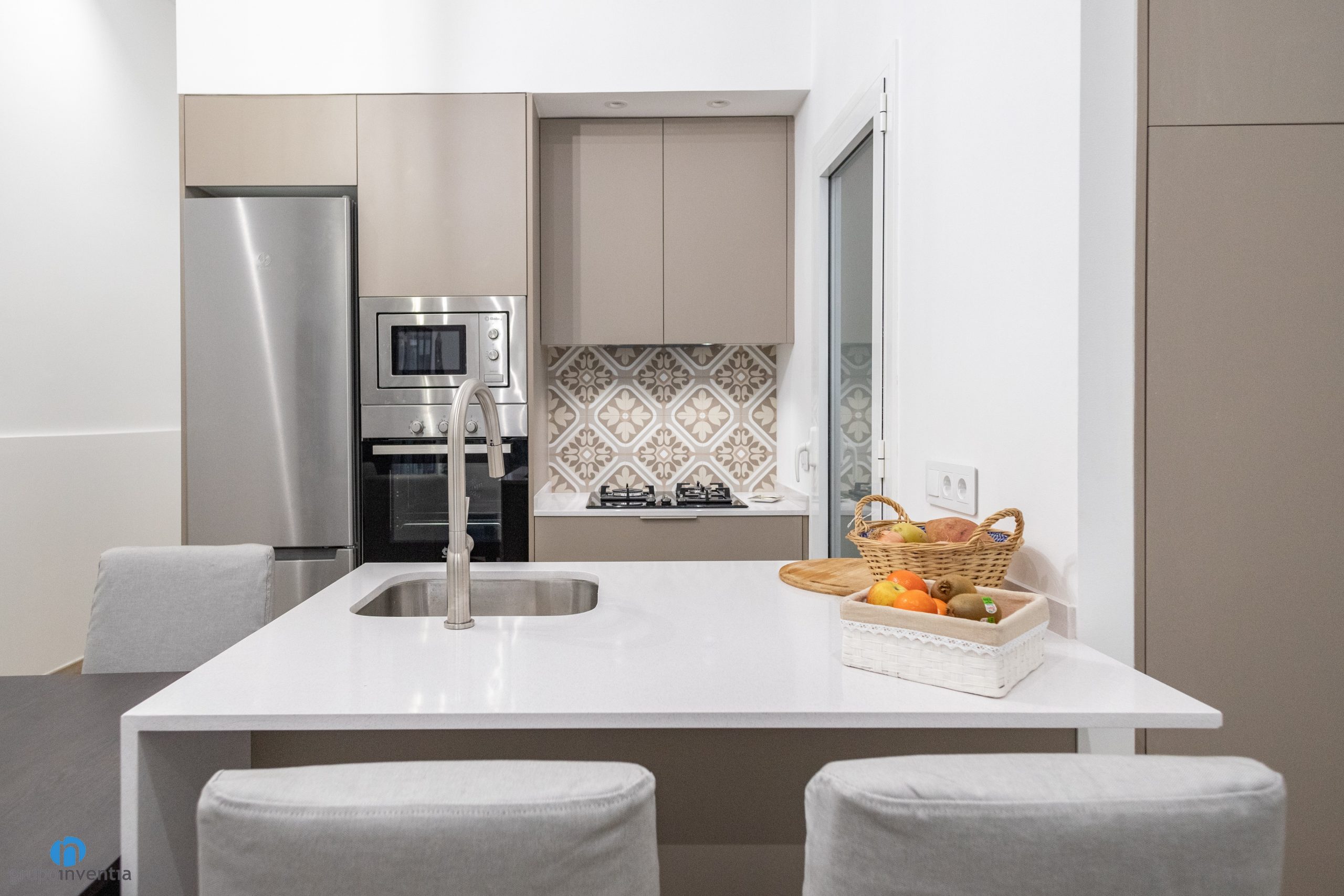 La cuina també s’ha reformat del tot en aquest pis de Badalona. Tant que ha passat a ser una cuina oberta amb una distribució a dos fronts. A la part dreta, l’oberta a la sala d’estar, s’ha col·locat un taulell que funciona com a barra d’esmorzar. Ofereix superfície de suport i compta amb una pica d’un si. D’altra banda, el rentaplats s’ha integrat a la part inferior.