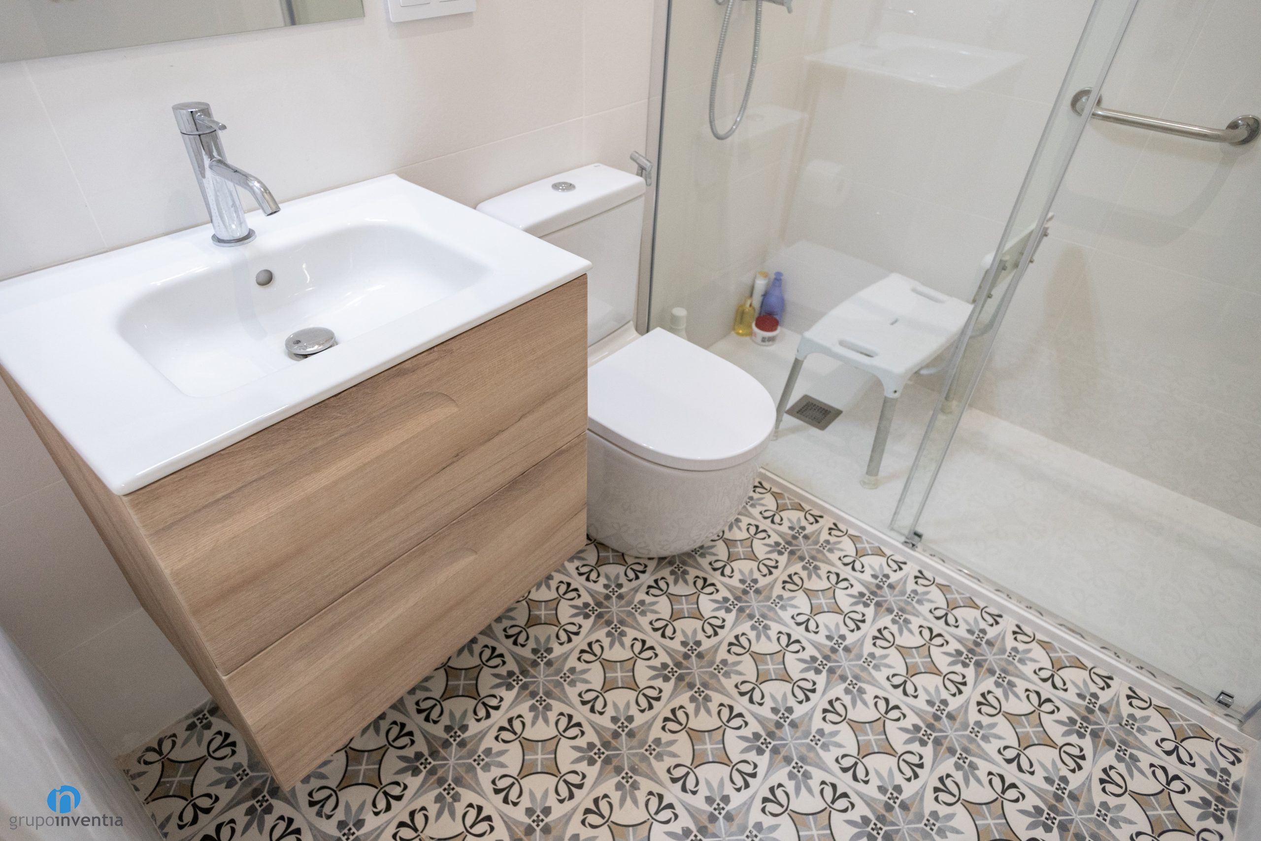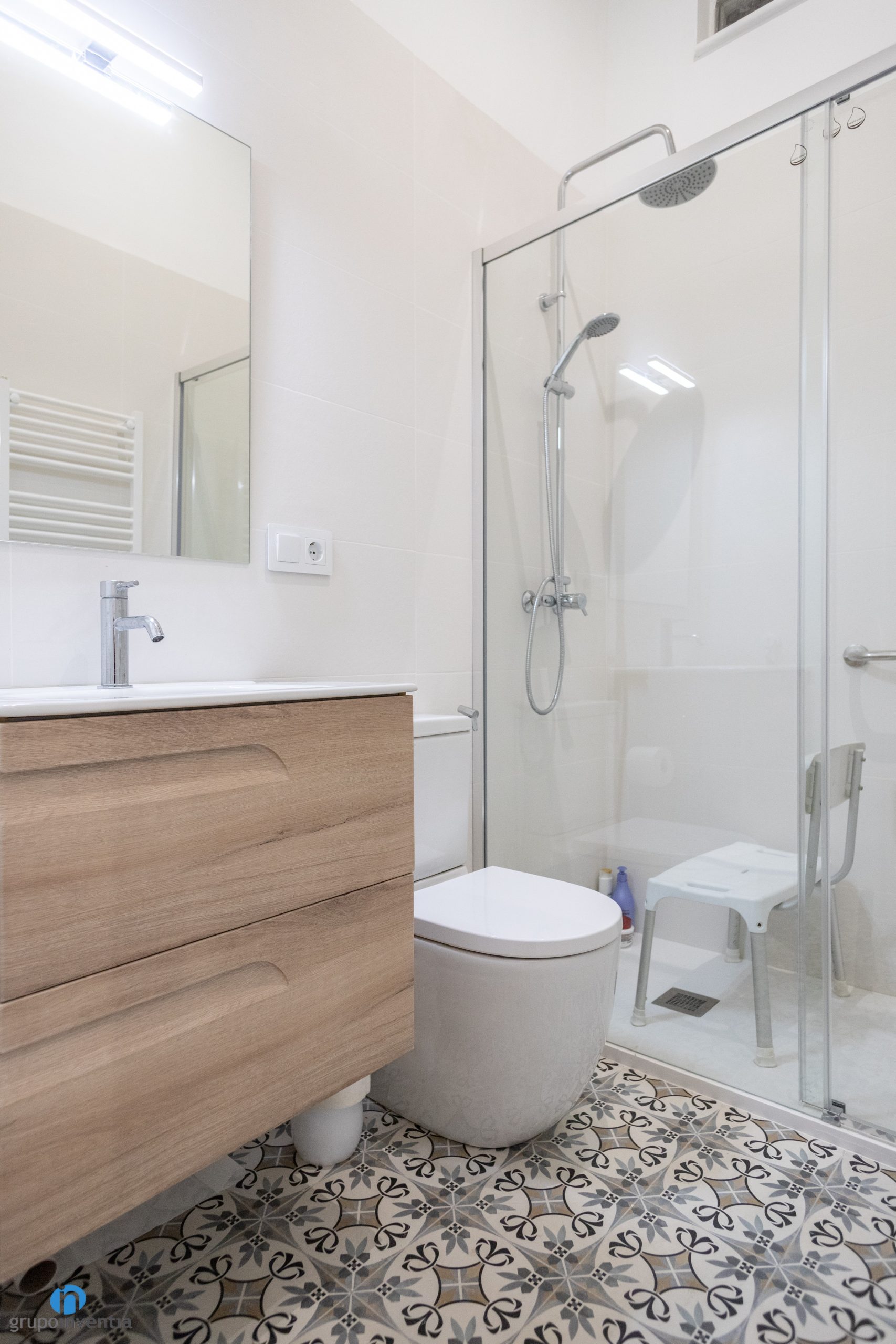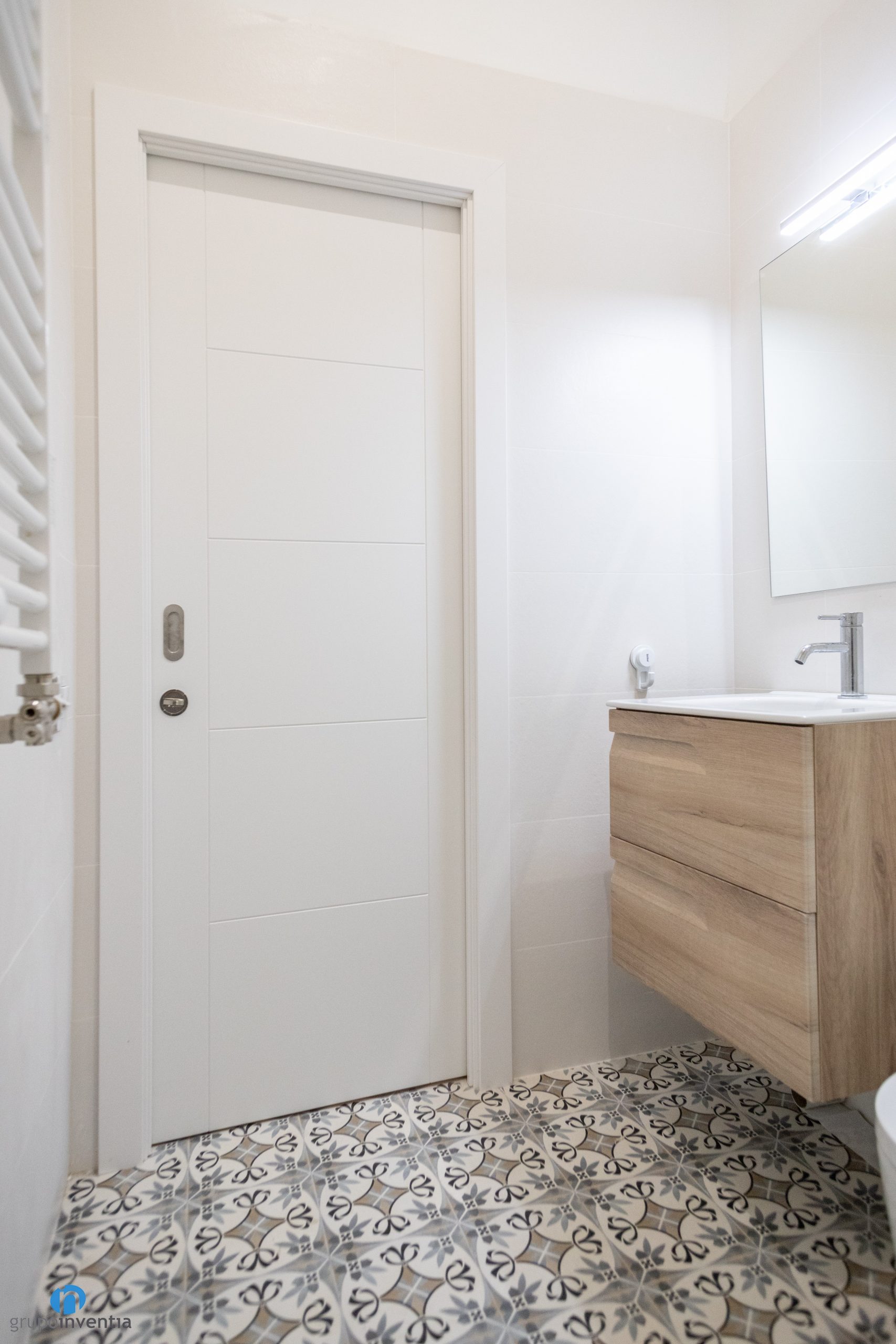 A les dues cambres de bany s’accedeix a través d’una porta corredissa. És un element perfecte per aprofitar al màxim l’espai disponible. Per la seva banda, s’ha utilitzat un interiorisme de bany molt semblant en tots dos. Les parets són de color blanc per aconseguir uns espais lluminosos i visualment amplis. Es combinen amb un terra de bany tipus hidràulic amb què s’aconsegueix dotar-los de molta personalitat.
