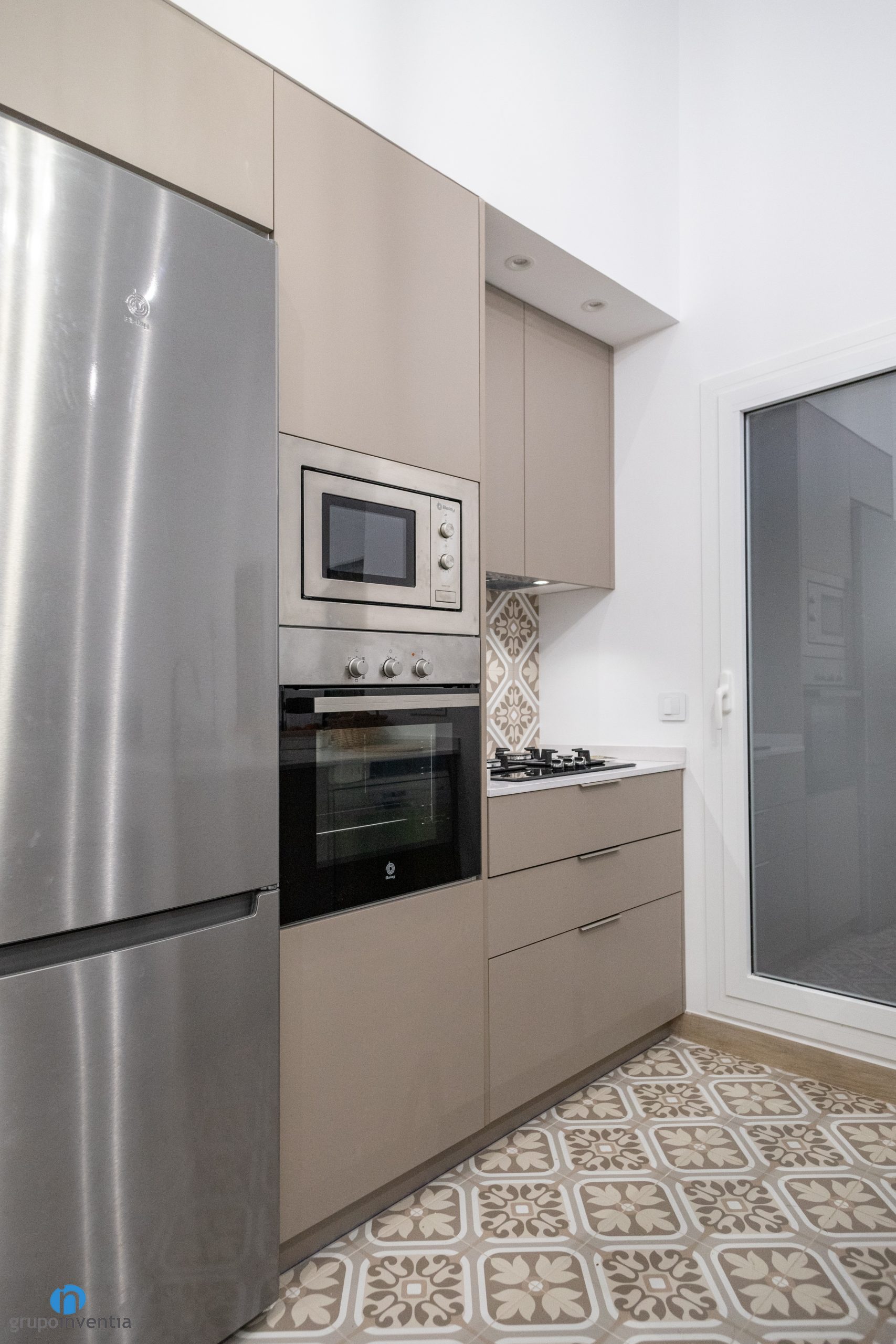 El moble principal està situat al costat esquerre d’aquesta reforma de cuina. Es presenta en color beige ia l’extrem compta amb buits a mida per integrar els electrodomèstics. Concretament la nevera, el forn i el microones. Sobre el taulell s’ha instal·lat una placa de cocció de tres fogons. Tant a la part inferior com a superior cuneta amb una àmplia capacitat d’emmagatzematge.