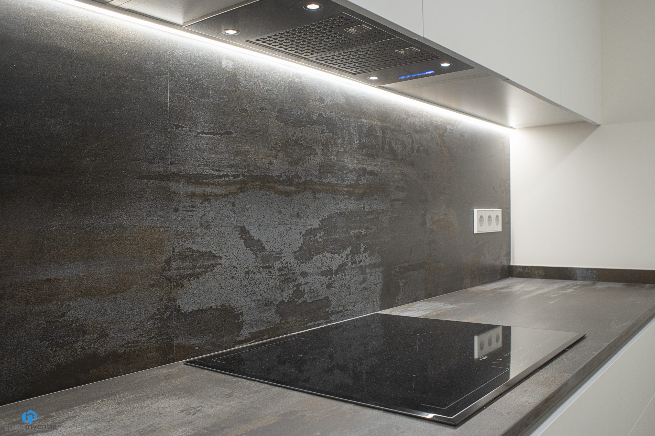 Els taulells contrasten amb el moble blanc de cuina i es presenten en color negre. Sobre elles s’ha instal·lat l’aigüera i la placa vitroceràmica. A la zona inferior també s’hi ha integrat un rentaplats que completa el nou equipament de cuina. També s’ha col·locat un nou paviment, un terra ceràmic imitació parquet.