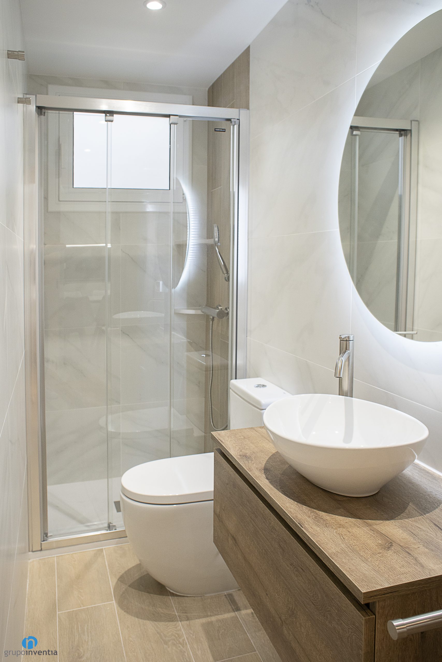 El nou equipament sanitari de la reforma de bany té un lavabo de disseny rodó col·locat sobre un moble de bany. Gràcies a aquest calaix es poden organitzar tota mena de productes d’higiene. El nou vàter es presenta amb línies arrodonides i modernes amb la cisterna a l’esquena. La zona d’aigües es troba al fons de l’estança i és un plat de dutxa protegit per unes mampares de portes corredisses.