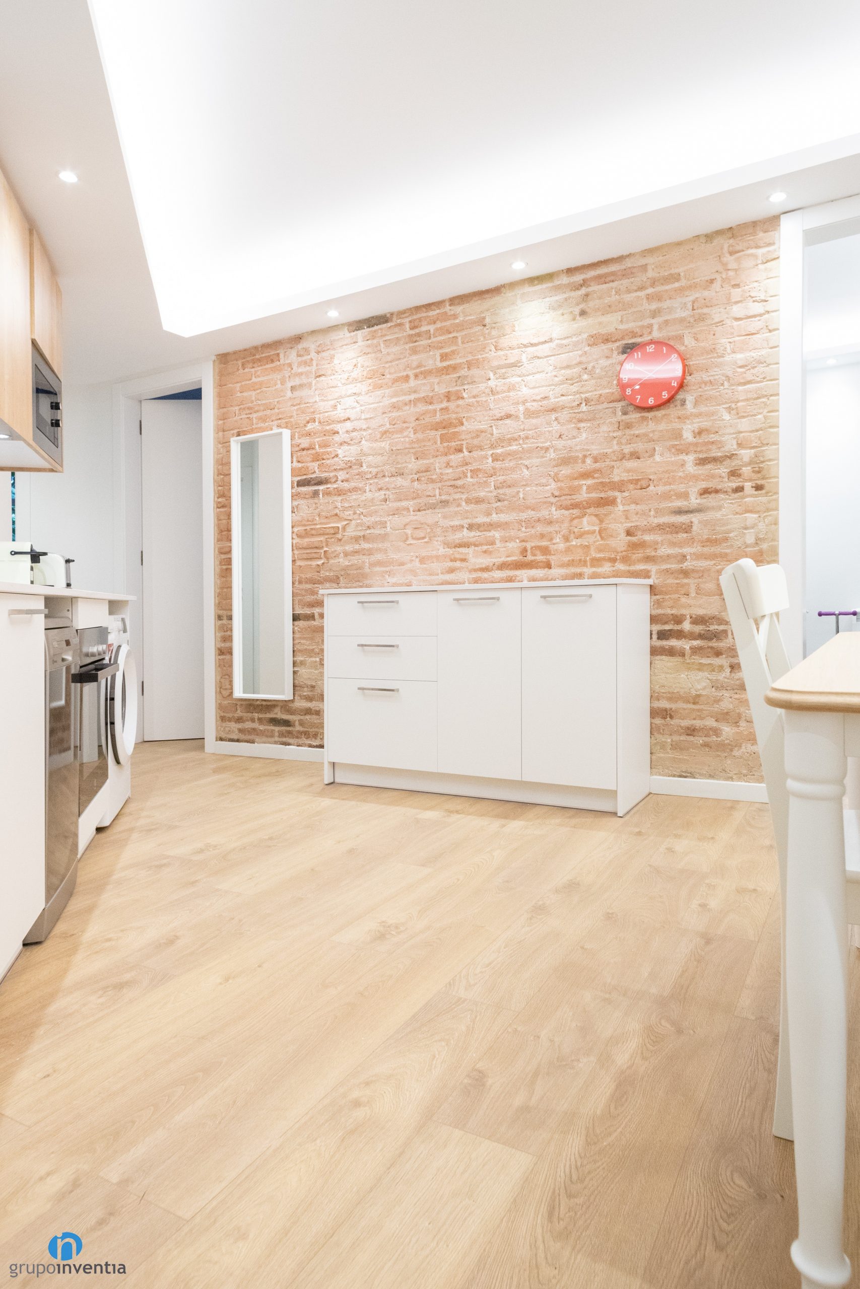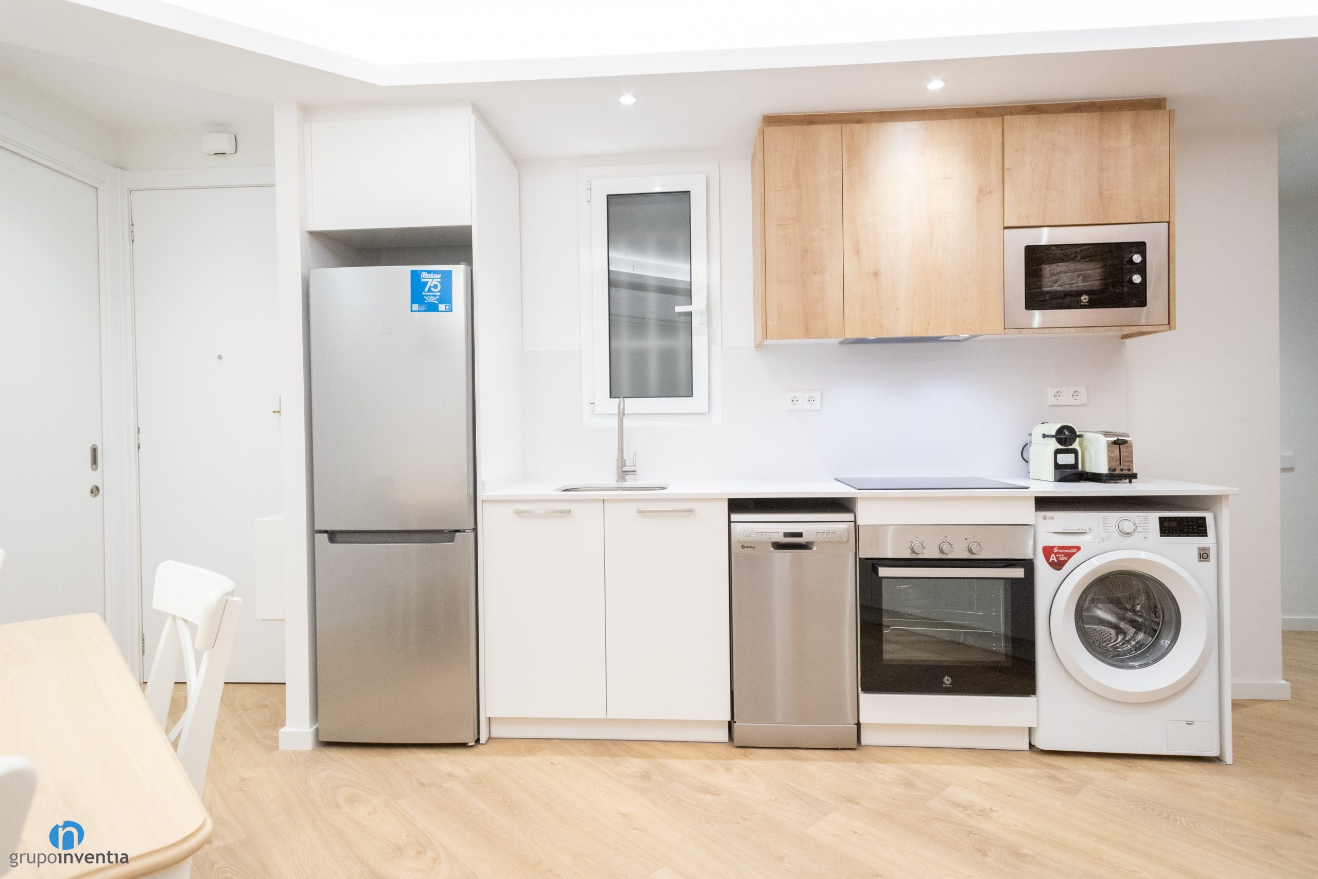 Disposa de capacitat d’emmagatzematge tant a la zona inferior com a la superior. Aquí és on s’han integrat els nous electrodomèstics. A la part de baix té el rentaplats, el forn i la rentadora. Mentre que als armaris superiors té integrat el microones. També hi ha una nevera amb congelador que es troba a l’extrem esquerre de la cuina.