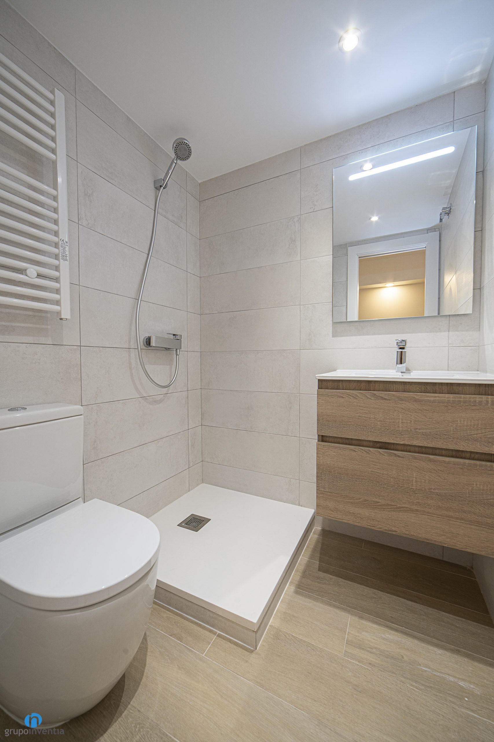 A nivell visual, les tres reformes de banys es presenten amb una imatge molt semblant. Les parets s’han enrajolat completament amb rajoles grans de colors neutres. Per la seva banda el paviment és el mateix que a tots els espais, el terra ceràmic imitació fusta. D’aquesta manera hem aconseguit dotar les cambres de bany d’un ambient fresc i agradable. En aquest sentit, dues característiques essencials per a espais d’ús diari.