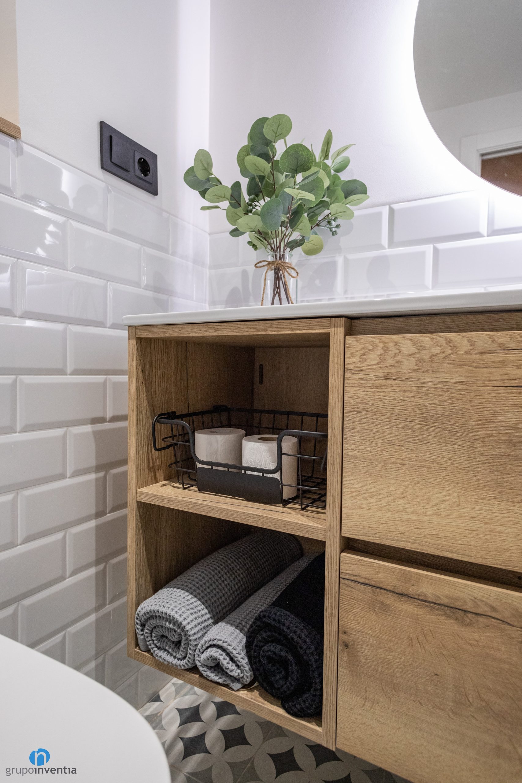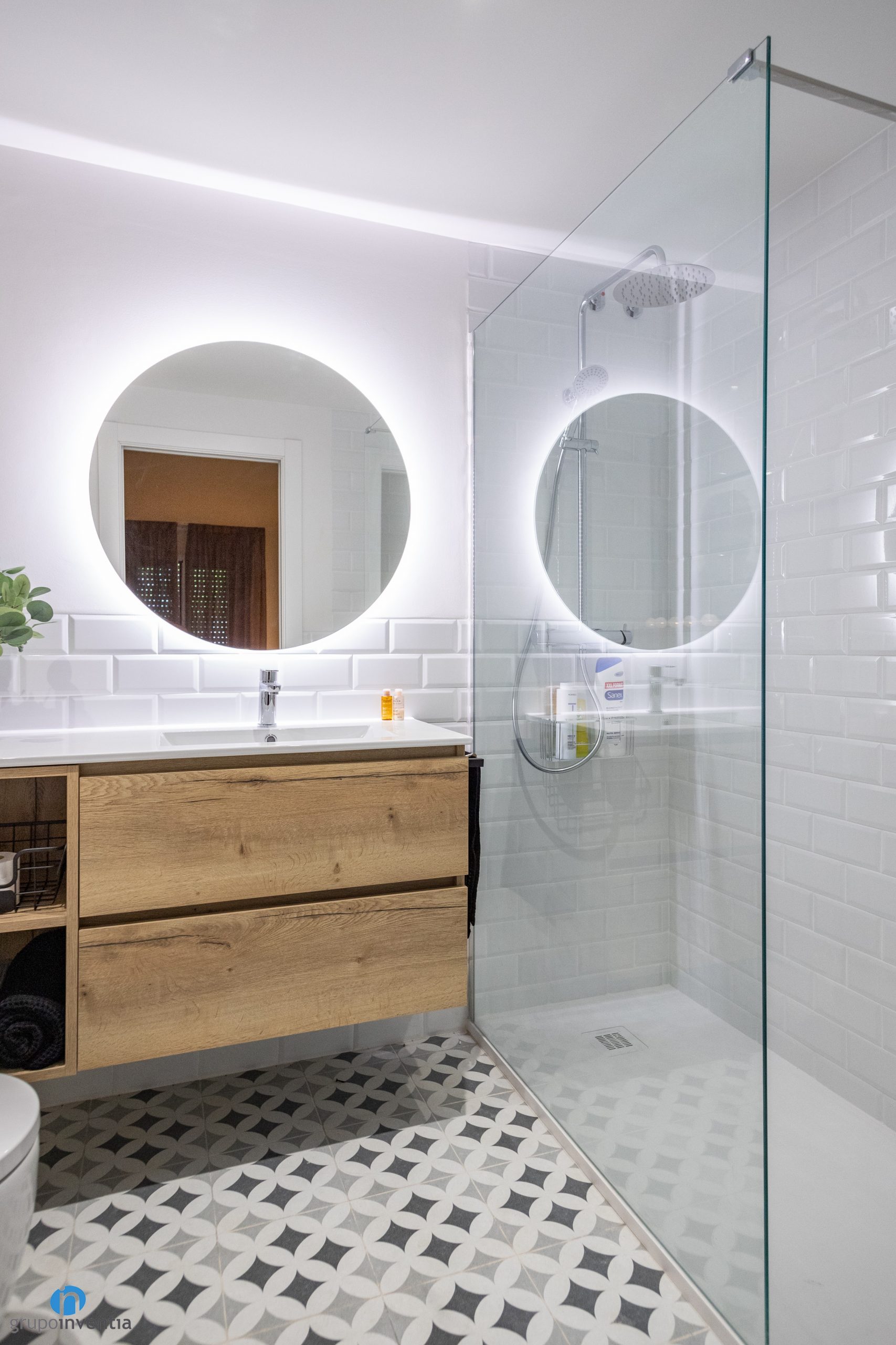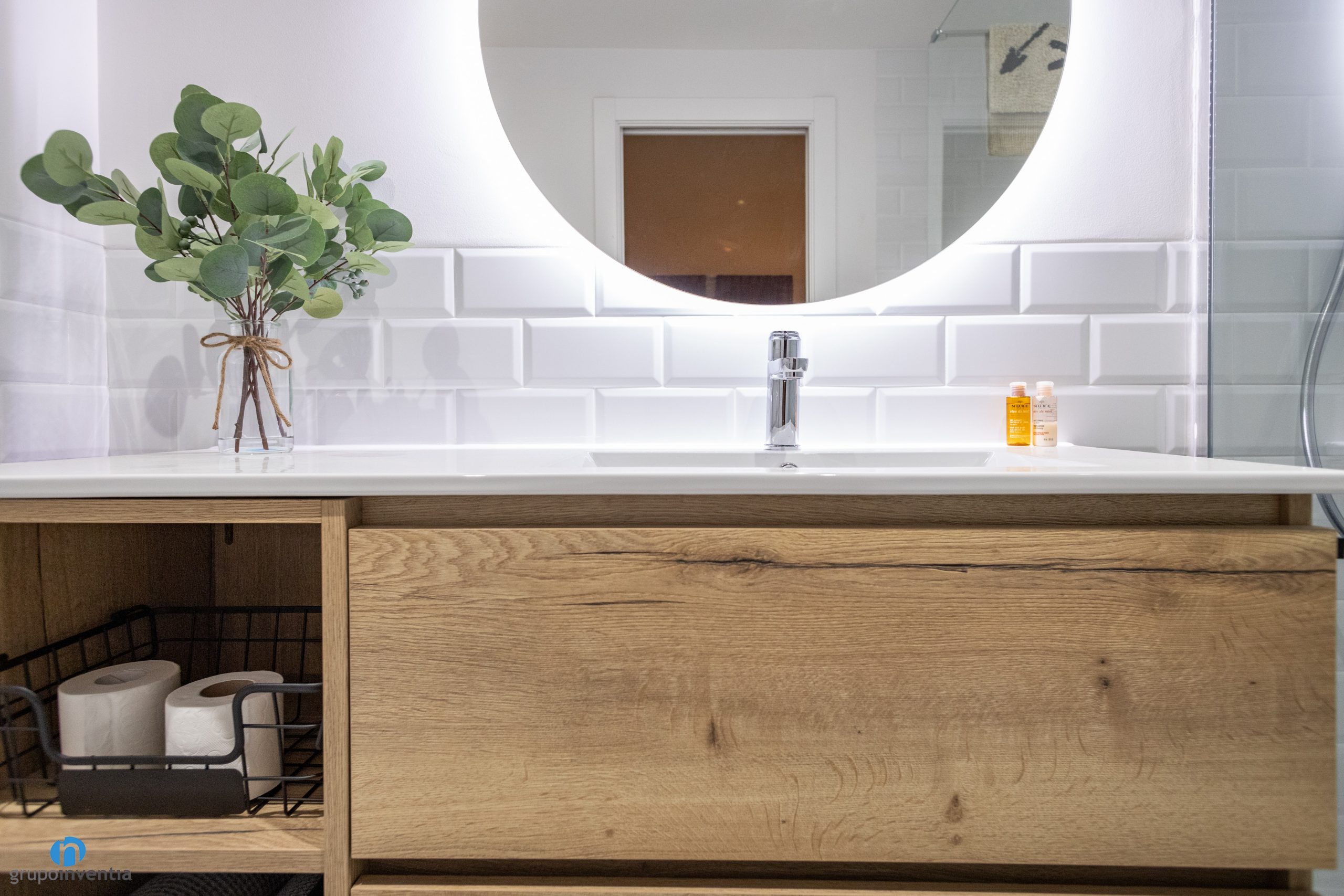 A aquests acabats també els acompanyen diversos tocs de fusta. Els veiem al moble bany ia la prestatgeria superior de la paret del vàter. Com a elements d’aquesta reforma integral de bany també destaquem el mirall que s´ha col·locat sobre el lavabo. Té forma circular i té llums led que il·luminen tot l’espai.