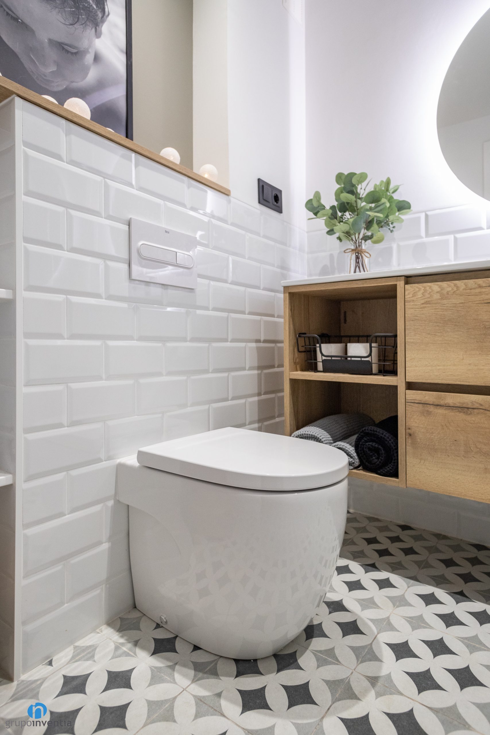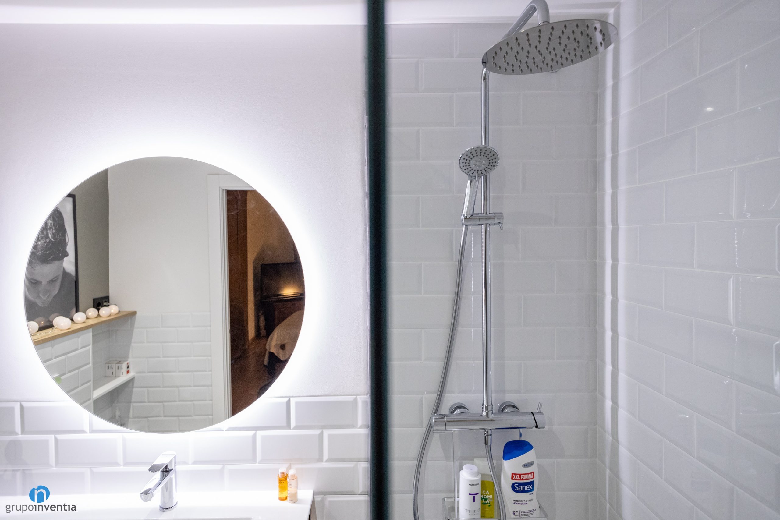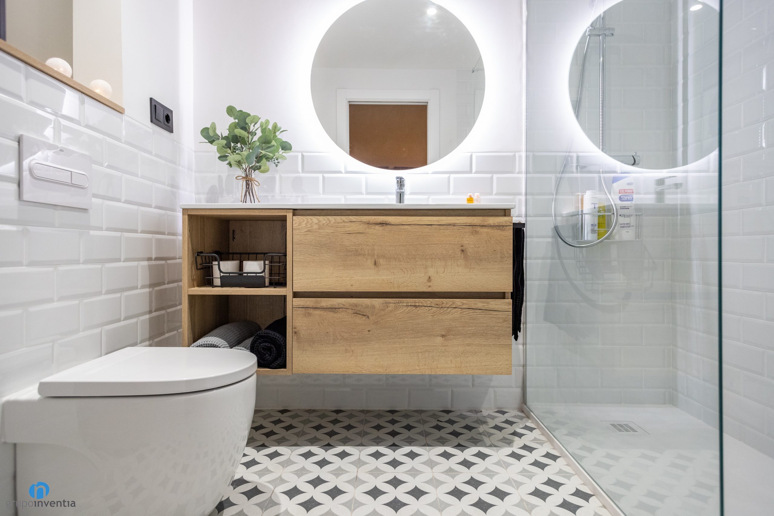 A aquests acabats també els acompanyen diversos tocs de fusta. Els veiem al moble bany ia la prestatgeria superior de la paret del vàter. Com a elements d’aquesta reforma integral de bany també destaquem el mirall que s´ha col·locat sobre el lavabo. Té forma circular i té llums led que il·luminen tot l’espai.