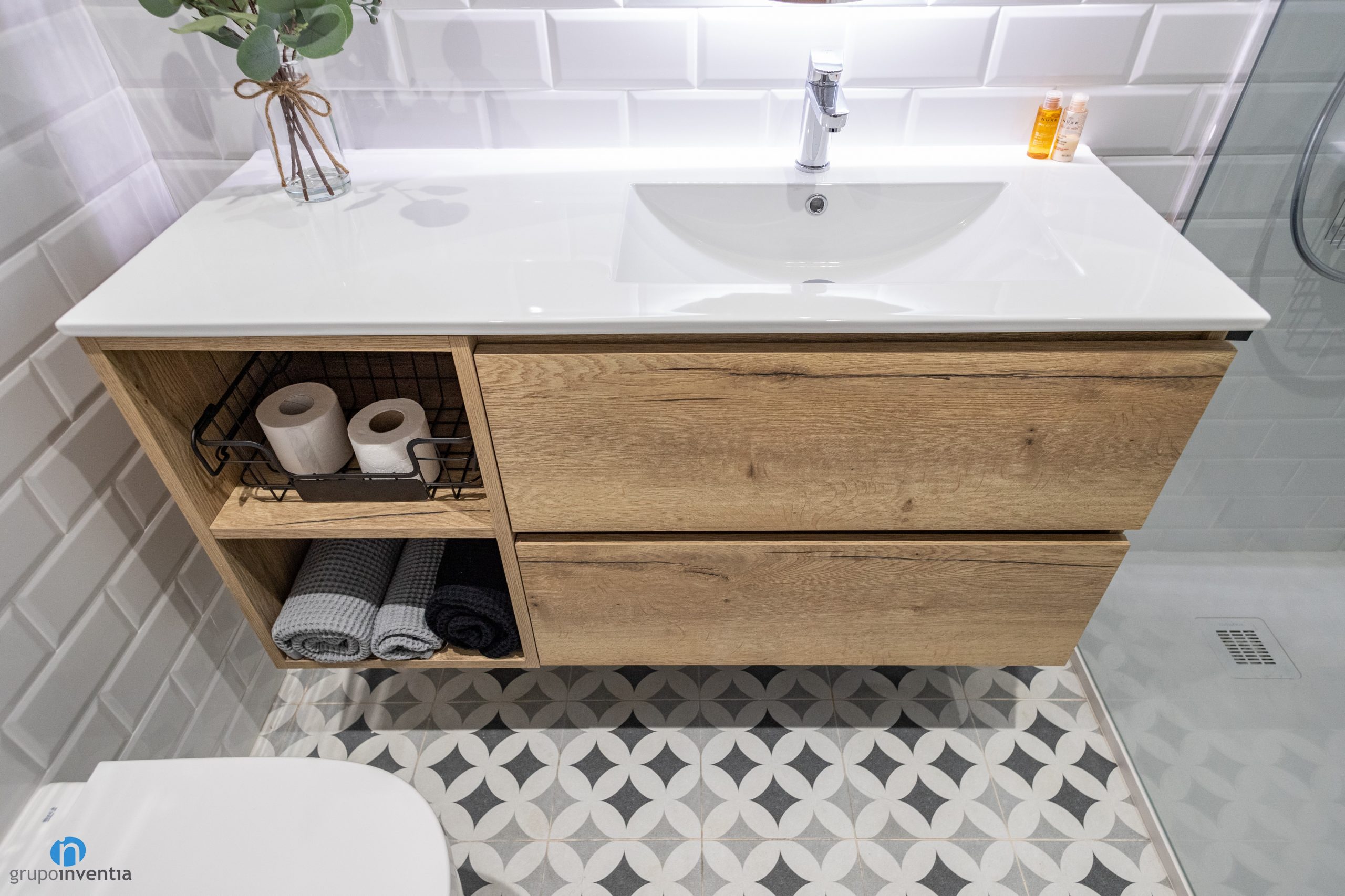 S’ha col·locat un lavabo flotant amb un espai d’aigüera i un tram de taulell. D’aquesta manera es poden acomodar amb facilitat diferents elements de bany o decoratius. La part inferior la ocupa un moble de bany de dos calaixos i que es presenta en tons fusta. Que hi hagi capacitat demmagatzematge en un bany és molt important per mantenir lordre de tots els productes dhigiene.