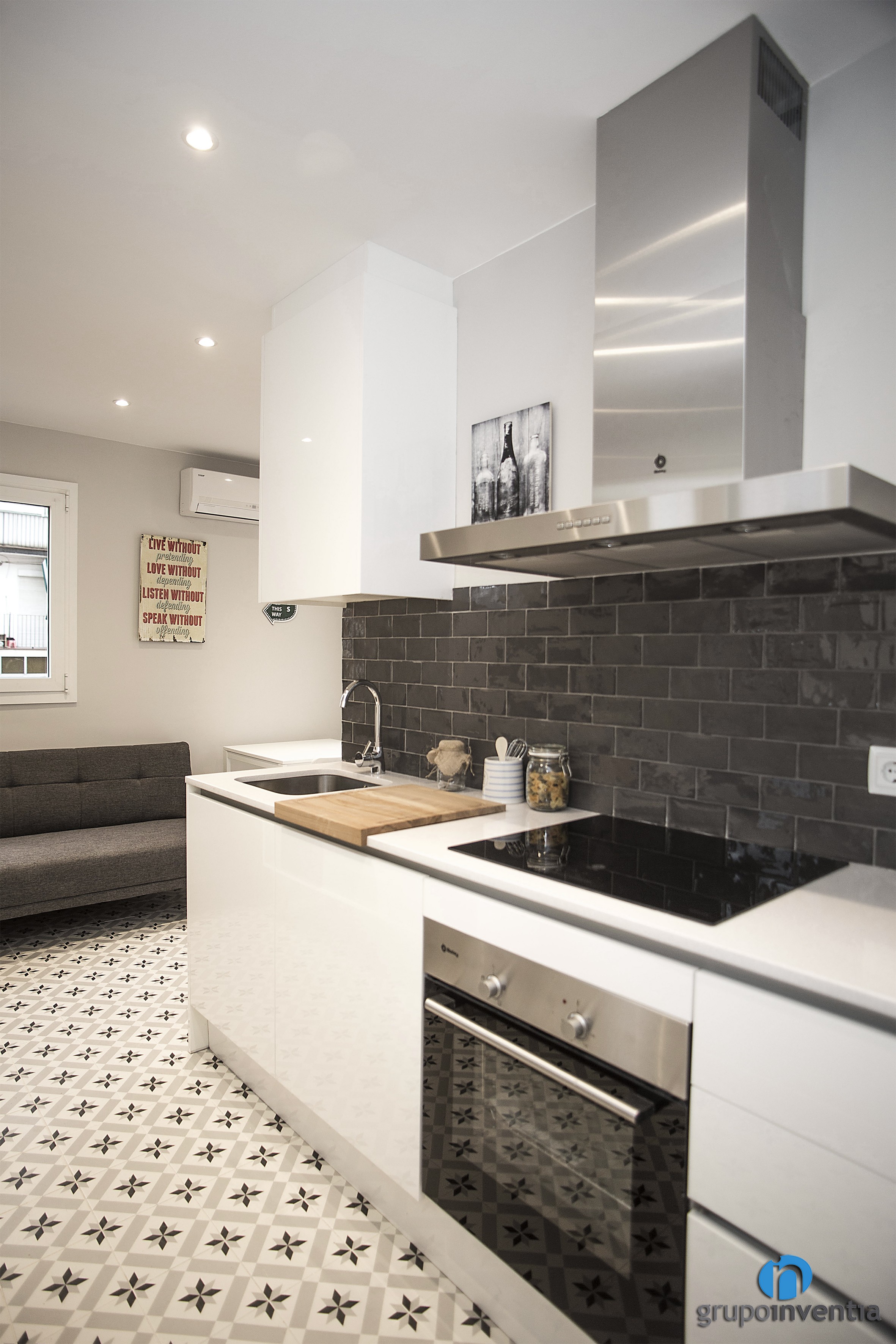 La cuina se situa a la dreta de l’entrada i té una distribució lineal, comptant amb capacitat d’emmagatzematge a la part inferior i superior. A l’extrem dret es encastró la nevera, perquè sobre els fogons s’instal·lessin una placa vitroceràmica i una pica individual. Al seu torn, també es encastró el forn a la part inferior del taulell de cuina.