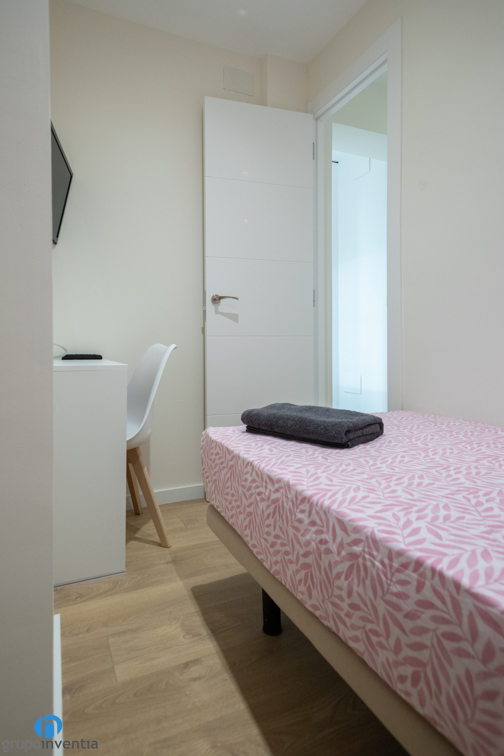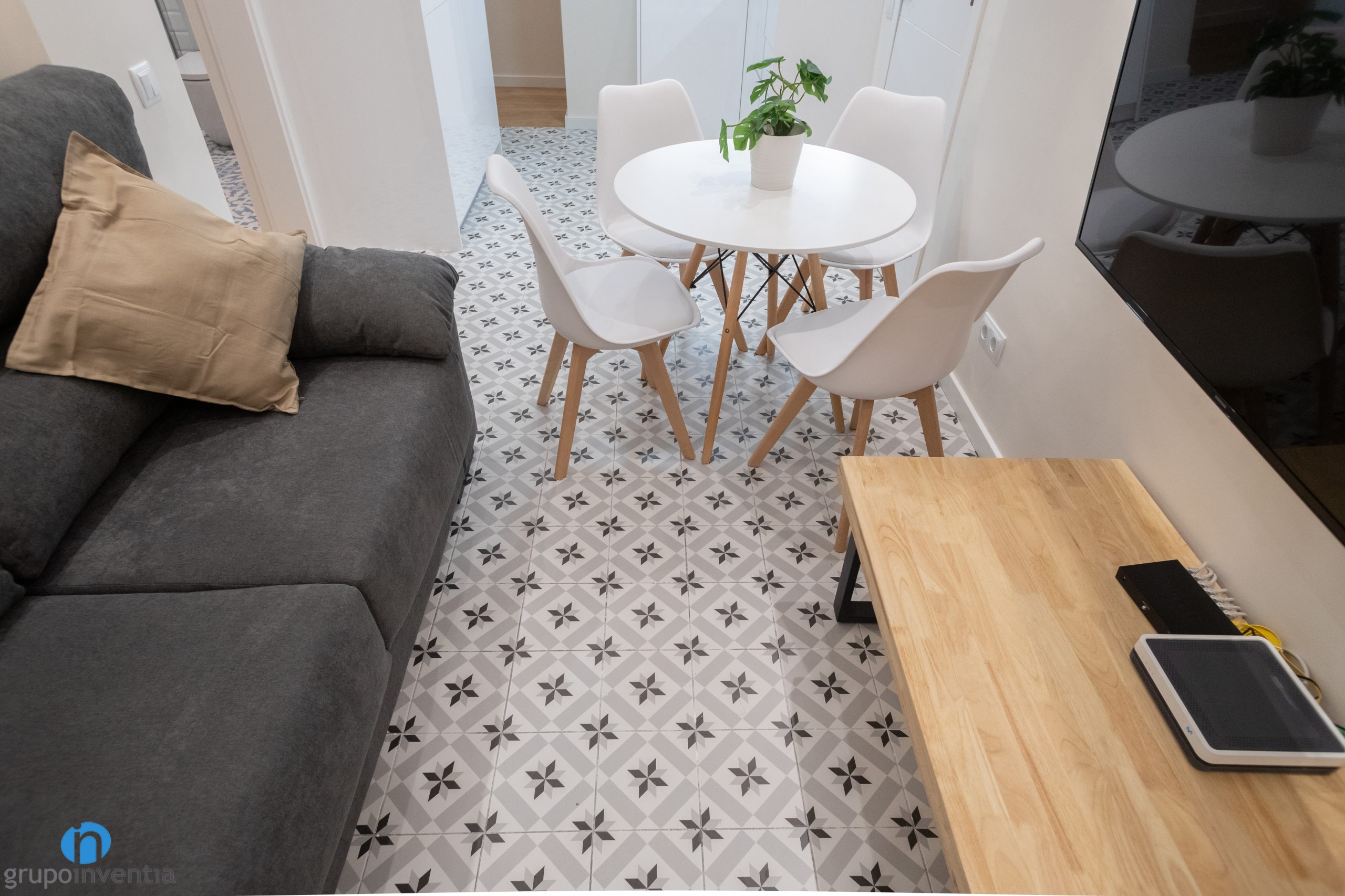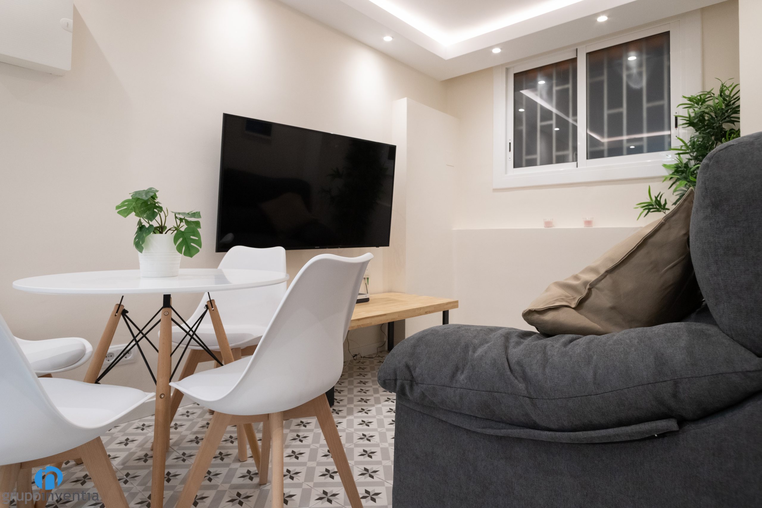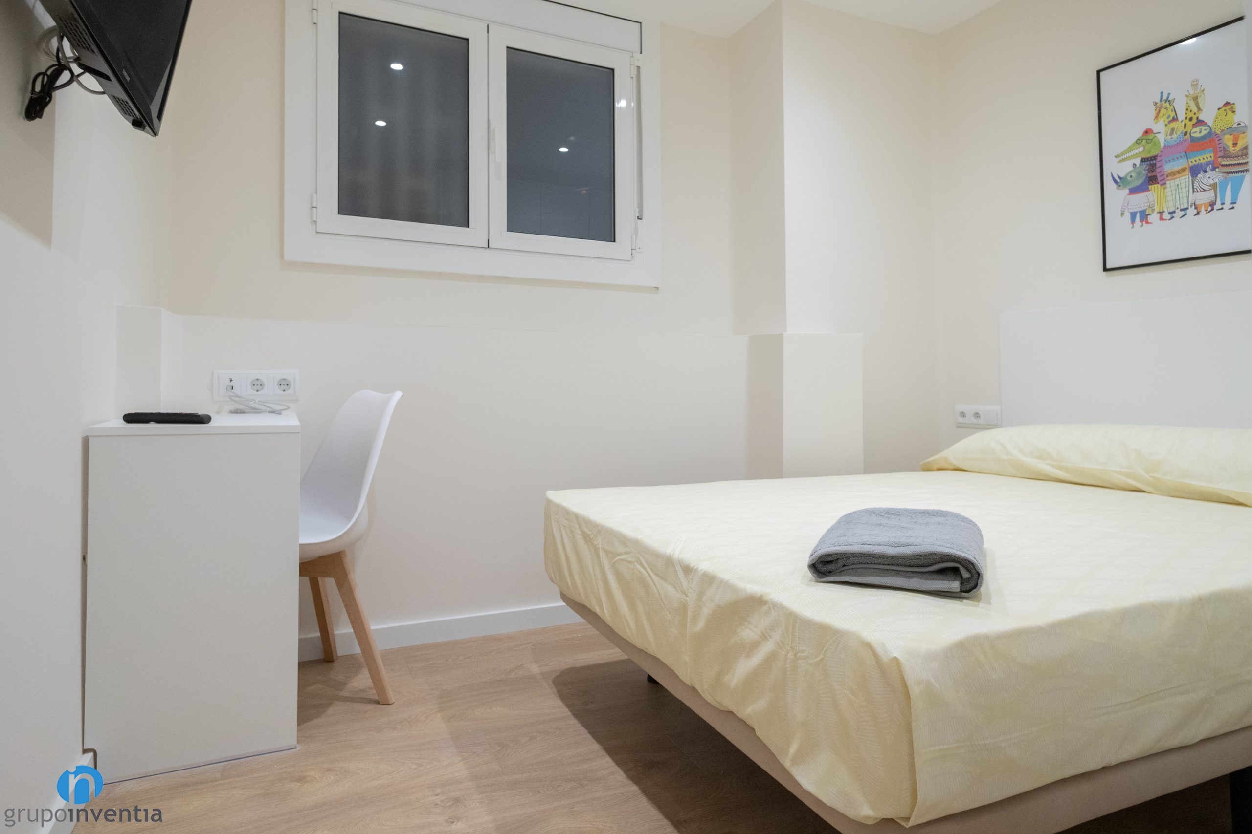 A més d´imprimir aquest nou ambient també ens hem encarregat de moblar tot el pis. A la sala d’estar hi ha un sofà gran, una tauleta allargada i s’ha ancorat una televisió a la paret. A prop hi ha el menjador, equipat amb una taula rodona i cadires per a diversos comensals. Pel que fa als dormitoris, cadascun disposa d’un llit, un armari i una zona de treball.