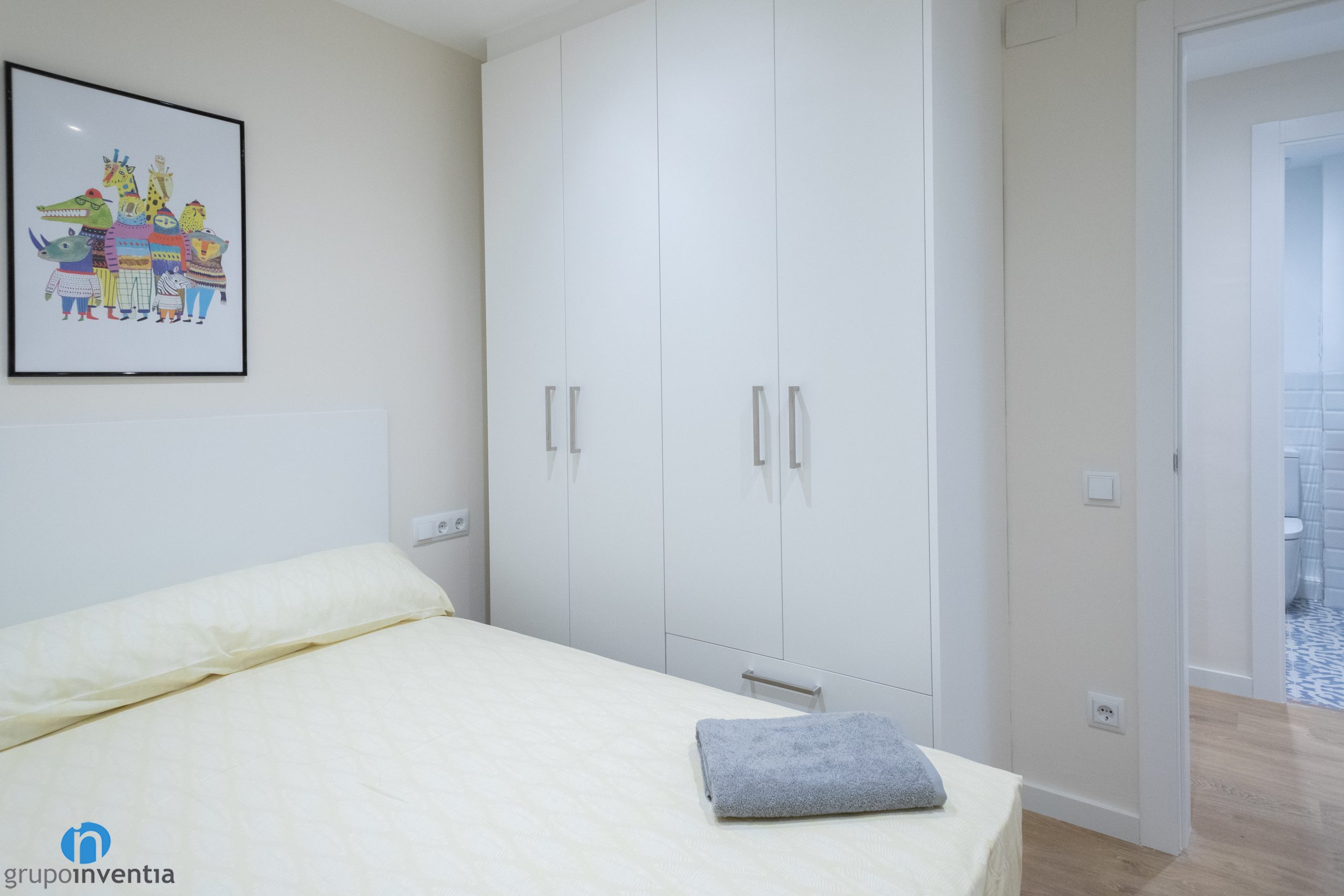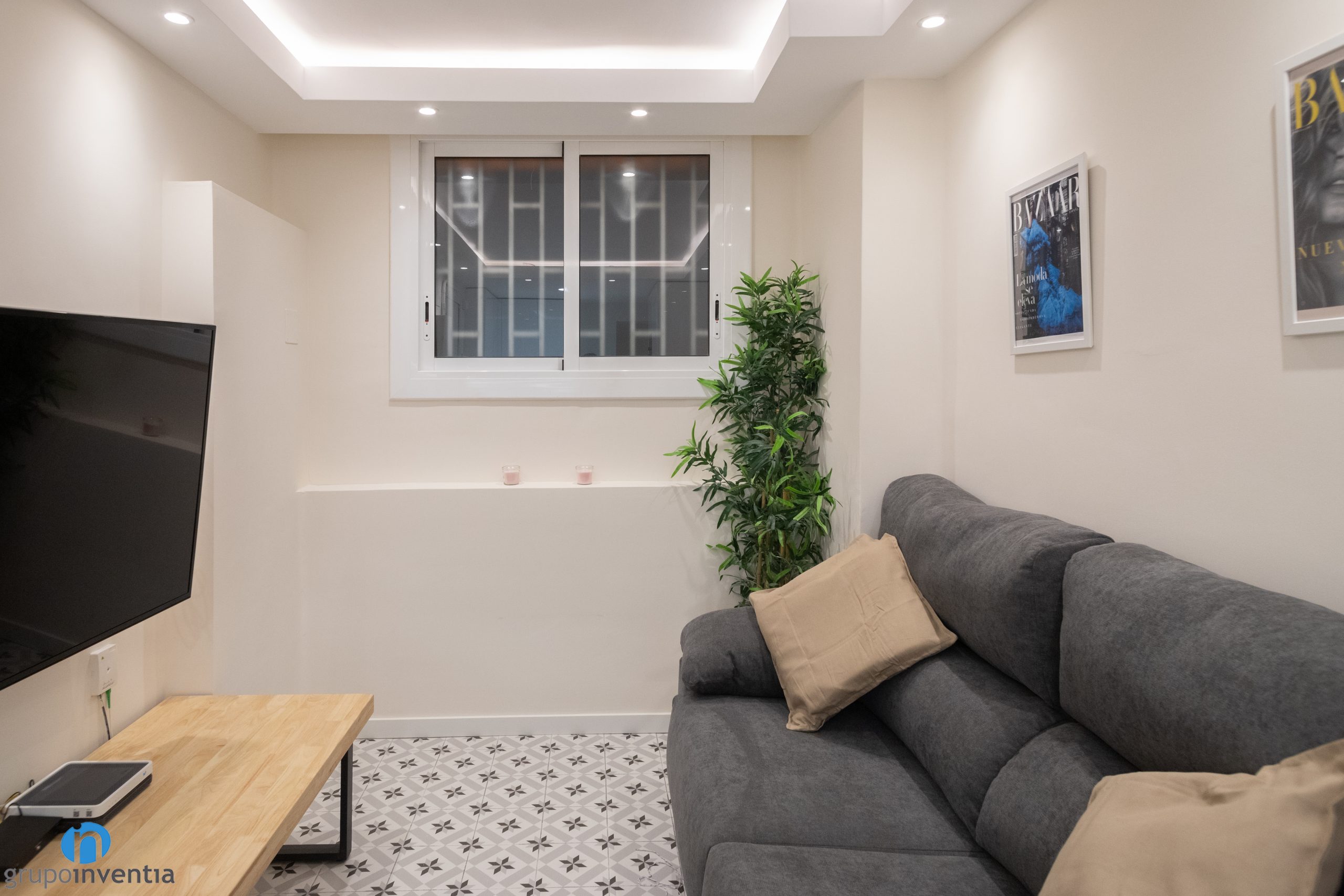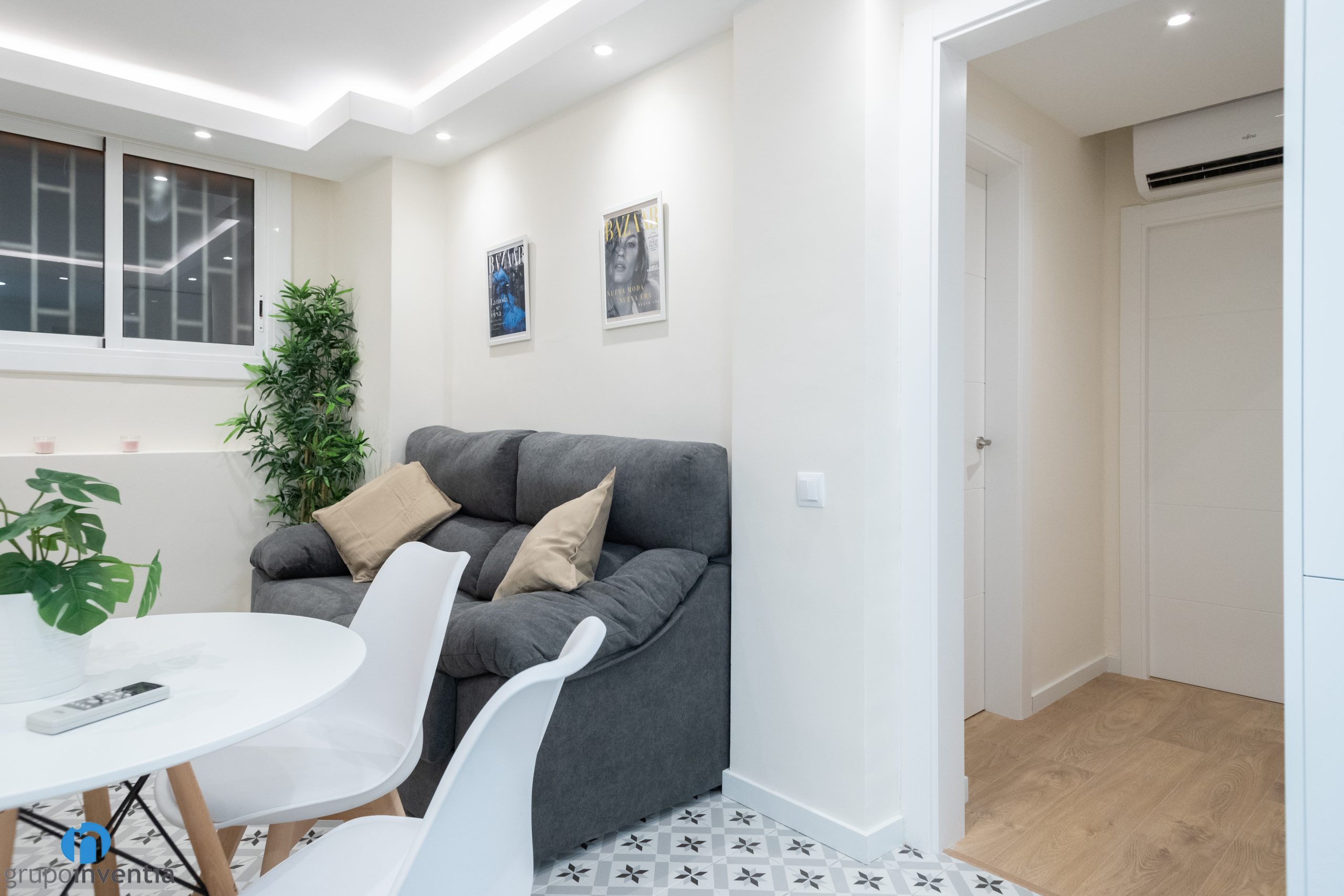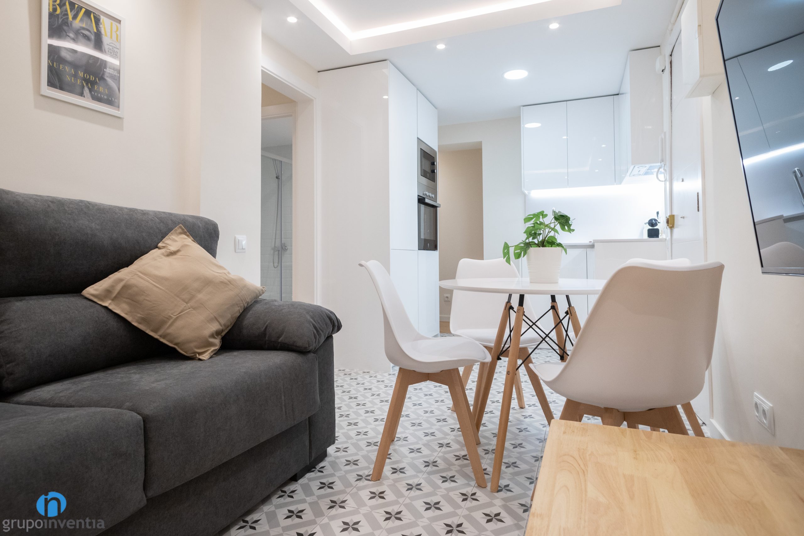 A més d´imprimir aquest nou ambient també ens hem encarregat de moblar tot el pis. A la sala d’estar hi ha un sofà gran, una tauleta allargada i s’ha ancorat una televisió a la paret. A prop hi ha el menjador, equipat amb una taula rodona i cadires per a diversos comensals. Pel que fa als dormitoris, cadascun disposa d’un llit, un armari i una zona de treball.