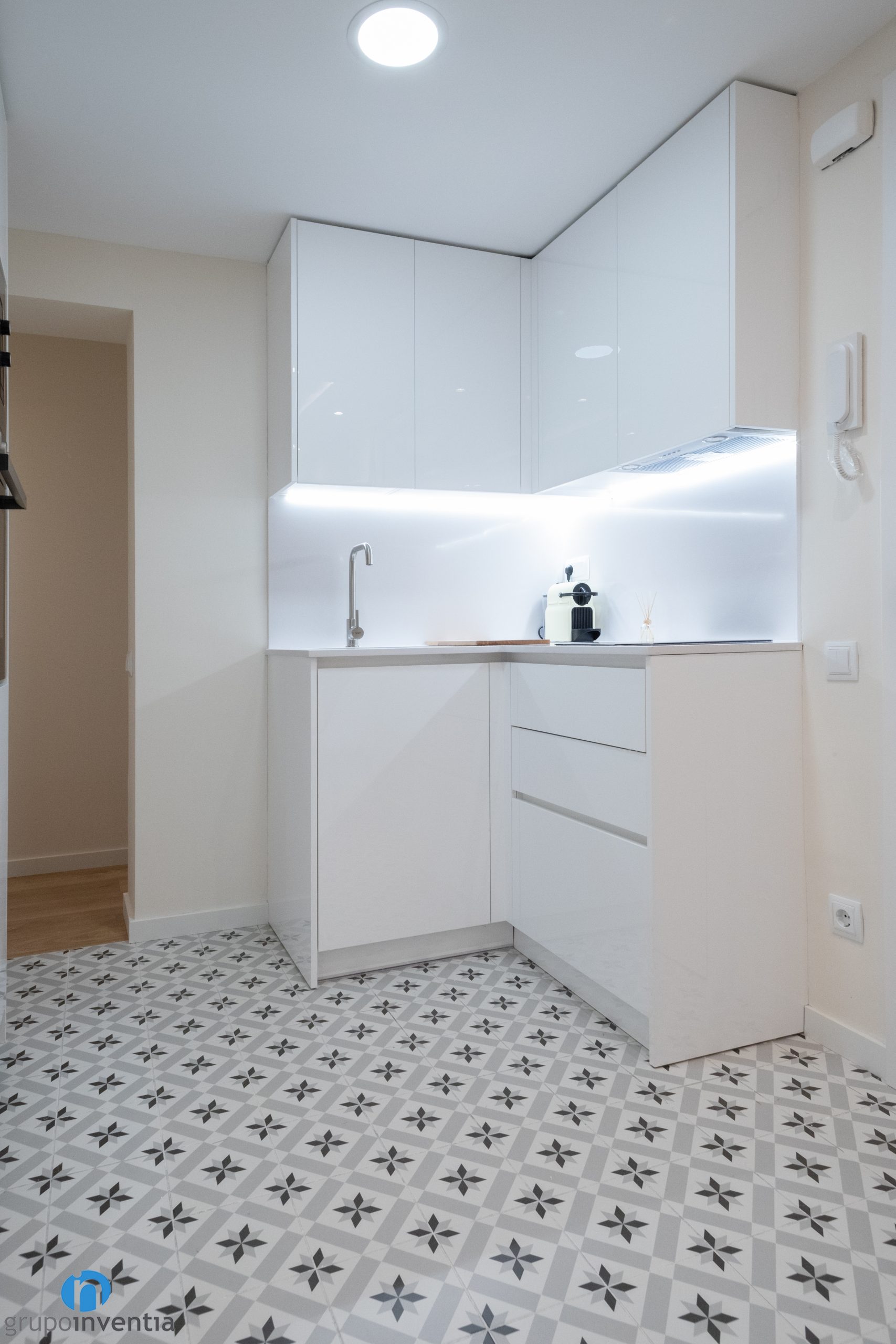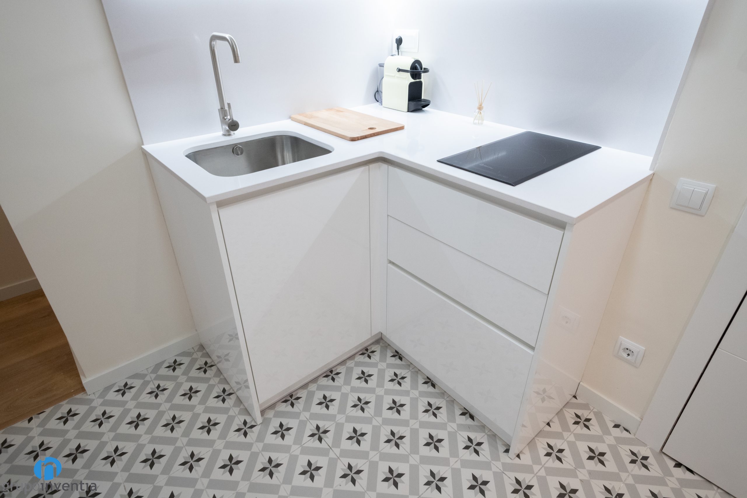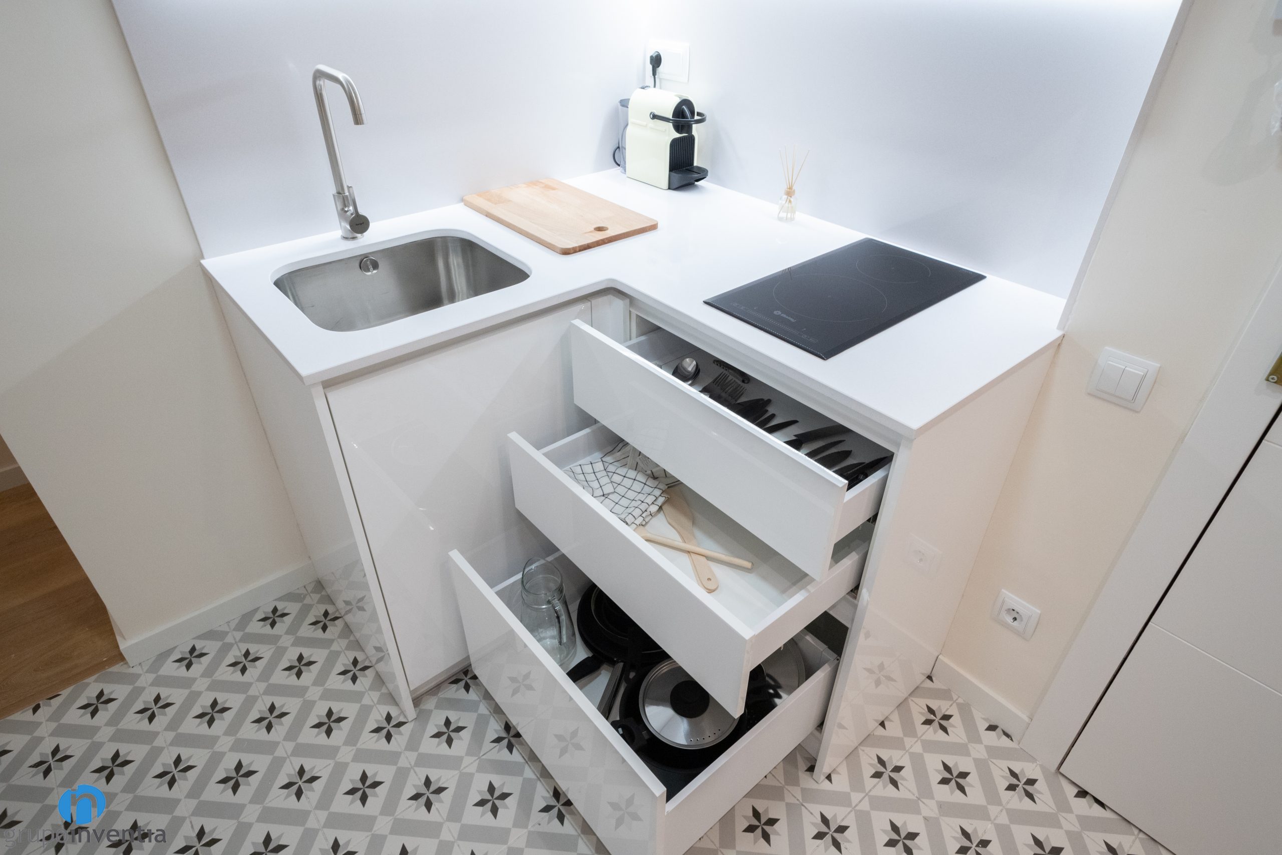 Als taulells s’hi ha instal·lat una placa vitroceràmica i una pica d’un sinus. Tant a la part inferior com a superior disposa de capacitat d’emmagatzematge. Com que és una reforma de cuina oberta s’adapta a la imatge global i s’ha escollit un moble de cuina blanc. D’aquesta manera es potencia la sensació de lluminositat i amplitud a la cuina.