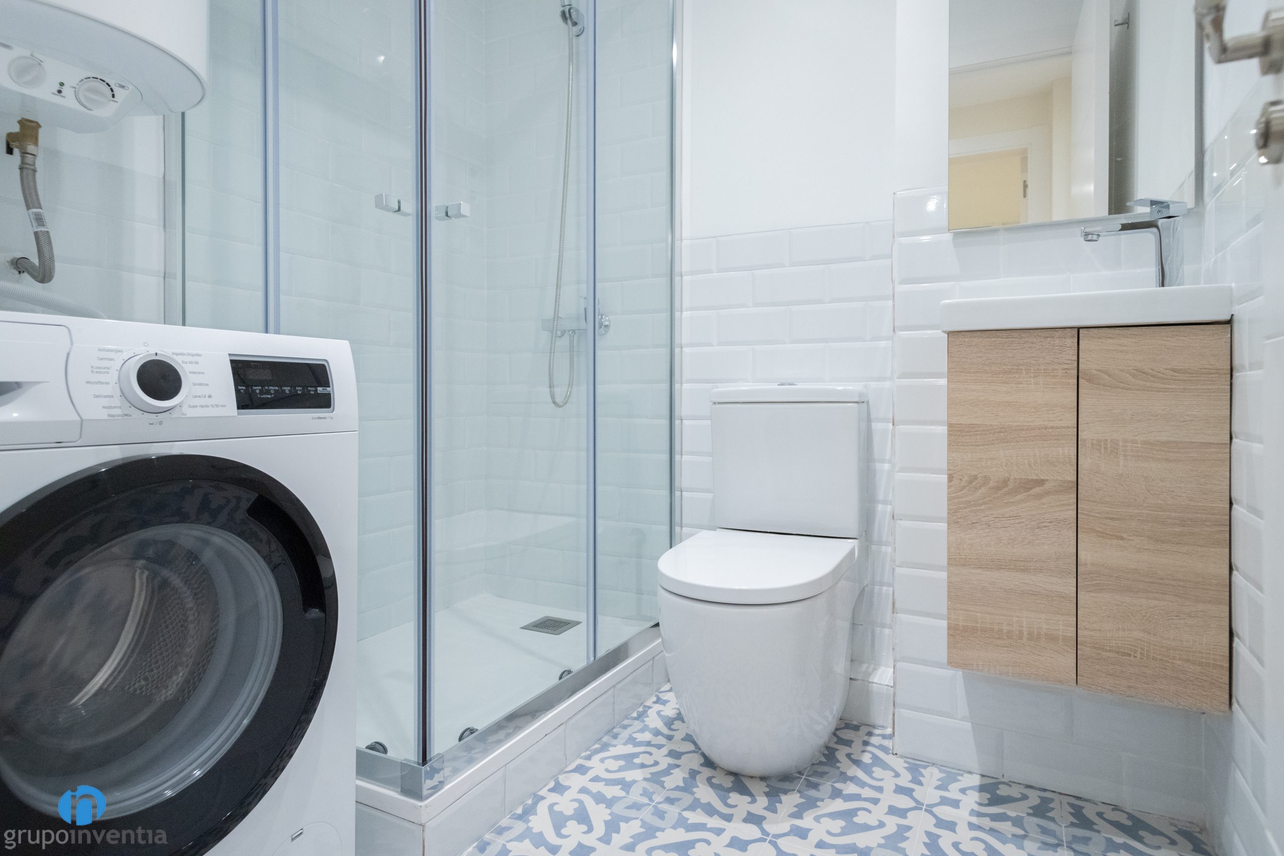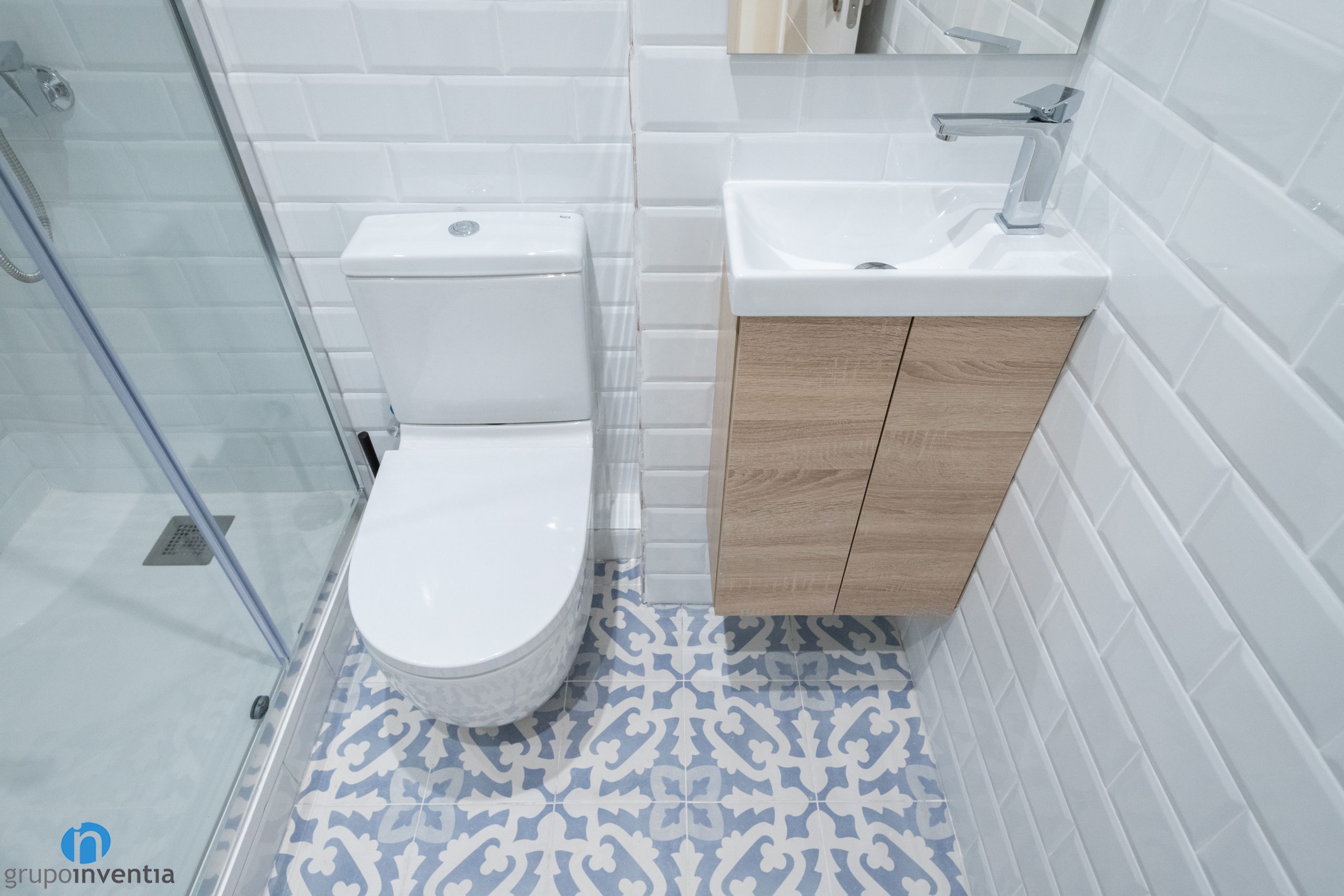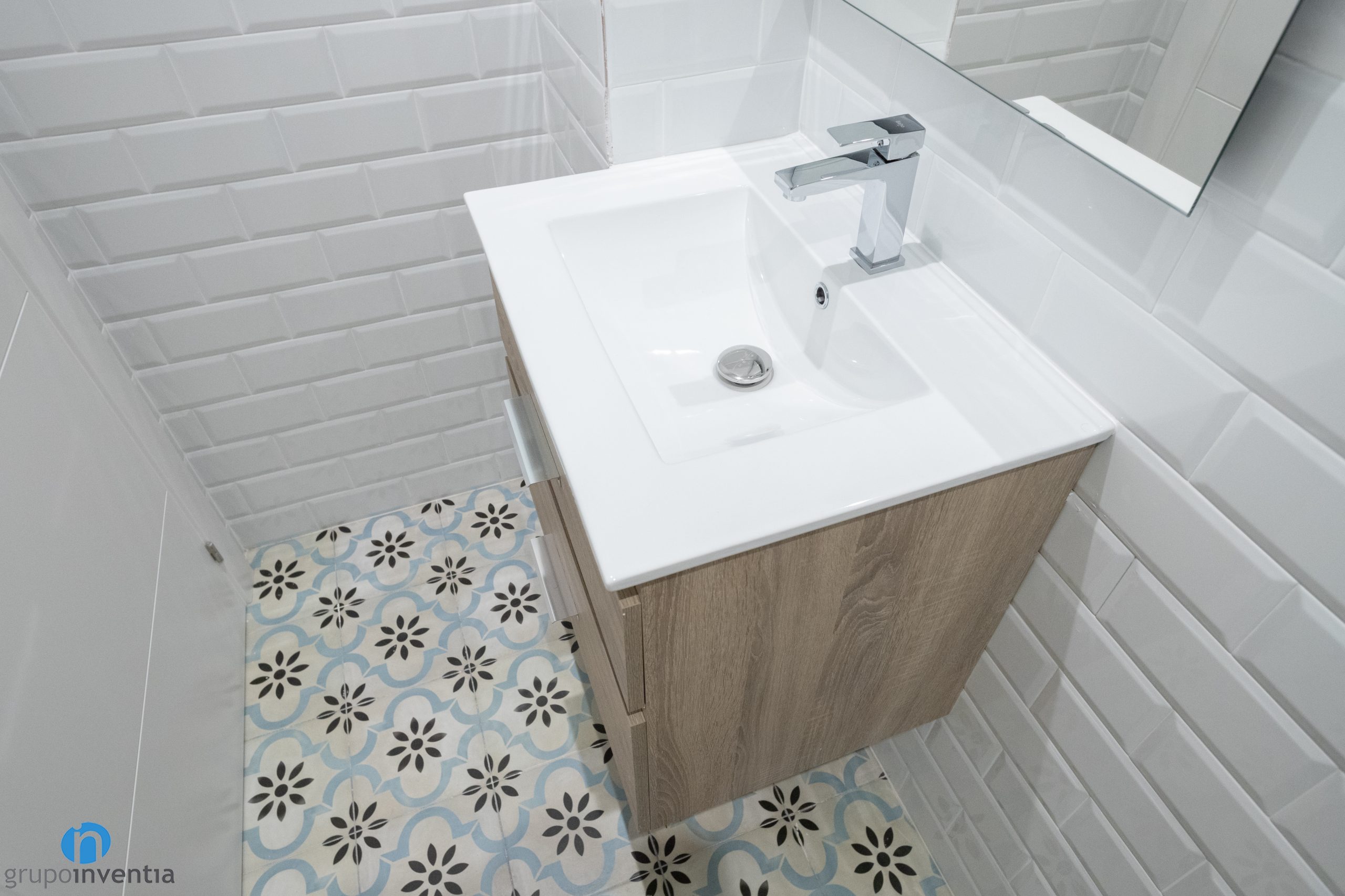 Per a la nova imatge també s’ha apostat per un disseny semblant i que respon a un estil contemporani. Les parets s’han enrajolat fins a mitja alçada amb rajoles bisellades blanques i s’ha pintat del mateix color la resta de la paret. També s’ha col·locat un terra tipus hidràulic que aporta personalitat a les dues cambres de bany.
