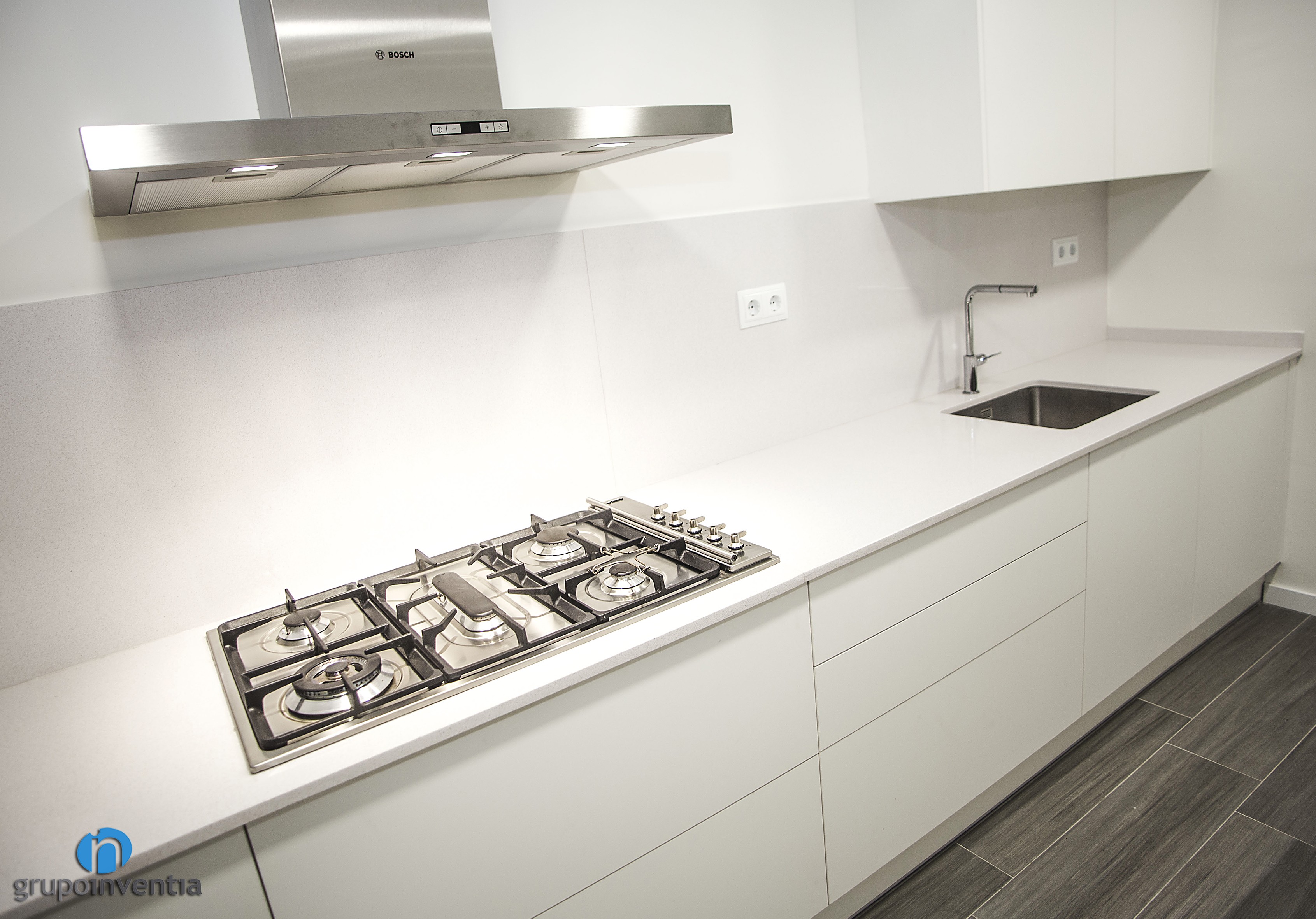 Pel que fa a la distribució, en aquesta reforma de cuina es va utilitzar una forma de L. A la part esquerra es va col·locar un allargat taulell que compta amb una pica individual i una cuina de cinc fogons. A la part del fons continua el moble i en ell es van encastar la resta de nous electrodomèstics.