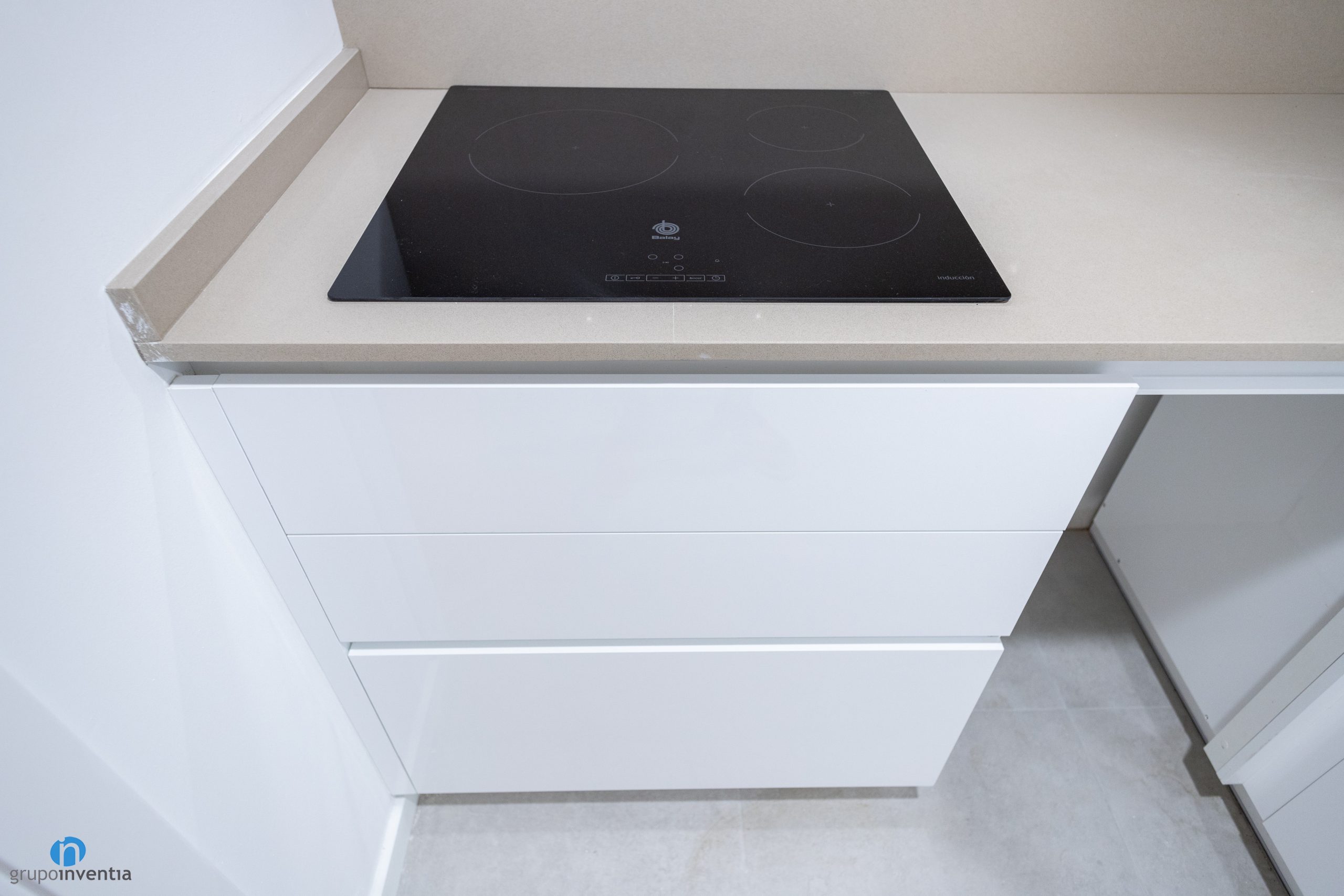 A la zona esquerra d’aquesta reforma de cuina s’ha disposat el moble principal. Es distribueix en forma de L i ofereix una mobilitat perfecta per a tot tipus de tasques a la cuina. El taulell de color beige aporta una àmplia superfície de suport i de treball. En el tram de l’esquerra s’ha instal·lat una placa vitroceràmica, mentre que en el de la dreta s’ha col·locat l’aigüera.