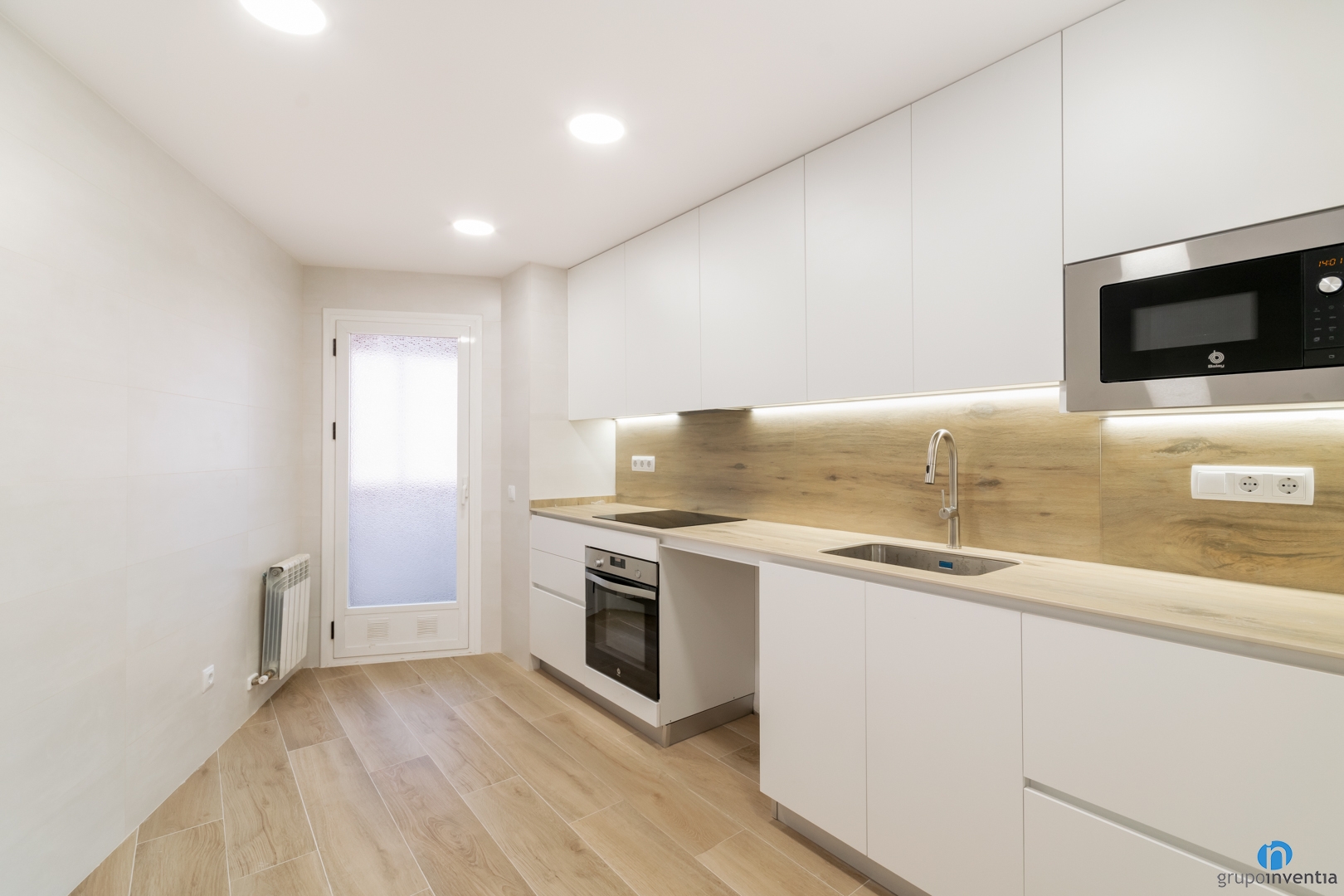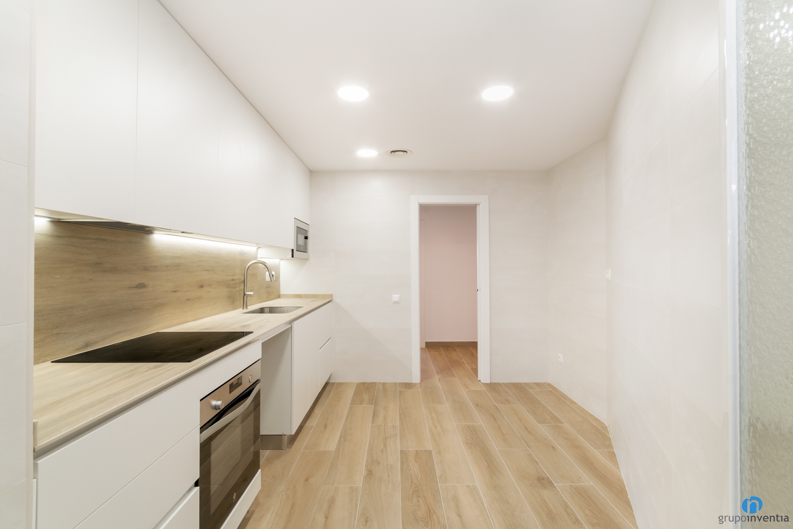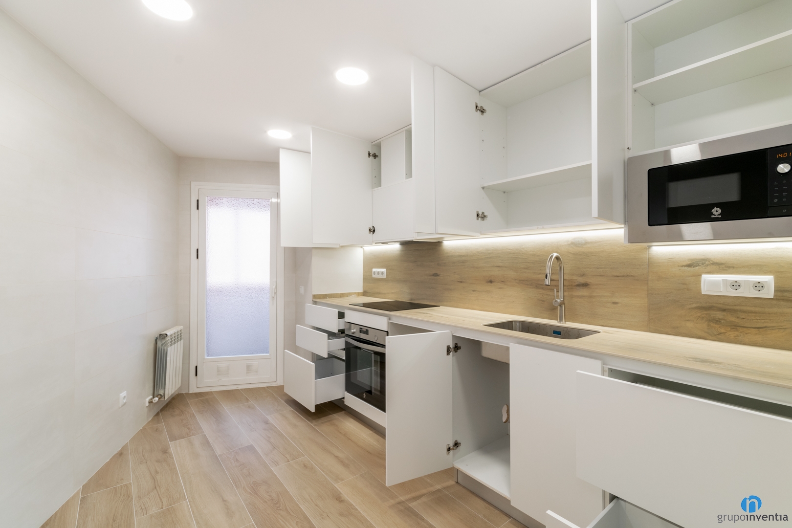 La cuina és un espai independent al saló. Està distribuïda amb un sol lineal on trobem la zona de treball i electrodomèstics nous instal·lats. El disseny està pensat per garantir la màxima capacitat d’emmagatzematge i practicitat en el seu ús. El paviment és continu al de la resta de l’habitatge, i s’ha col·locat un taulell de porcelànic que busca la mateixa tonalitat de colors i textures. La resta de mobiliari de cuina és de color blanc, que busca donar amplitud a la cuina alhora que garantir un estil atemporal.