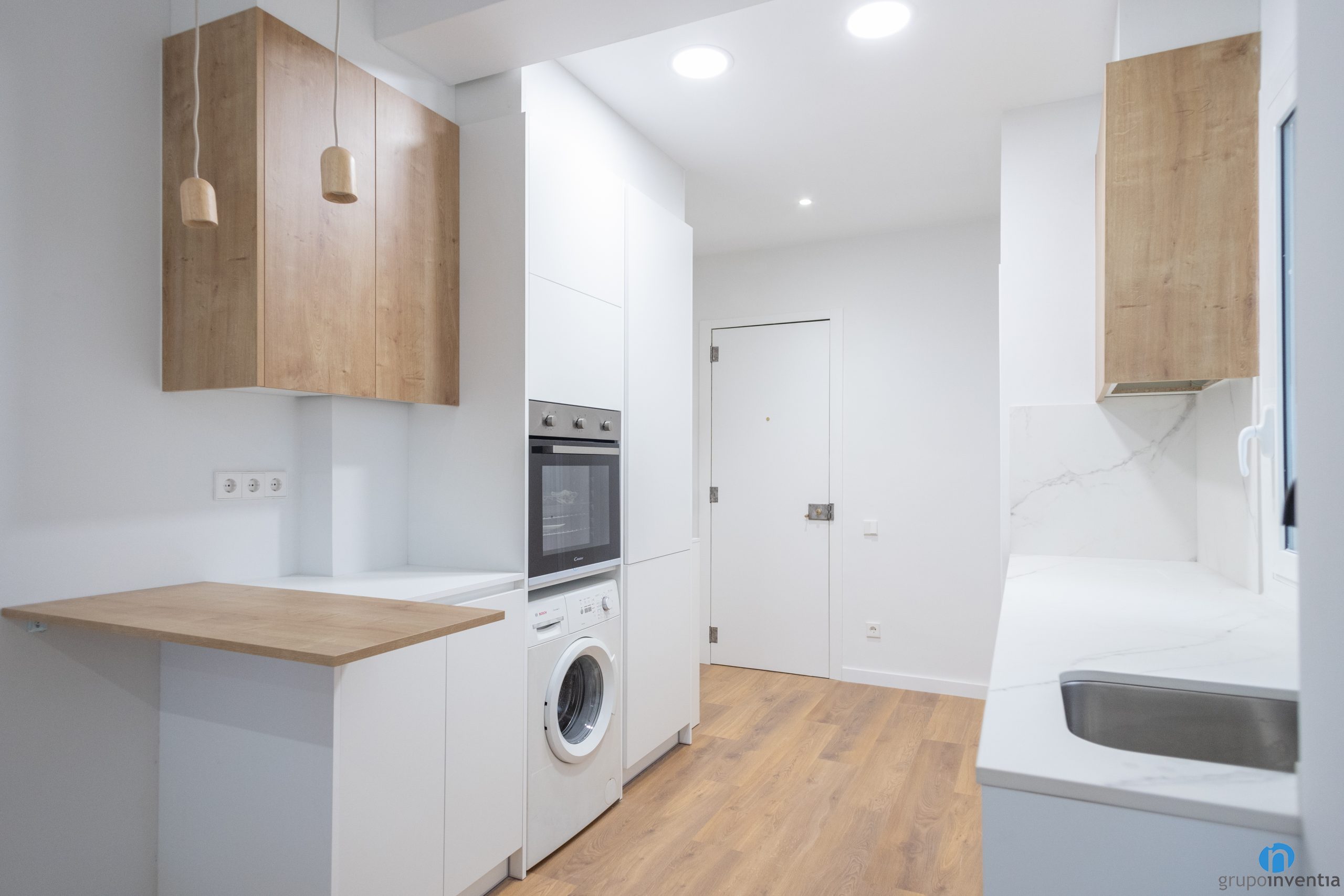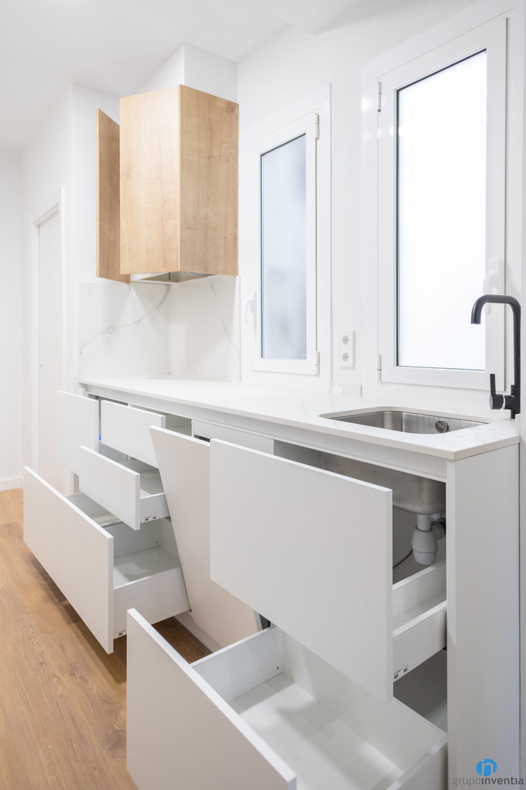 A la dreta d’aquesta reforma de cuina s’ha col·locat un taulell equipat amb una pica d’un si. També ofereix una àmplia superfície de pedrís i de treball. De la mateixa manera compta amb diversos calaixos i armaris per a l’emmagatzematge a la zona inferior.